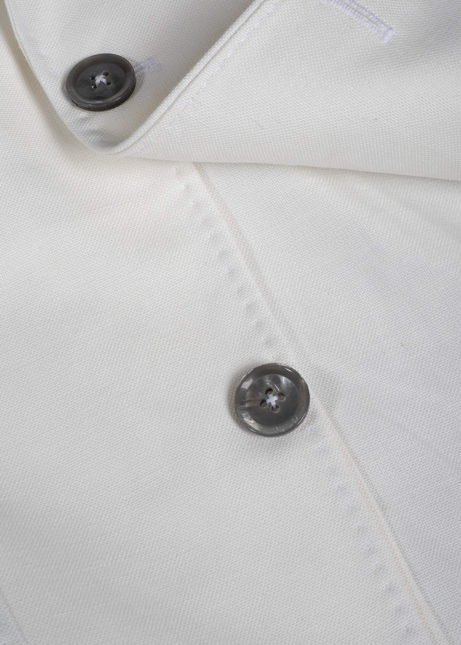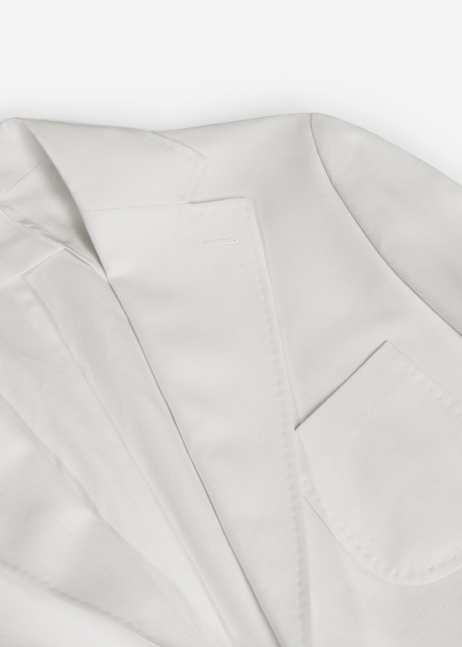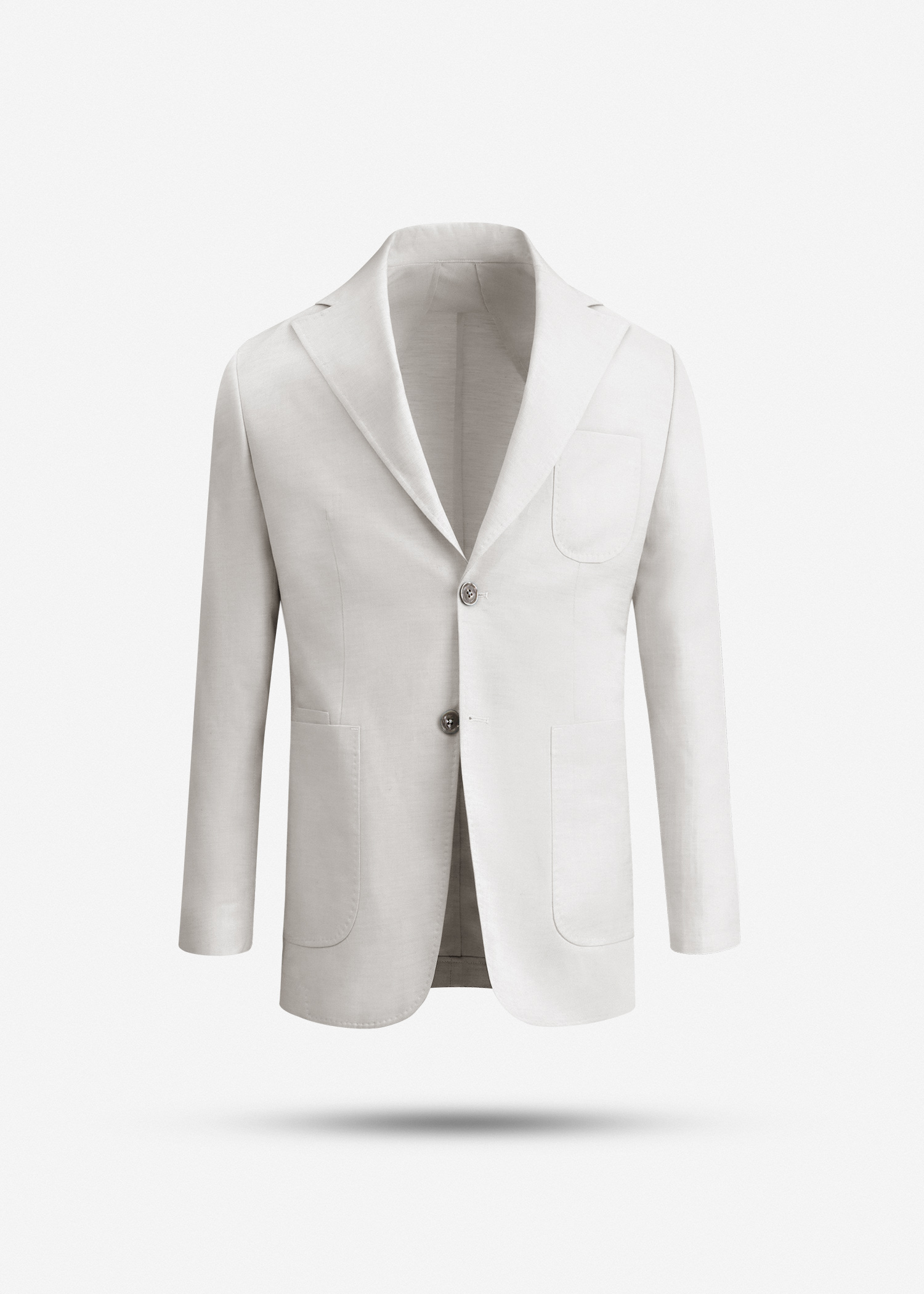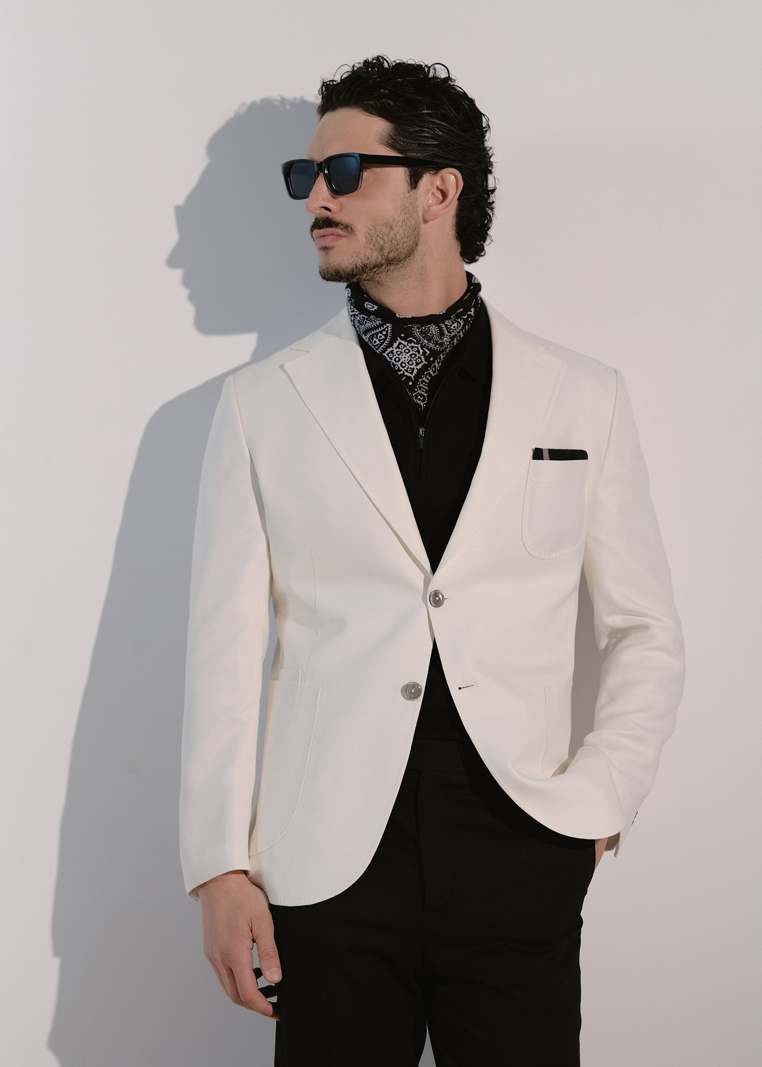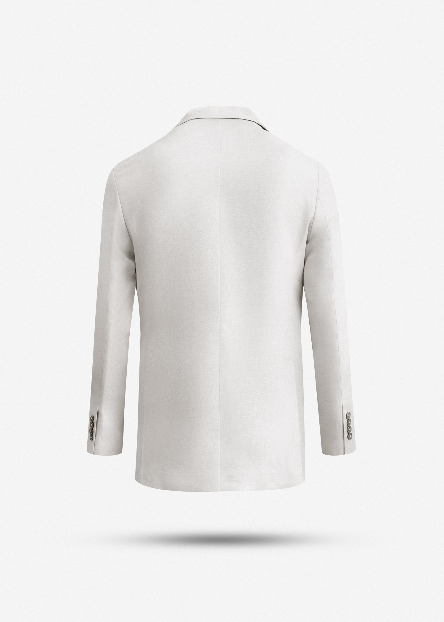 کت دو دکمه لینن، دو چاک در پشت، دارای دو جیب پاکتی و یک جیب روی سینه جهت استفاده از پوشت، بدون آستر