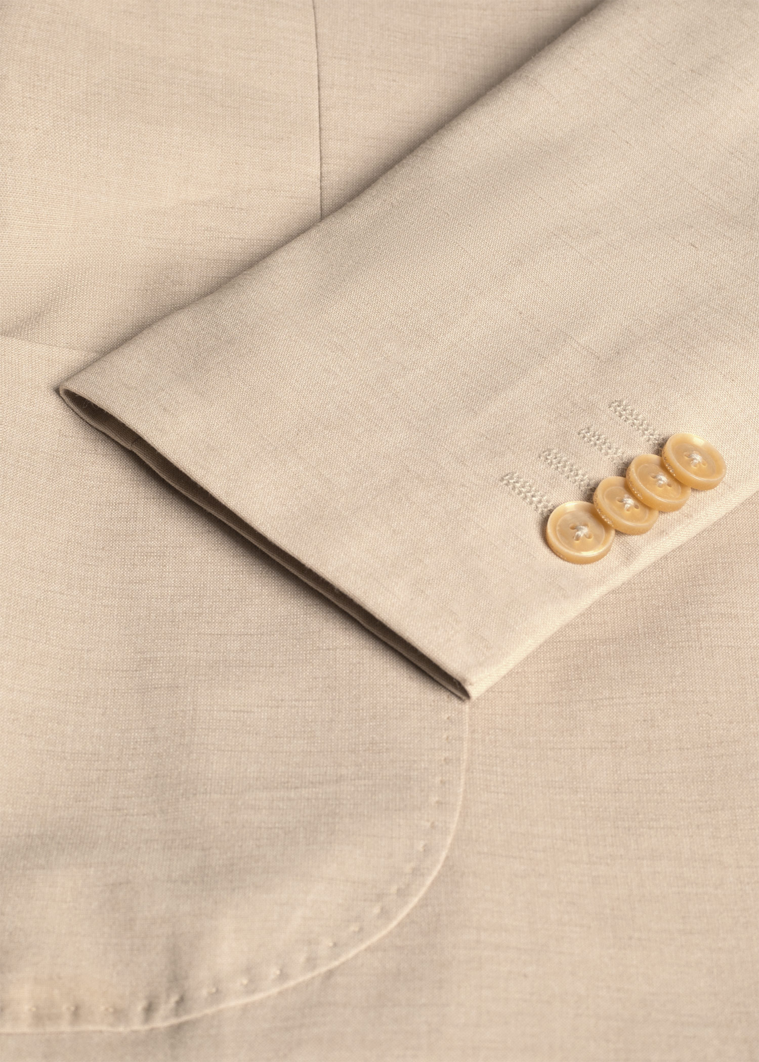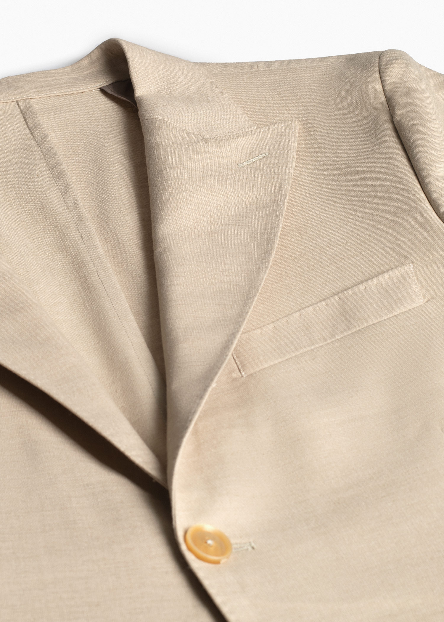 کت تک دو دکمه، دو چاک در پشت، دارای دوخت تزئینی بانتو، دارای دو جیب قایقی روکار و  جیب های داخلی و یک جیب روی سینه جهت استفاده از پوشت، طراحی به صورت نیمه آستر