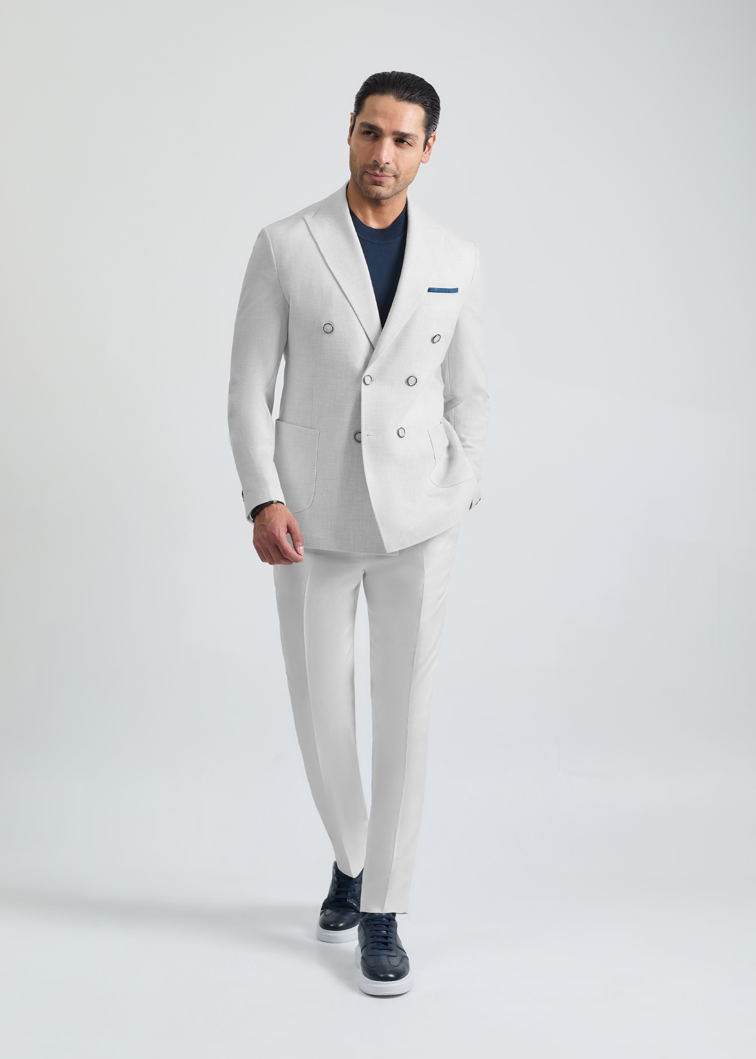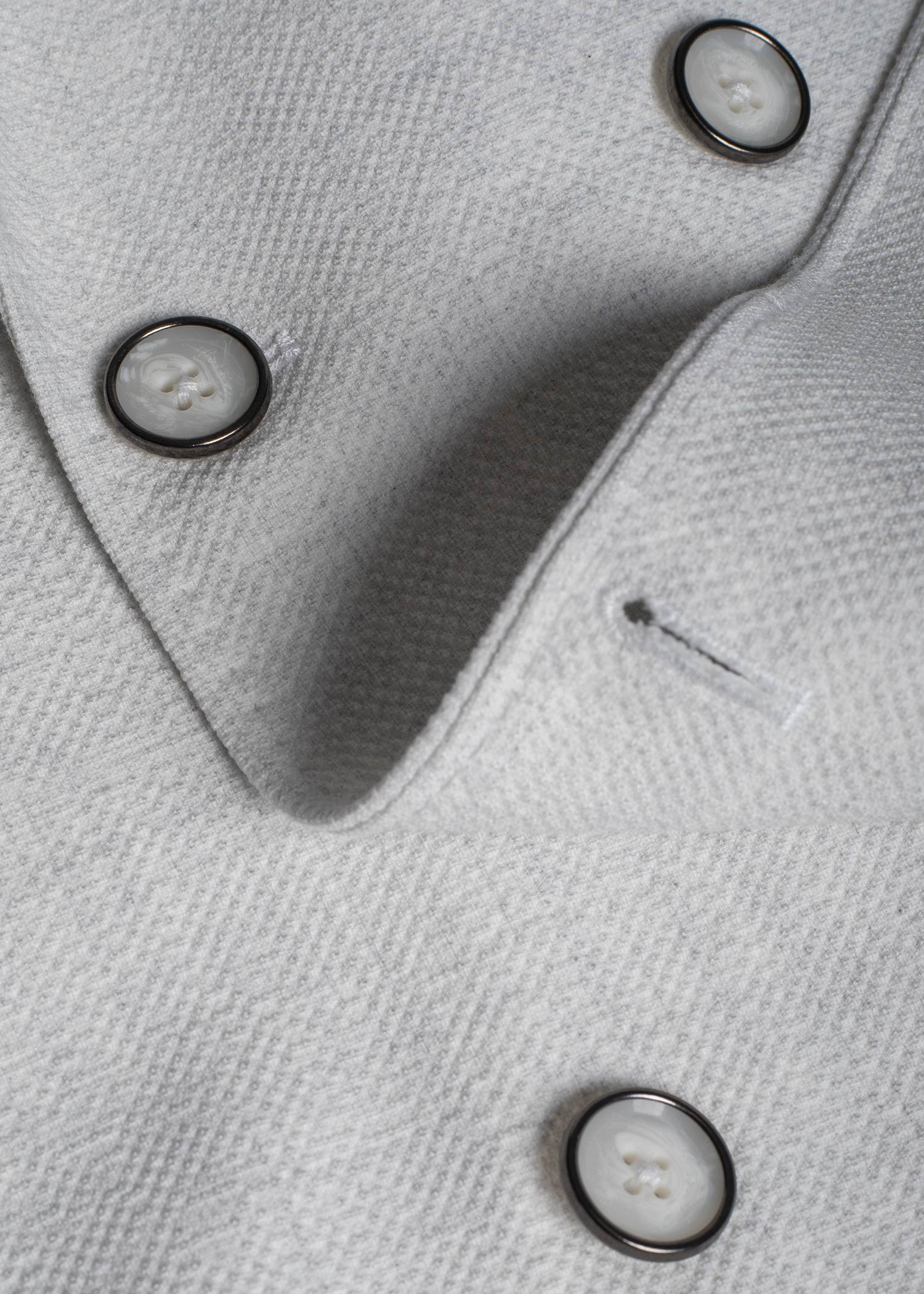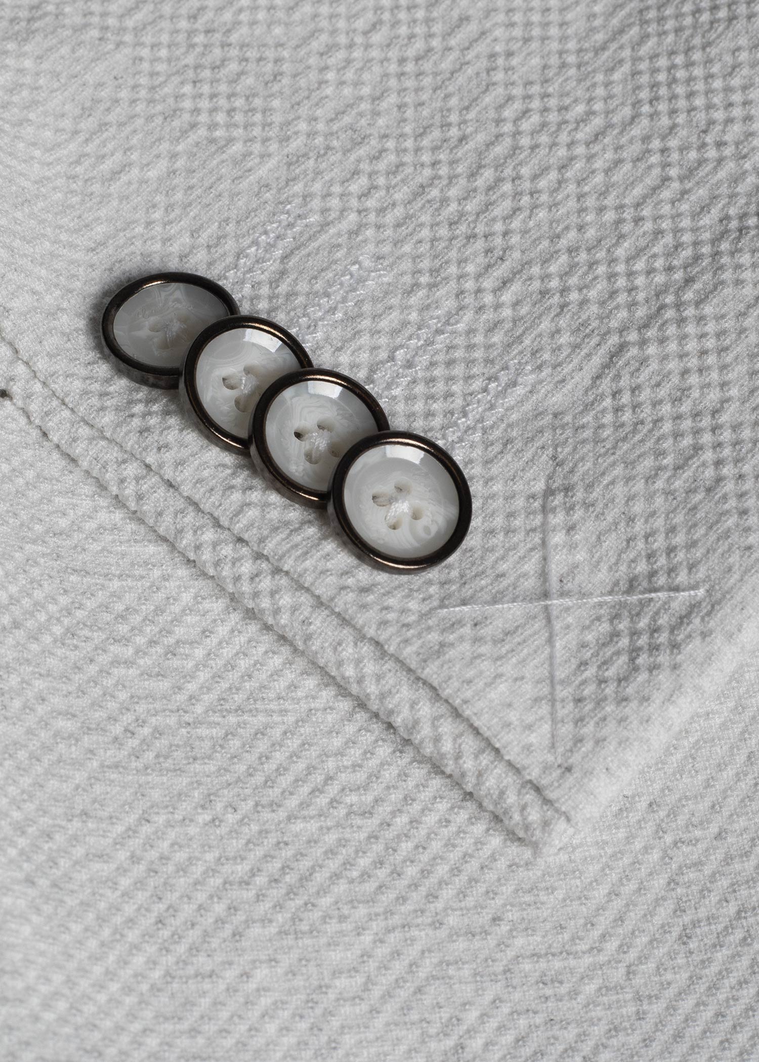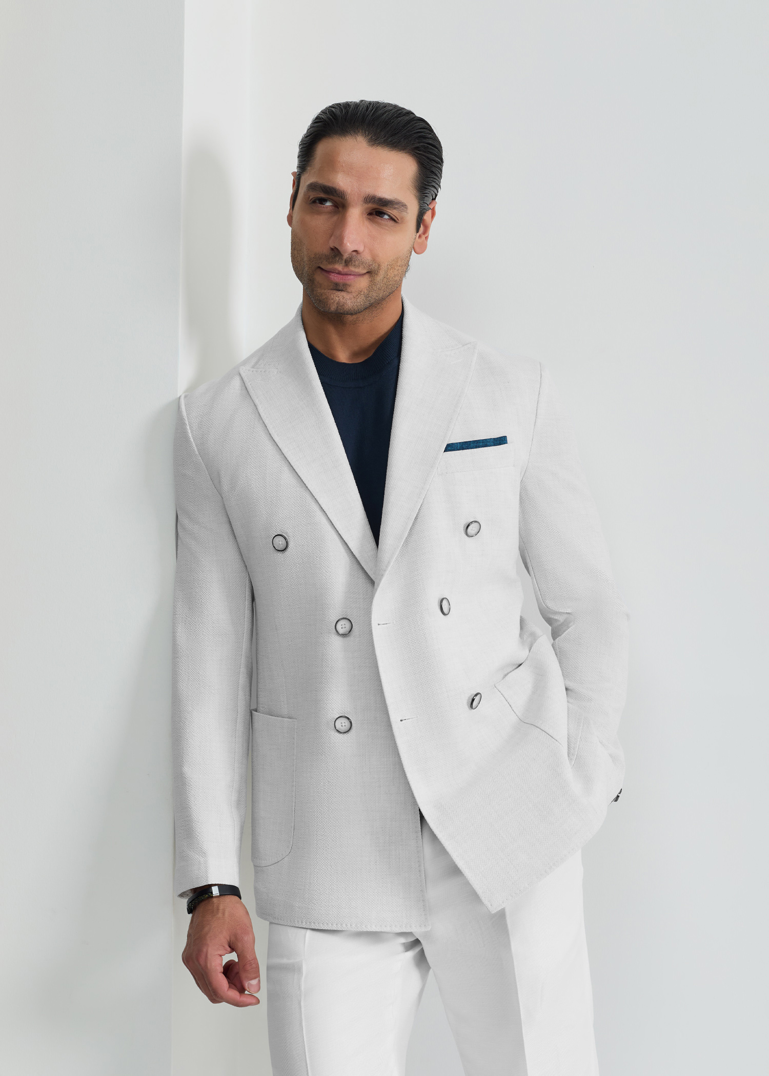 کت تک دبل برست، دو چاک در پشت، دارای جیب روی پیش سینه جهت استفاده از پوشت، بدون آستر