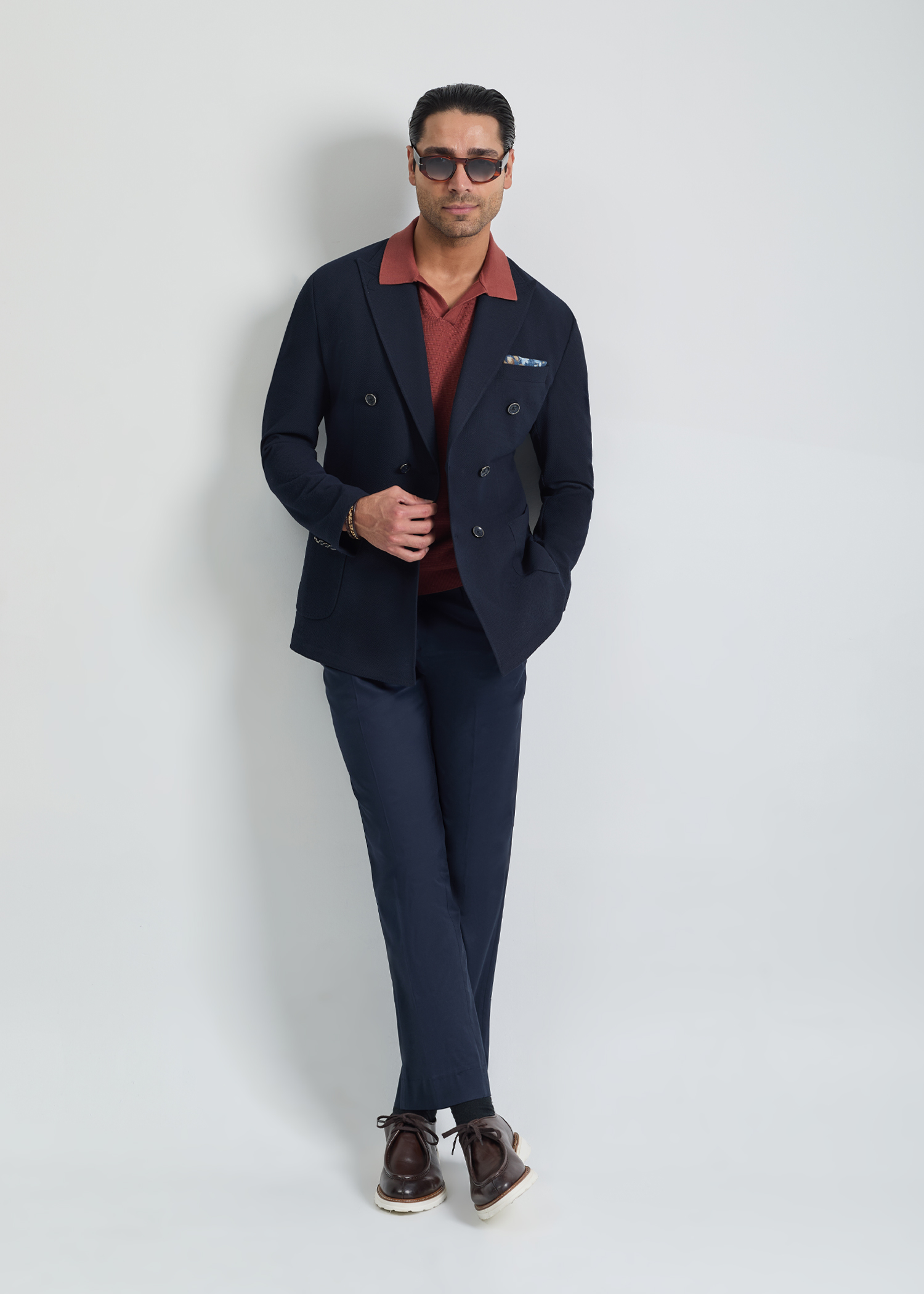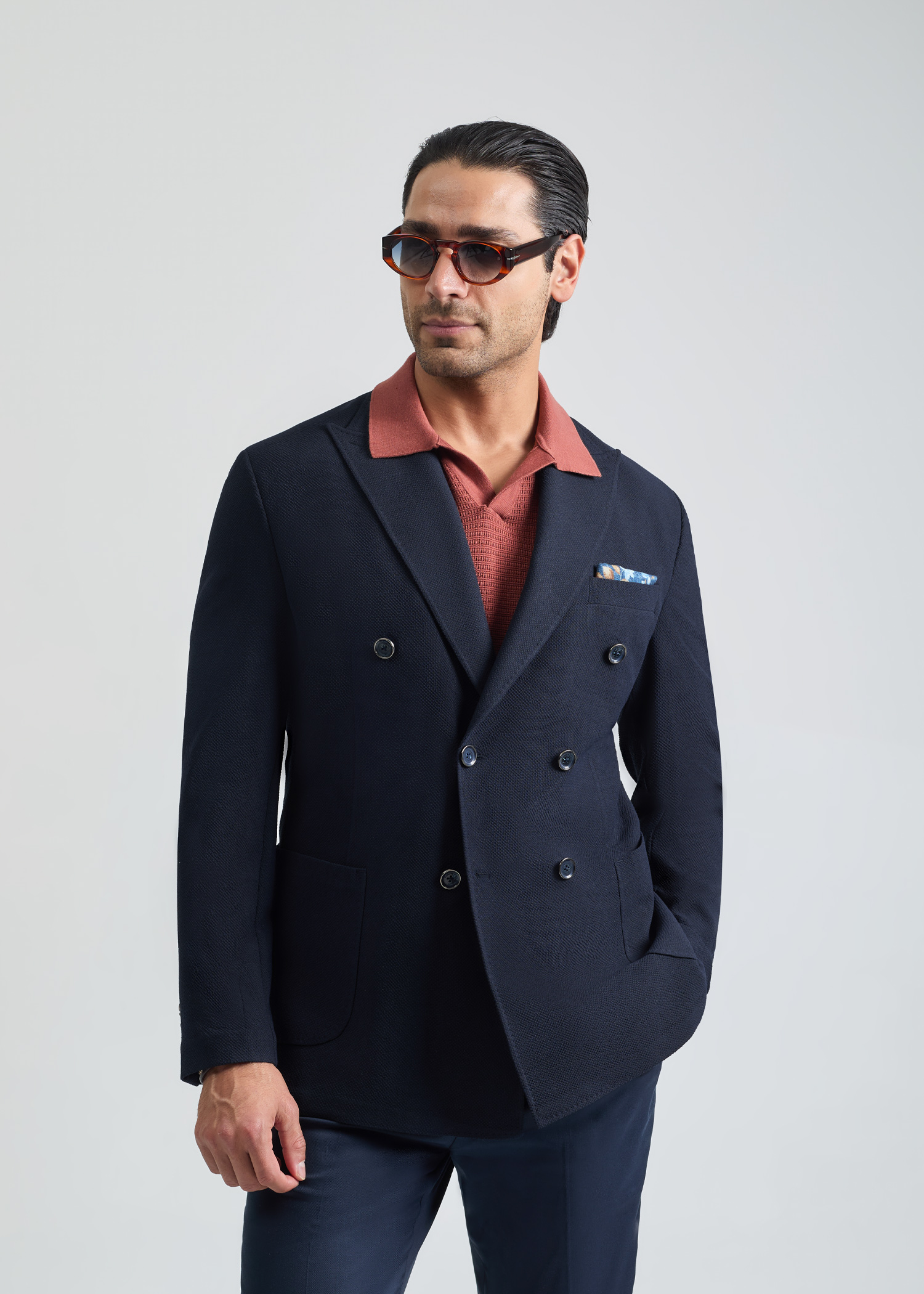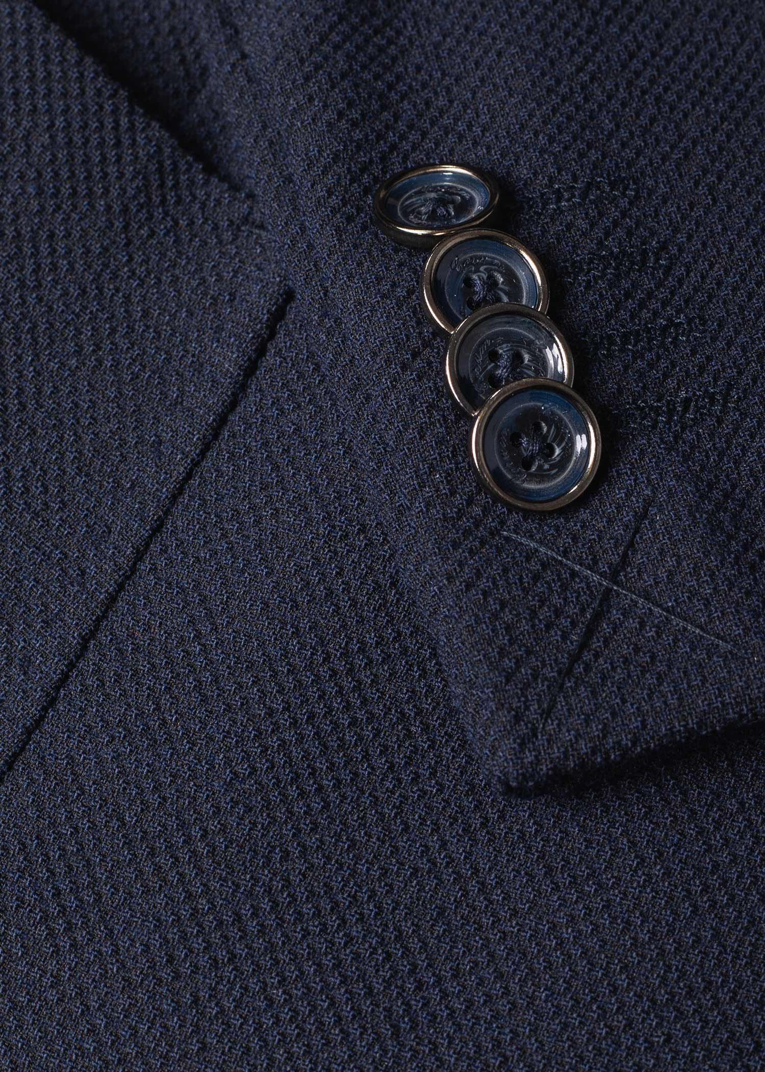 کت تک دبل برست، دو چاک در پشت، دارای جیب روی پیش سینه جهت استفاده از پوشت، بدون آستر