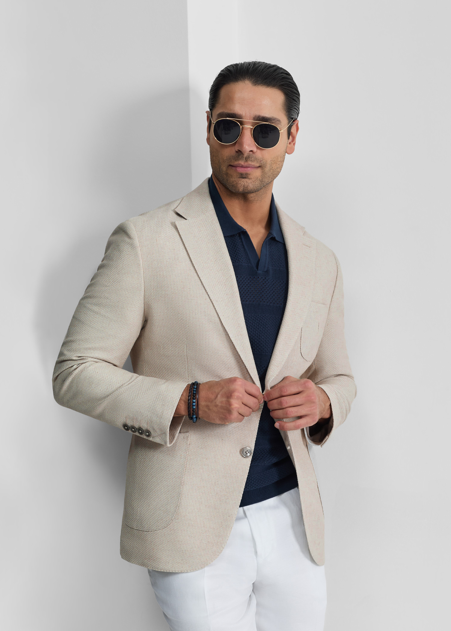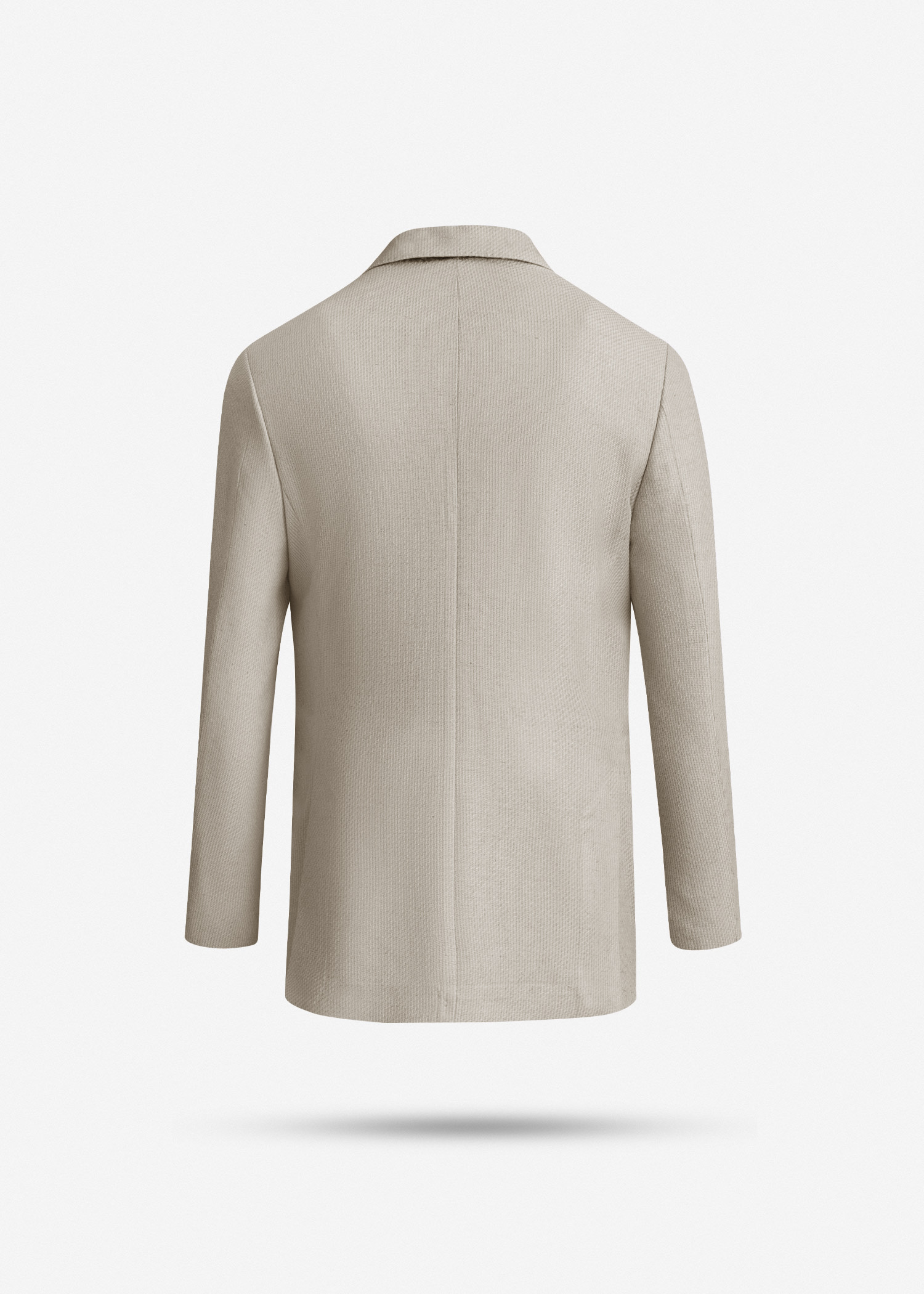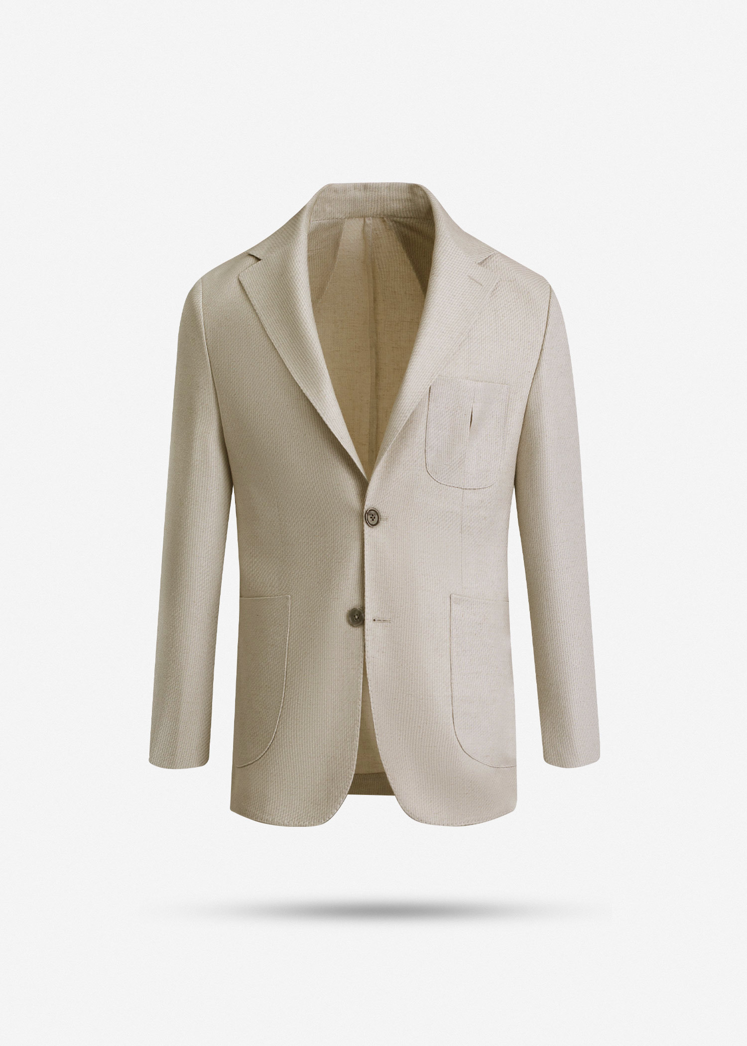 کت دو دکمه، دو چاک در پشت، دارای دو جیب پاکتی و یک جیب روی پیش سینه جهت استفاده از پوشت، بدون آستر
