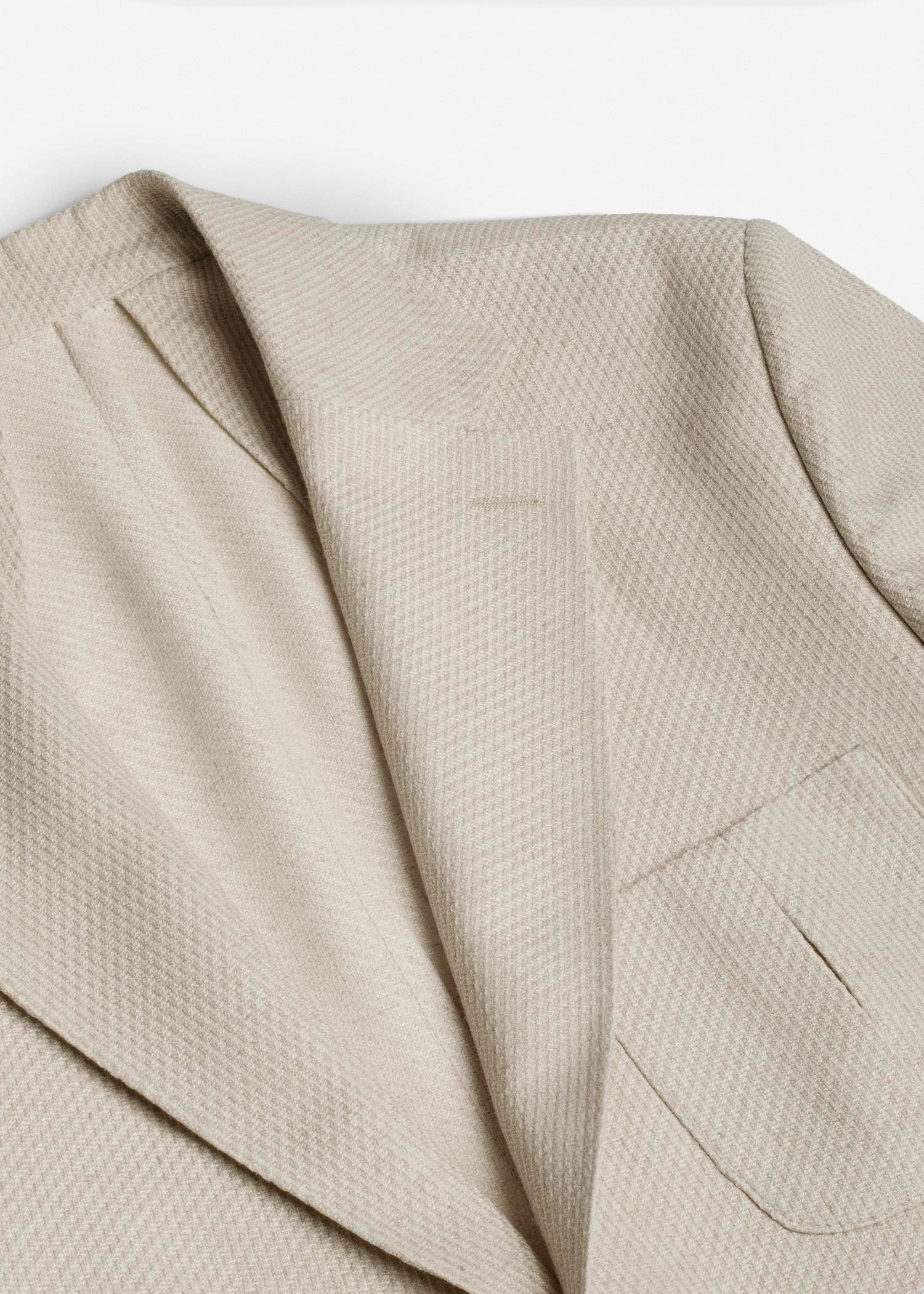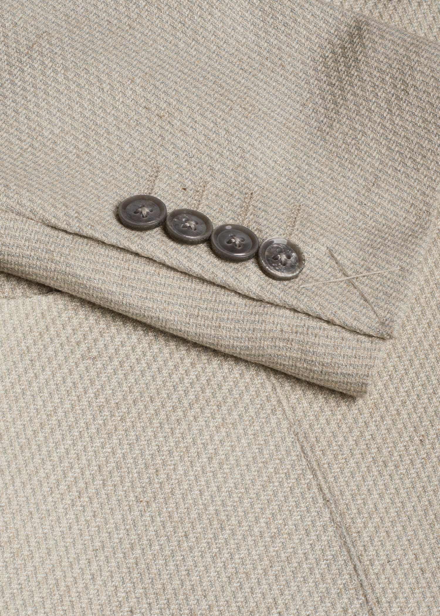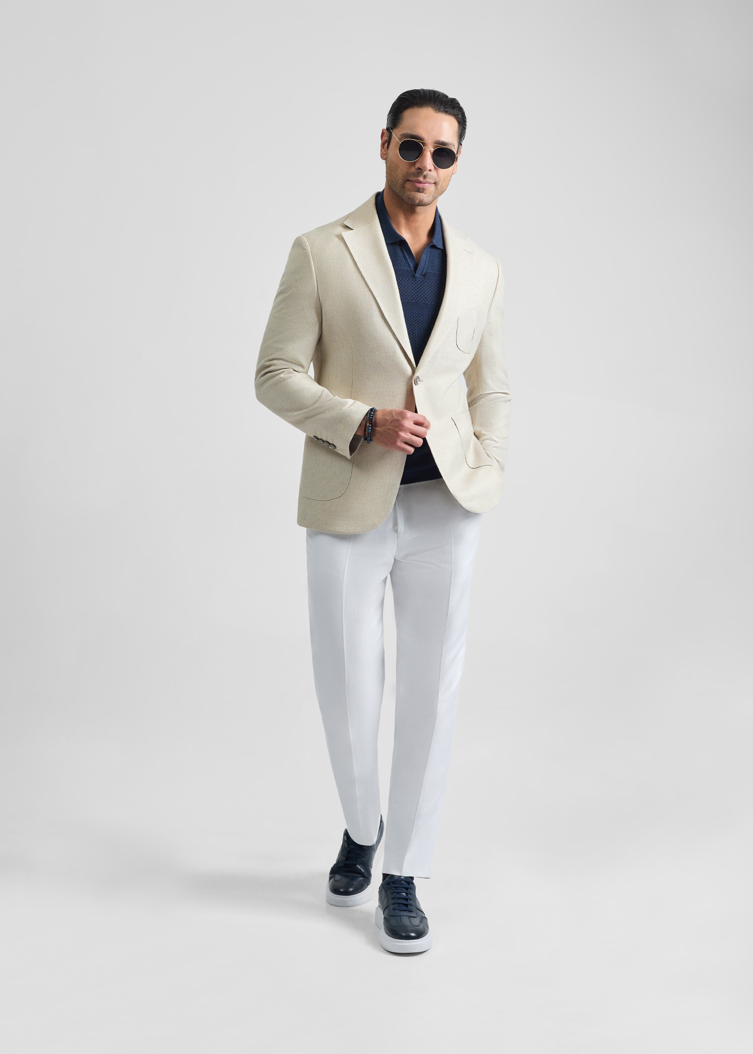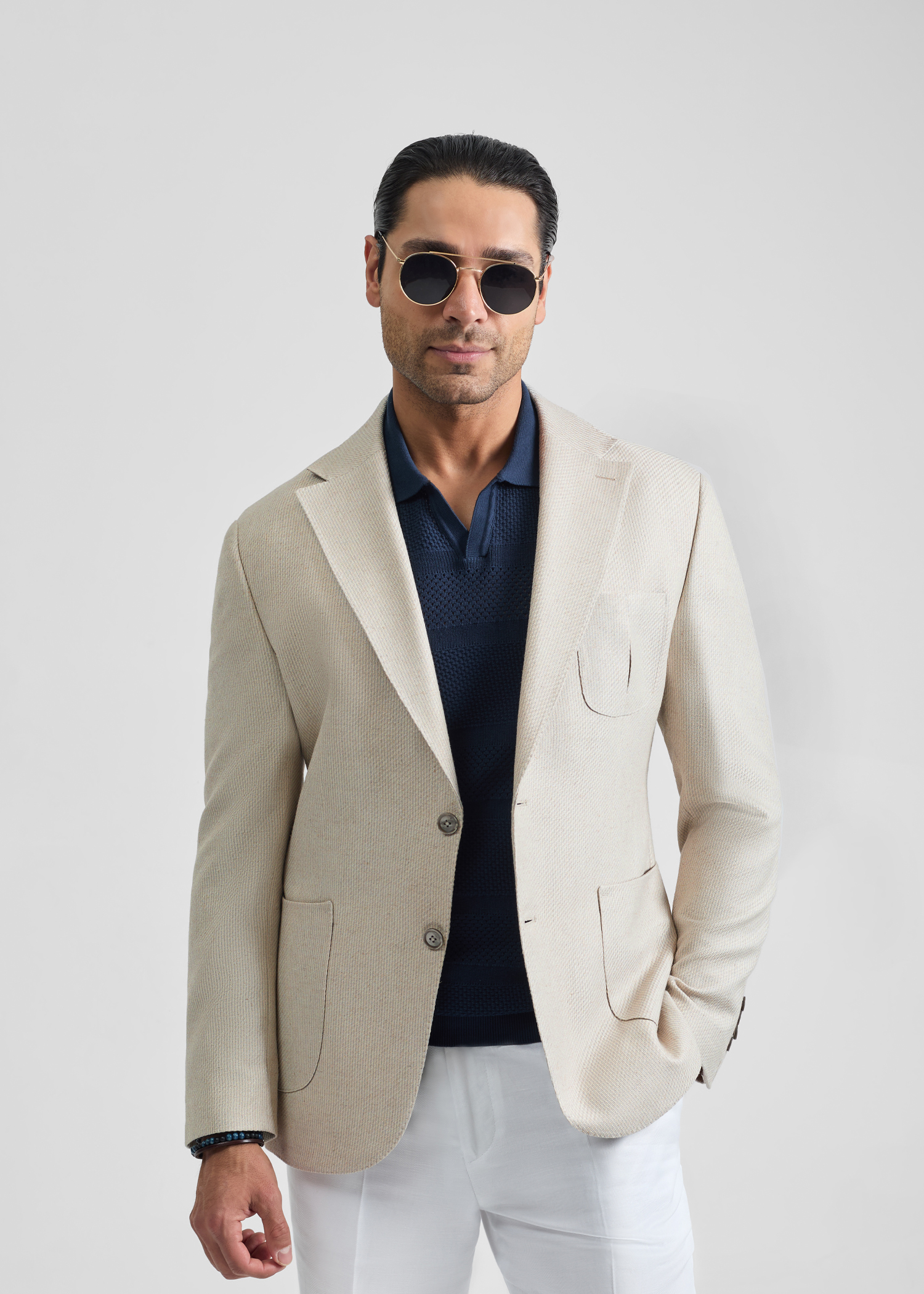 کت دو دکمه، دو چاک در پشت، دارای دو جیب پاکتی و یک جیب روی پیش سینه جهت استفاده از پوشت، بدون آستر