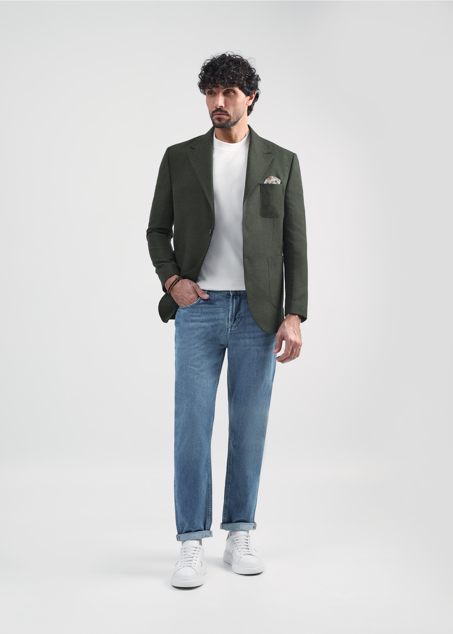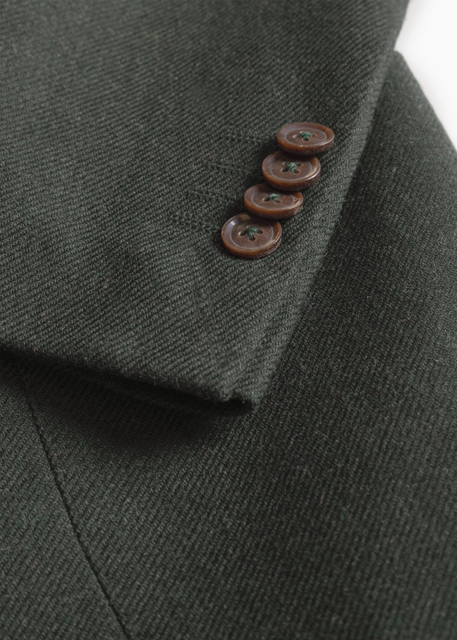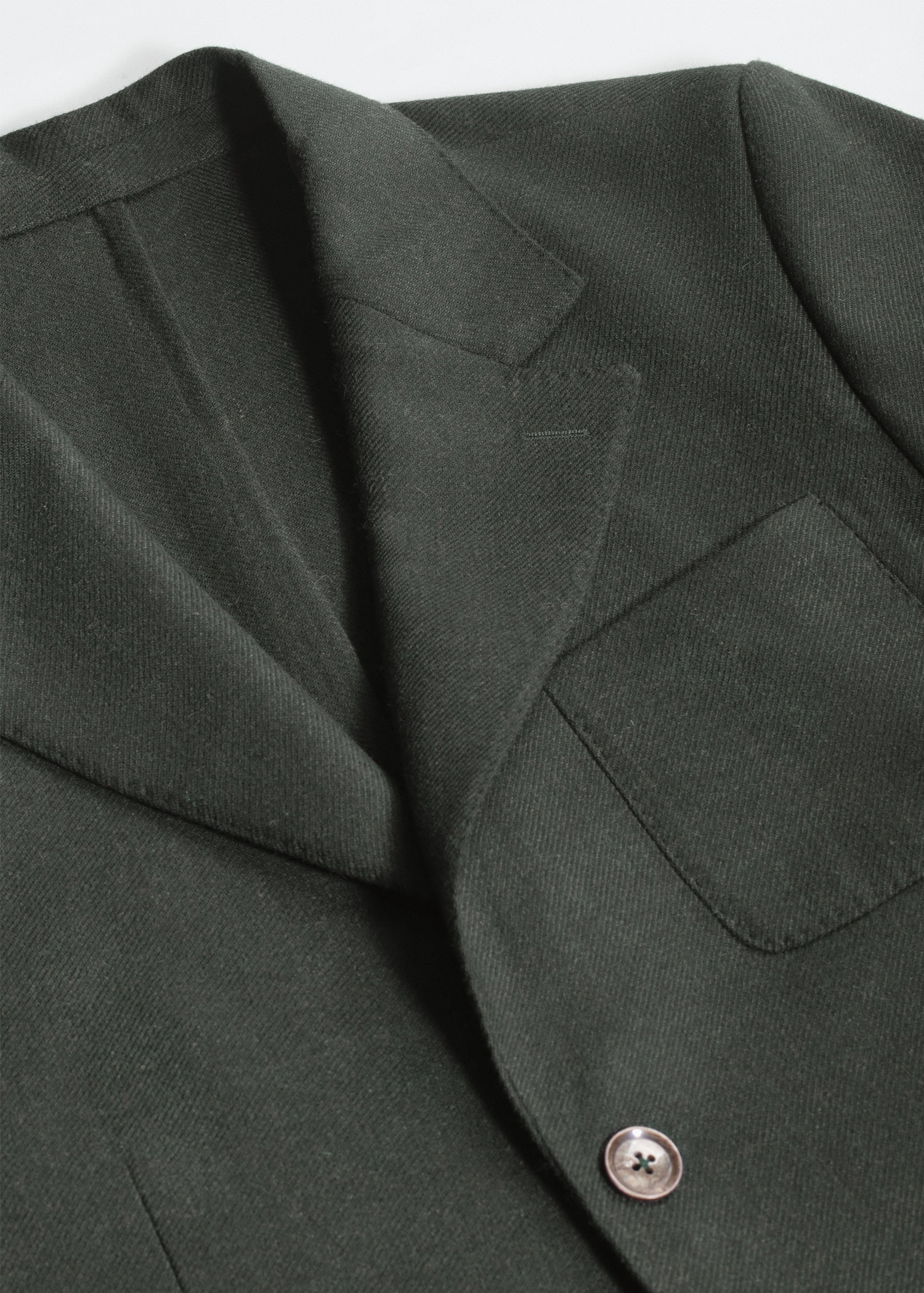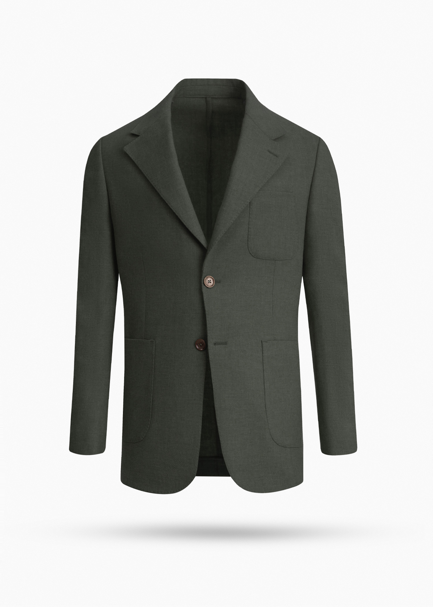 کت تک دو دکمه، دارای دوخت تزئینی بانتو، دو چاک در پشت، دارای دو جیب پاکتی و سه جیب داخلی، طراحی به صورت بدون آستر