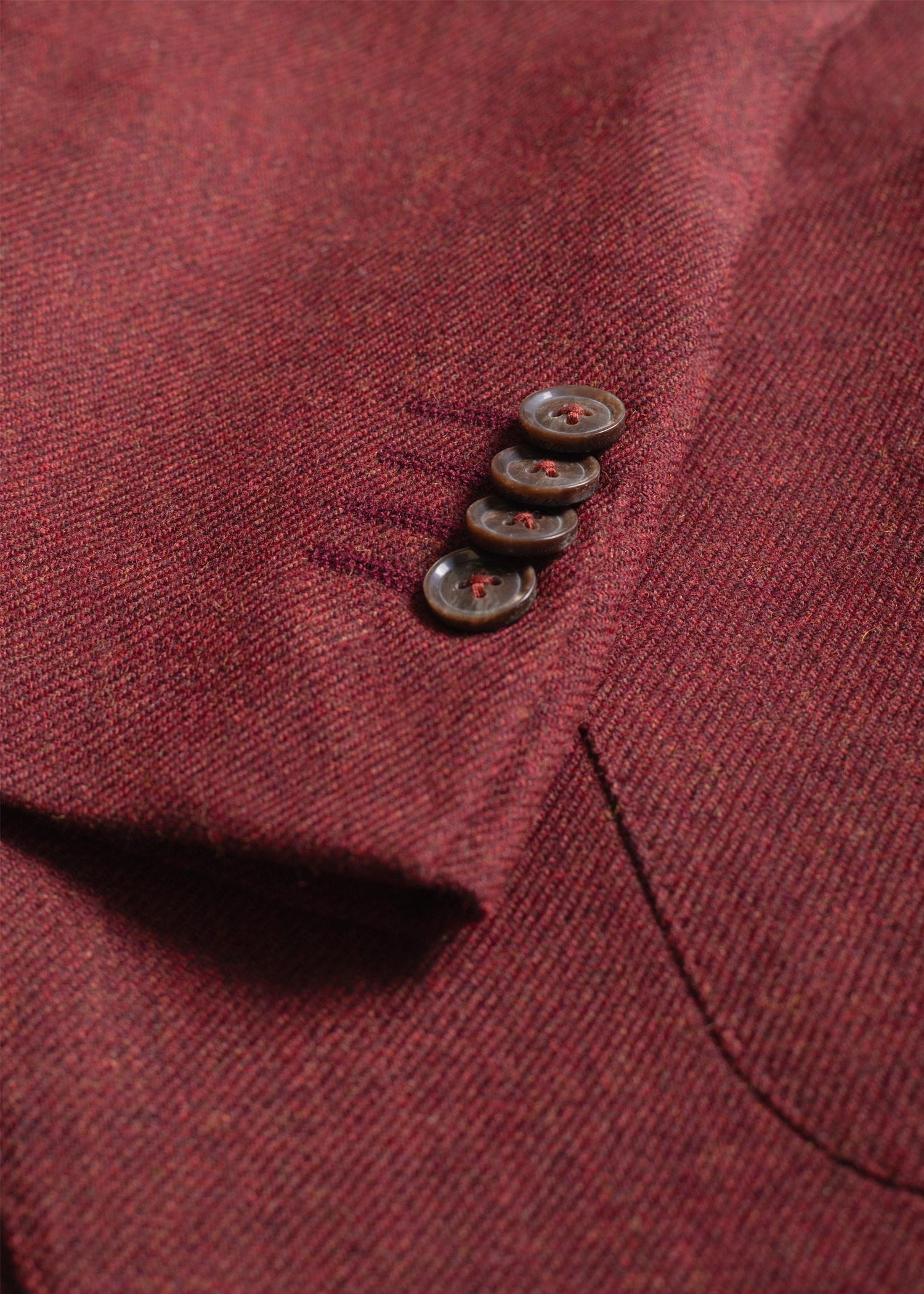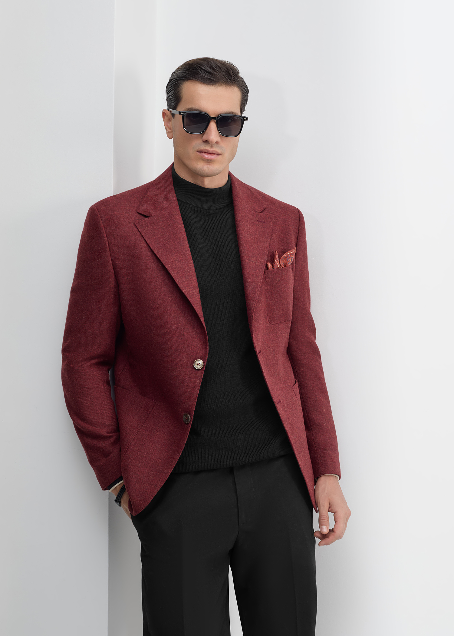 کت تک دو دکمه، دارای دوخت تزئینی بانتو، دو چاک در پشت، دارای دو جیب پاکتی و سه جیب داخلی، طراحی به صورت بدون آستر