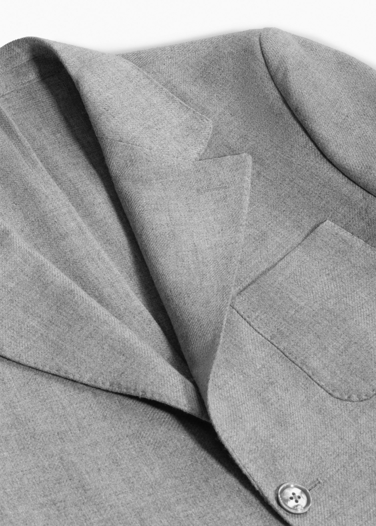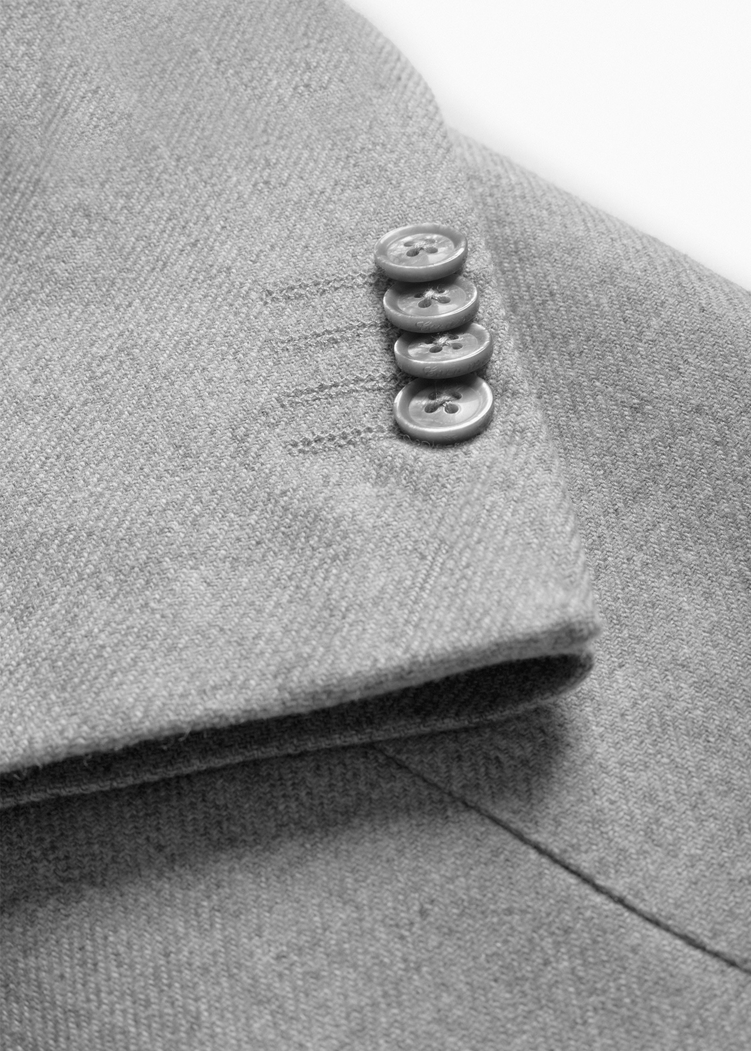 کت تک دو دکمه، دارای دوخت تزئینی بانتو، دو چاک در پشت، دارای دو جیب پاکتی و سه جیب داخلی، طراحی به صورت بدون آستر