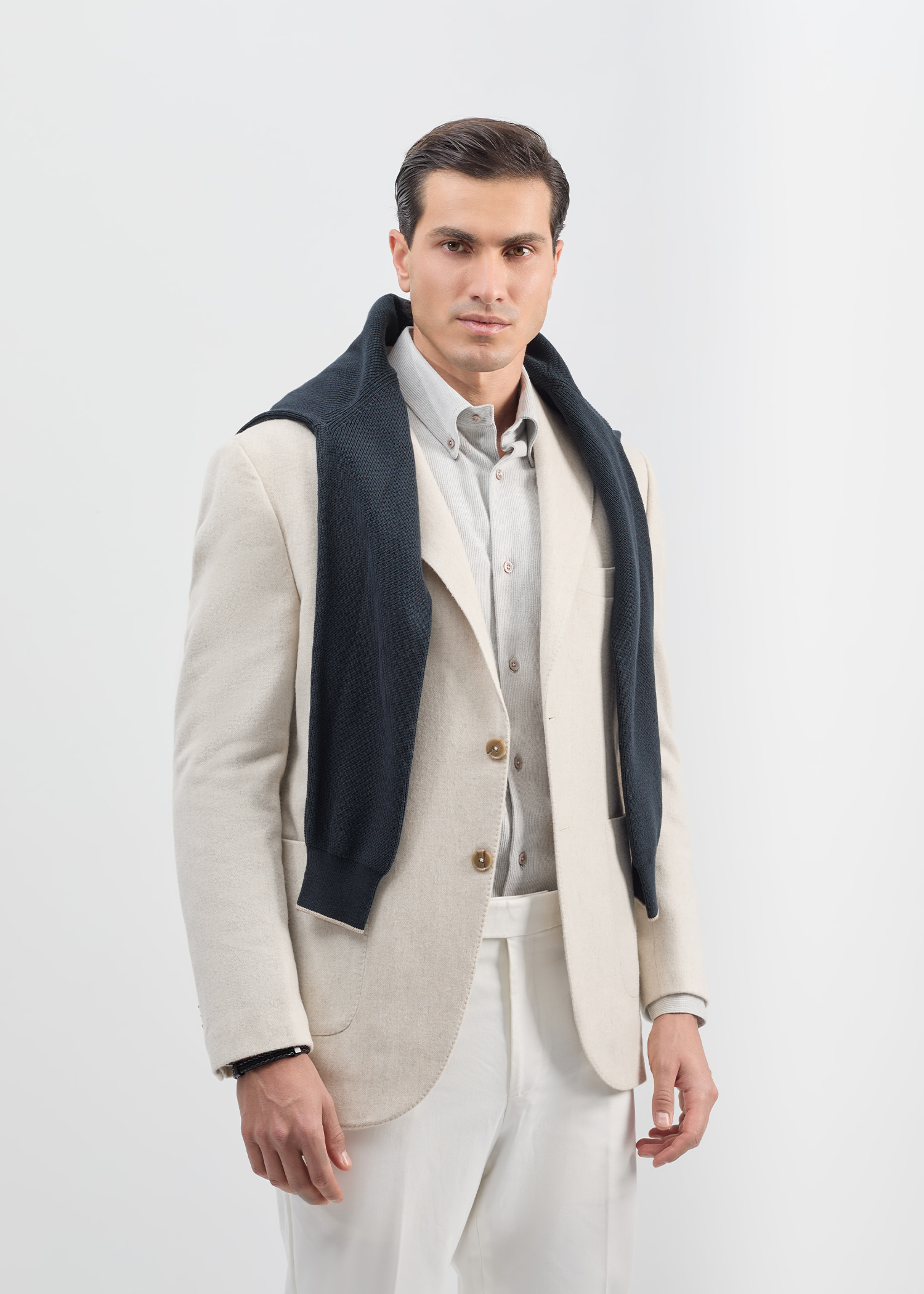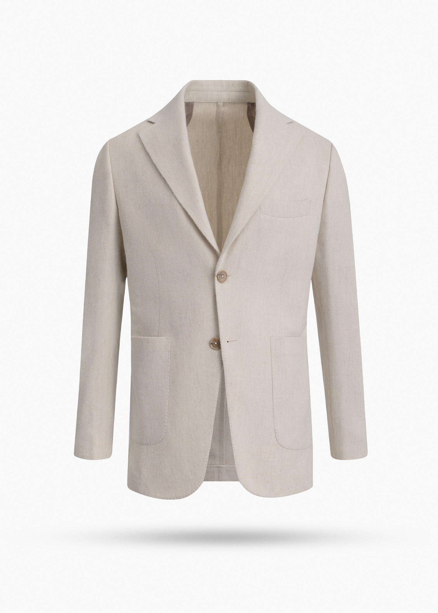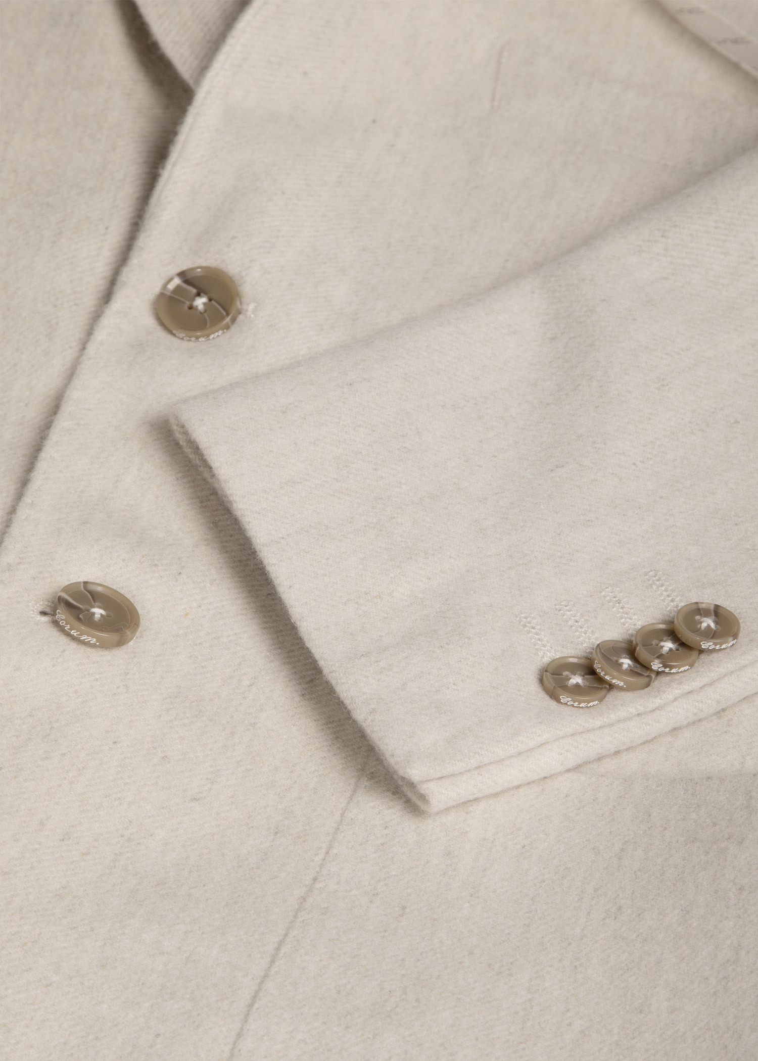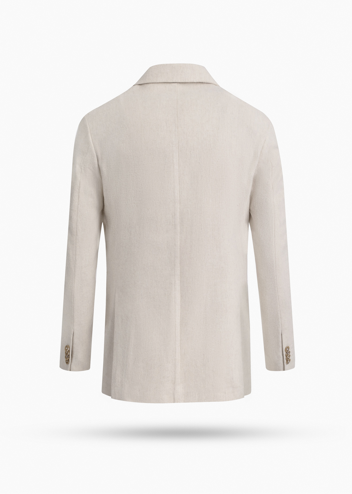 کت تک دو دکمه، دارای دوخت تزئینی بانتو، دو چاک در پشت، دارای جیب قایقی روکار، جیب‌های داخلی، طراحی به صورت بدون آستر