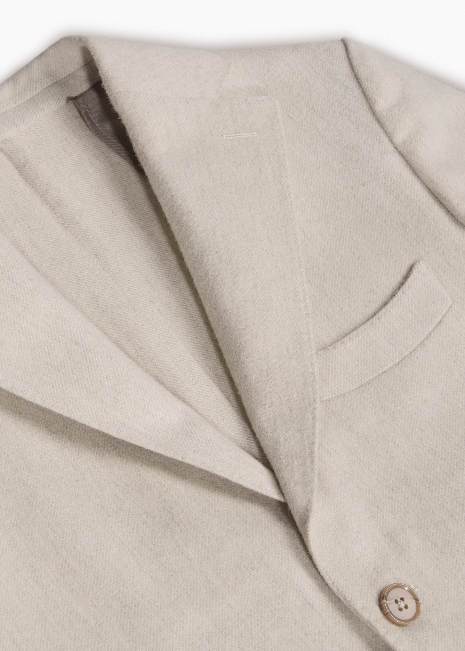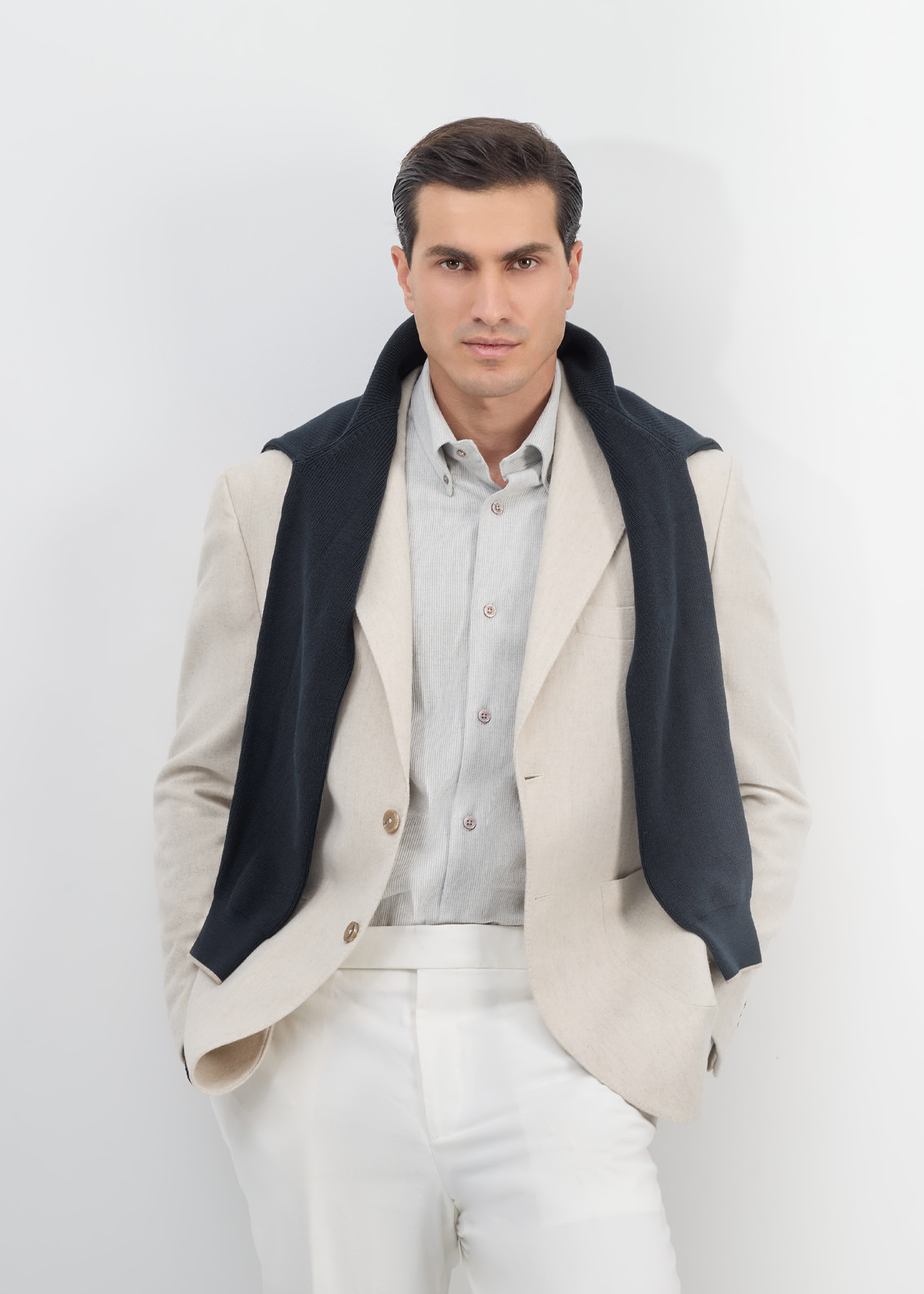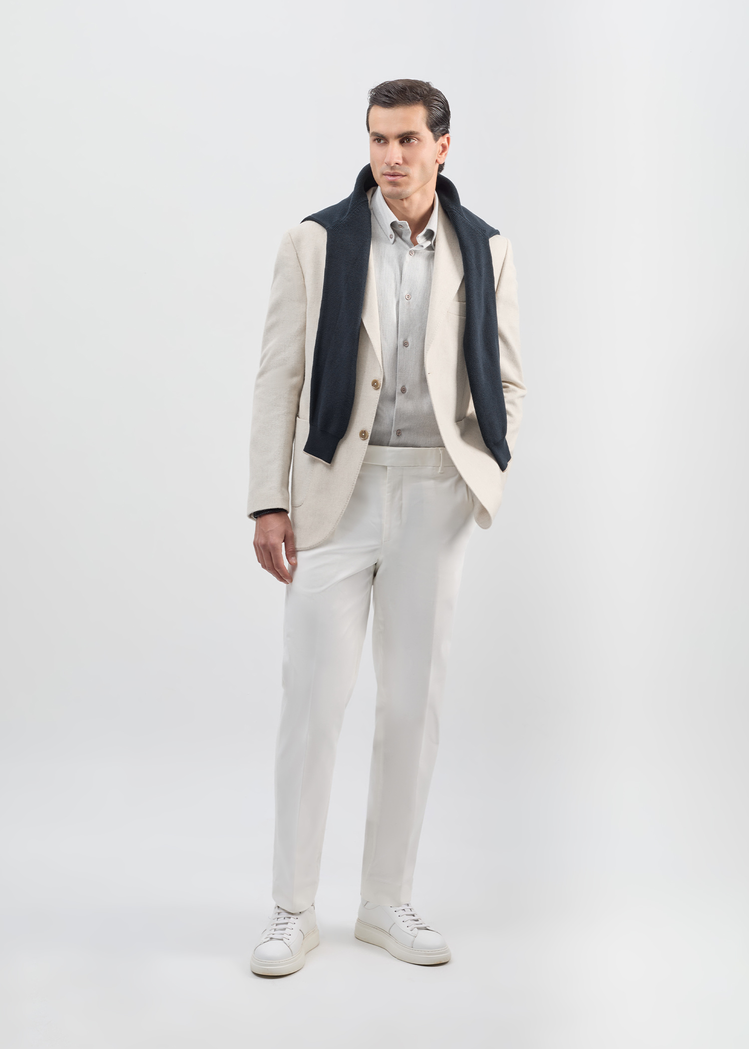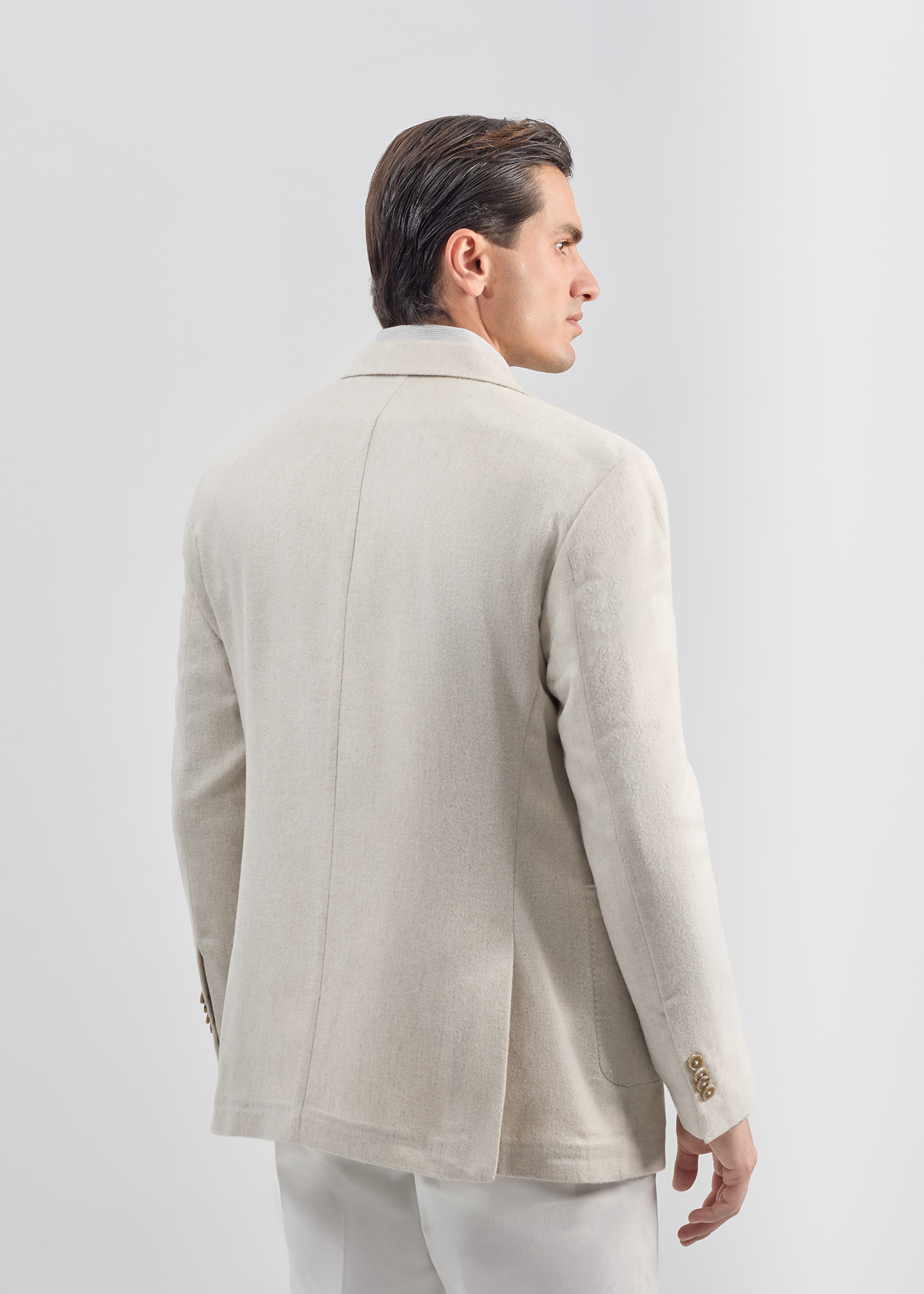 کت تک دو دکمه، دارای دوخت تزئینی بانتو، دو چاک در پشت، دارای جیب قایقی روکار، جیب‌های داخلی، طراحی به صورت بدون آستر