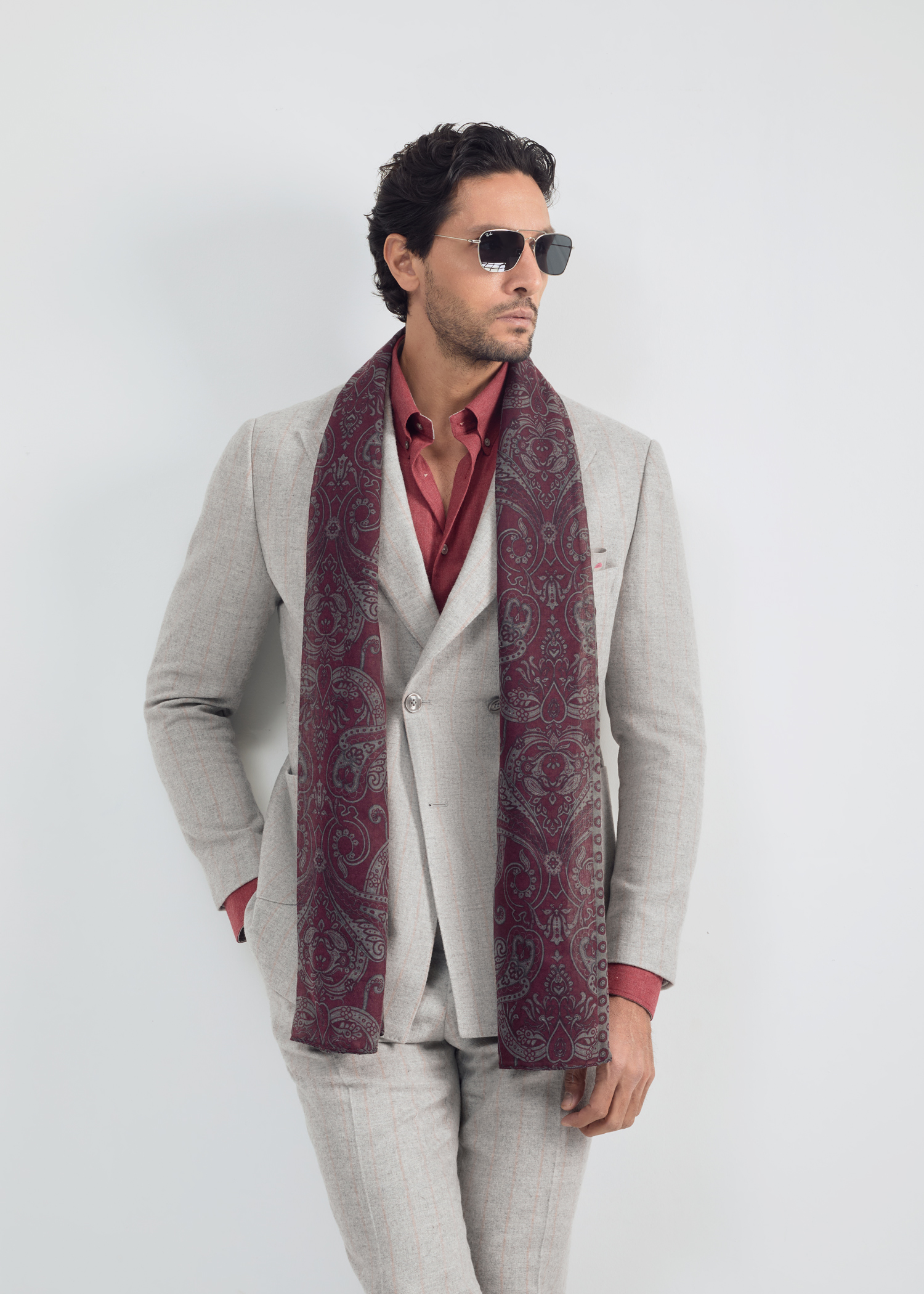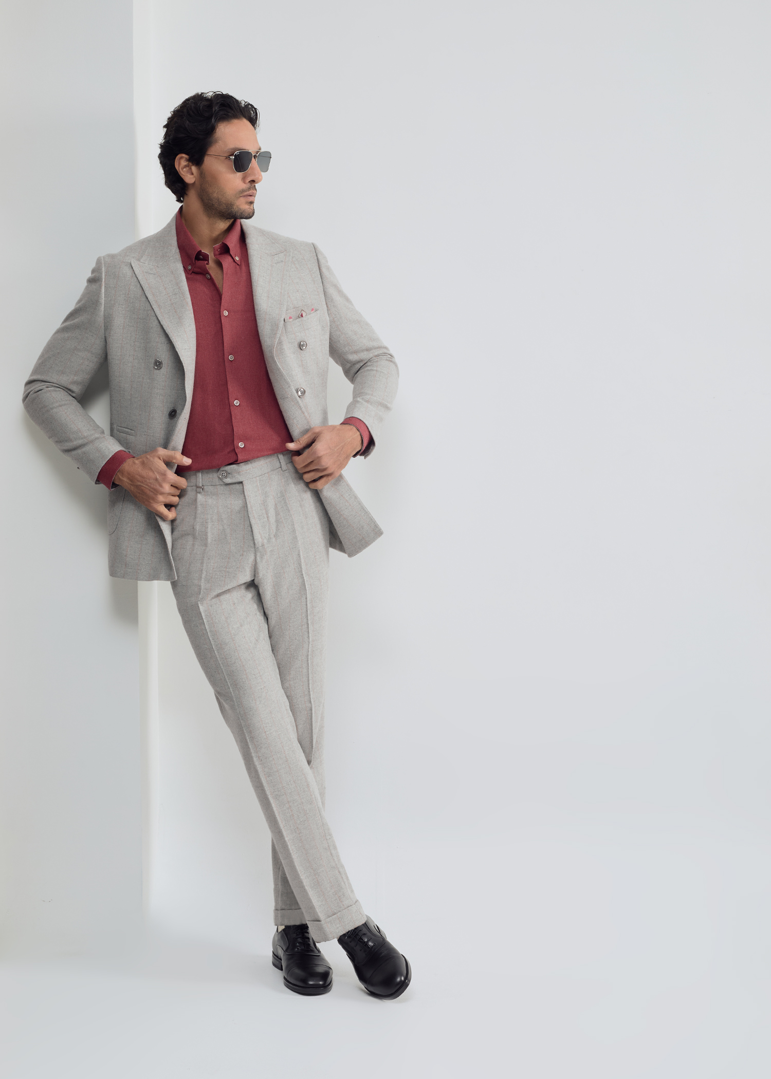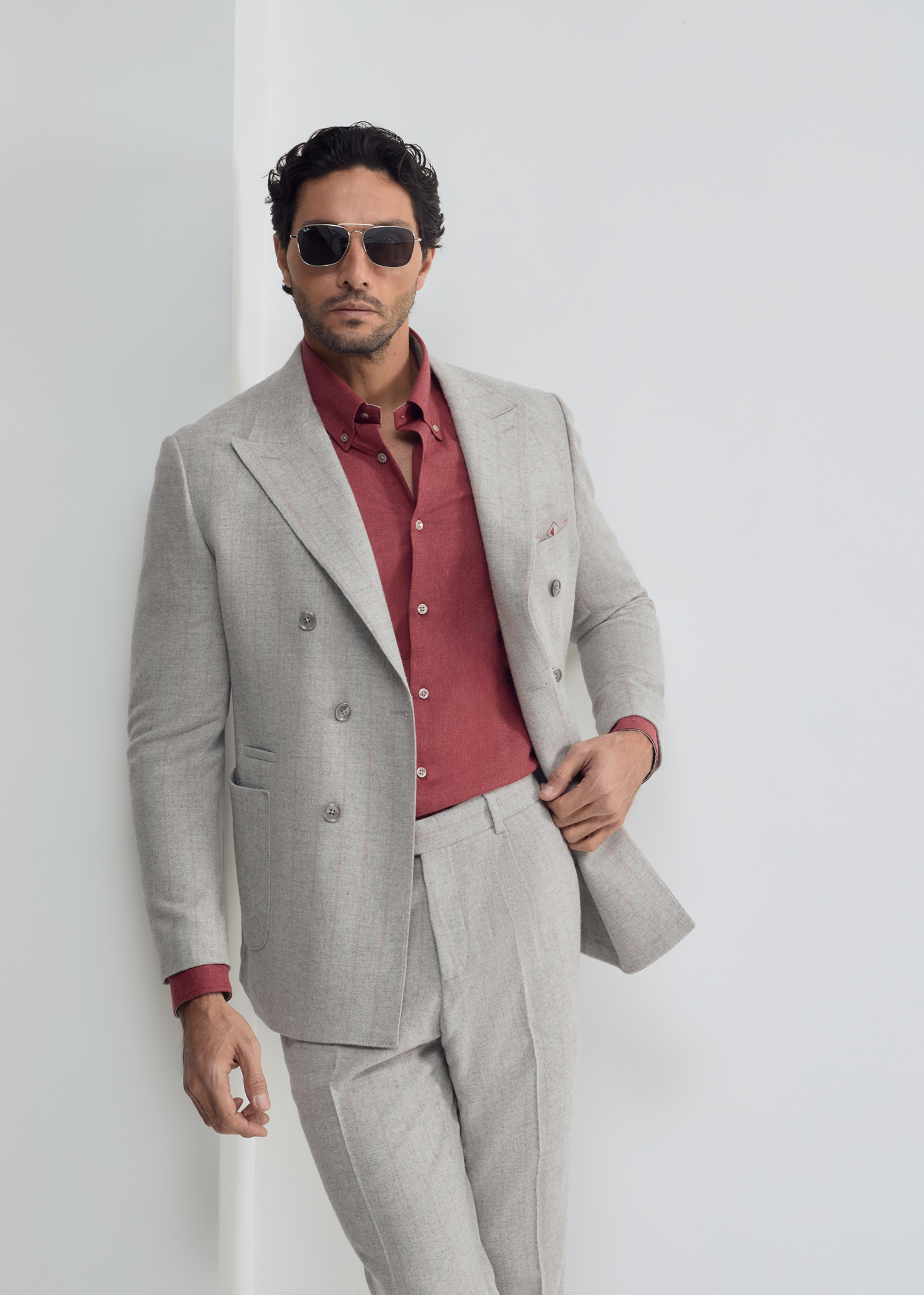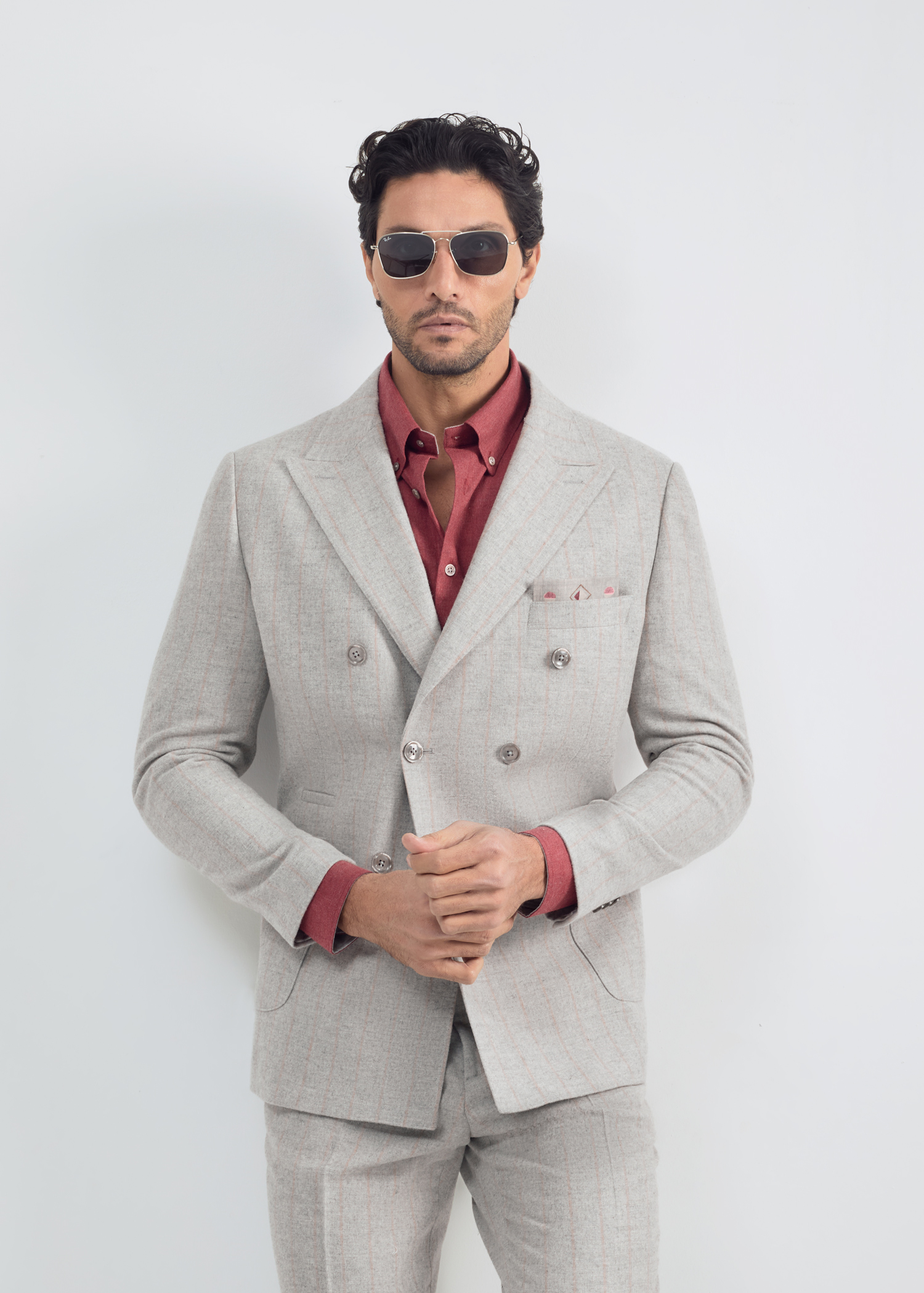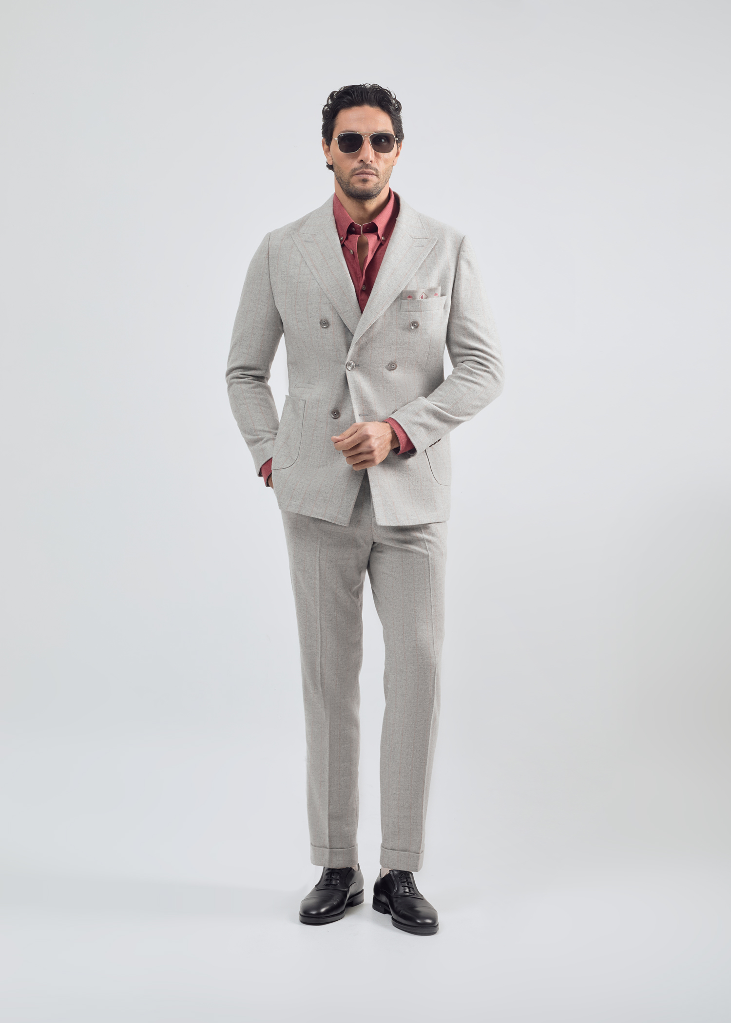 کت دبل برست، پارچه ترکیبی از الیاف پشمی و پلی استر، دو چاک در پشت، دارای دو جیب پاکتی و یک جیب روی سینه جهت استفاده از پوشت، بدون آستر