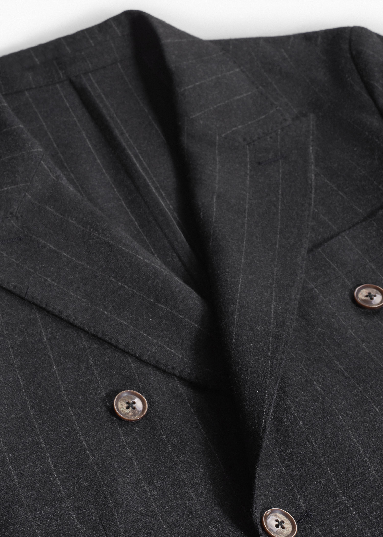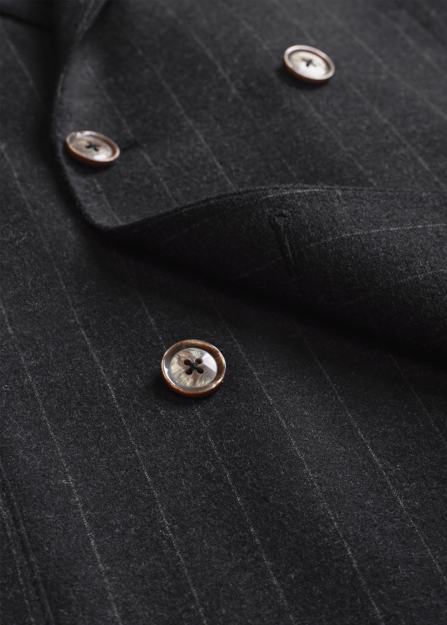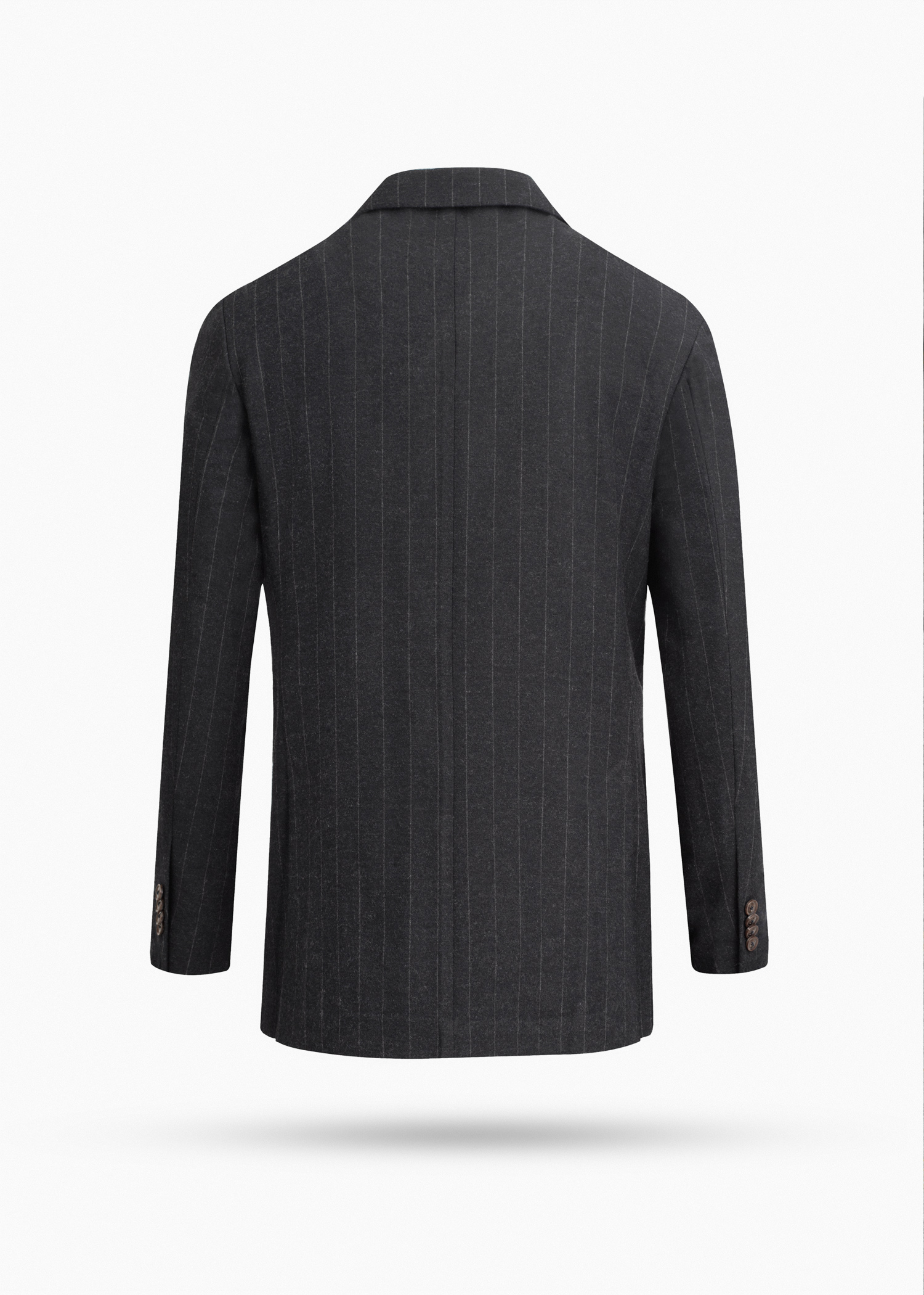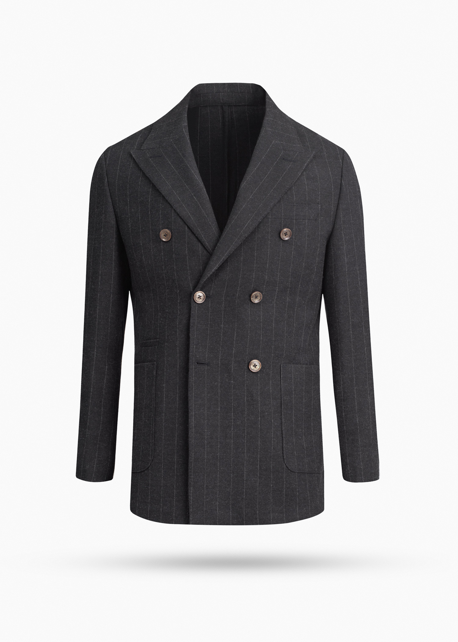 کت دبل برست، پارچه ترکیبی از الیاف پشمی و پلی استر، دو چاک در پشت، دارای دو جیب پاکتی و یک جیب روی سینه جهت استفاده از پوشت، بدون آستر