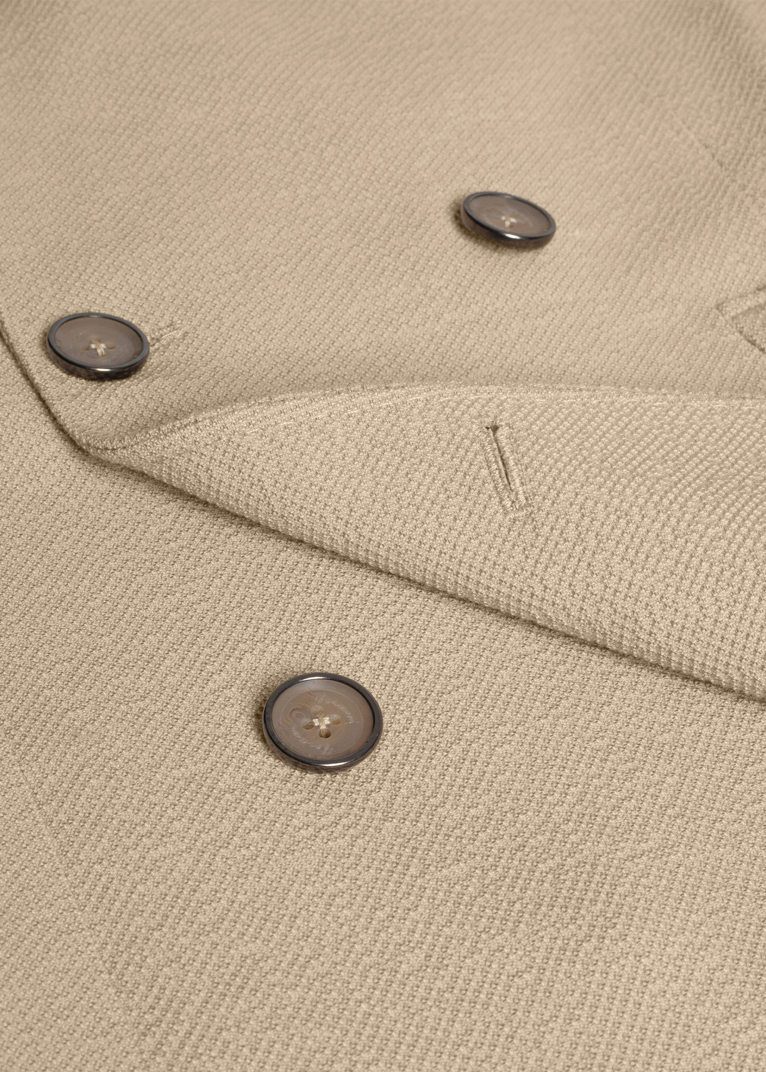 کت تک دبل برست، دو چاک در پشت، دارای دو جیب و یک جیب روی پیش سینه جهت استفاده از پوشت، داخل نیم آستر