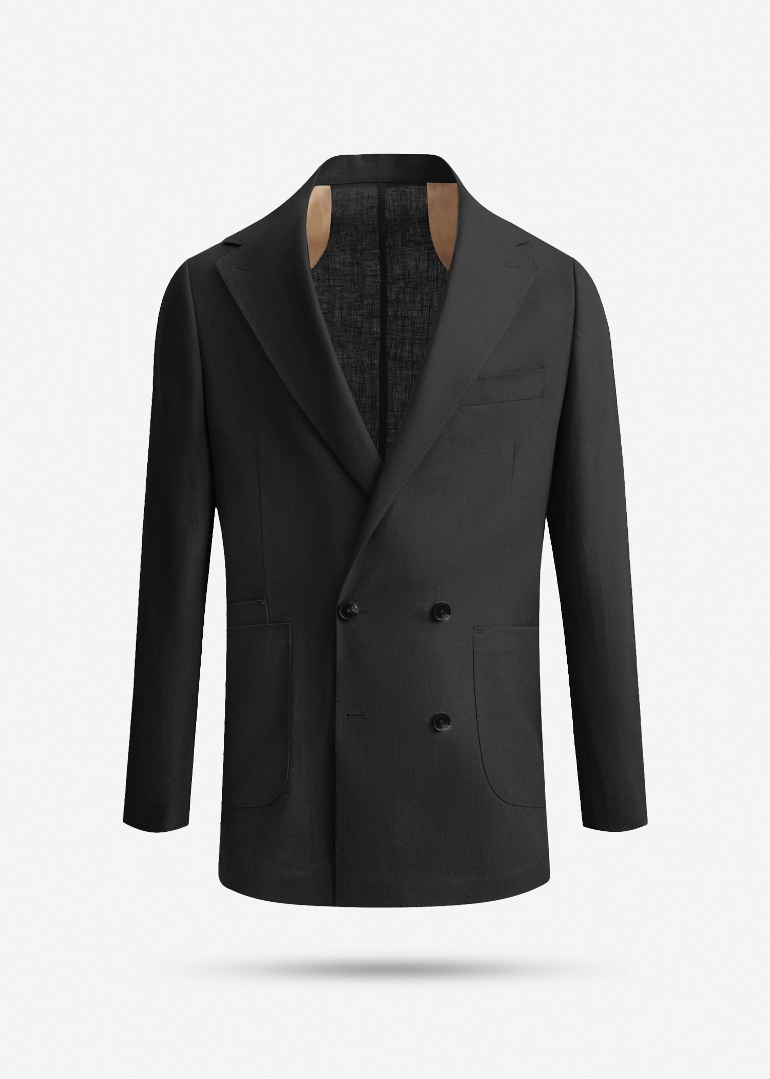 کت تک دبل برست، دو چاک در پشت، دارای دوخت تزئینی بانتو، دارای دو جیب قایقی روکار و جیب های داخلی و یک جیب روی سینه جهت استفاده از پوشت، طراحی به صورت نیمه آستر