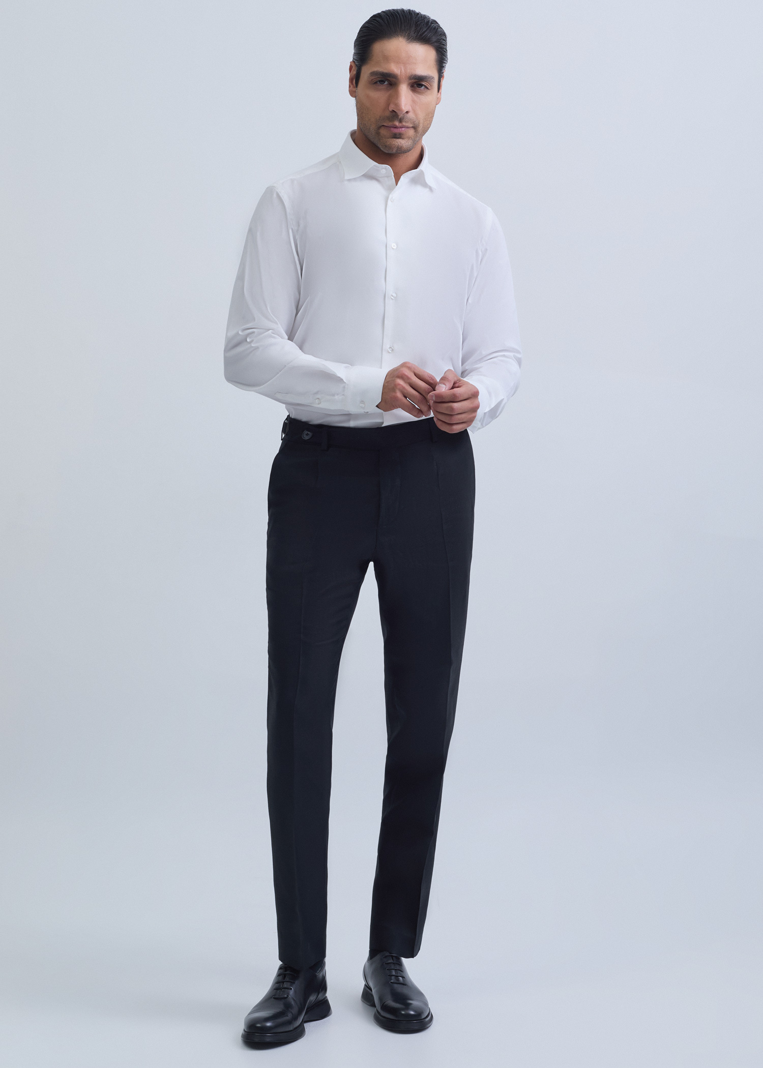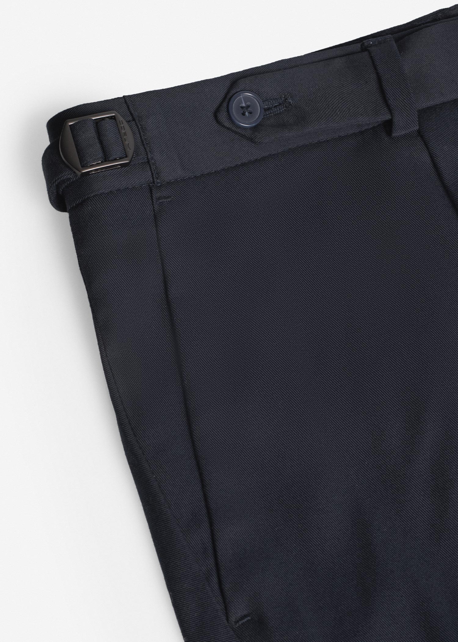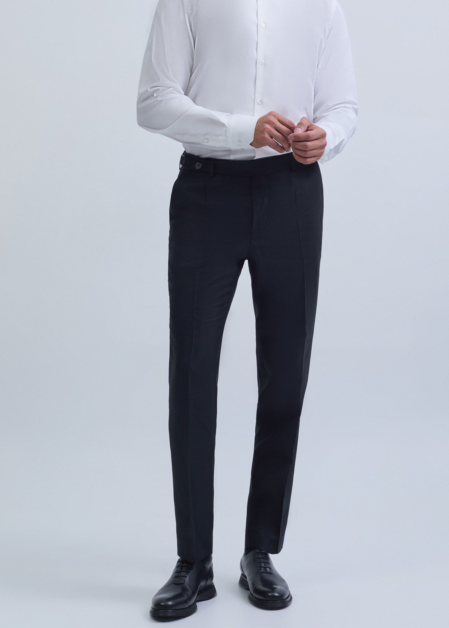 شلوار کتان، دارای سگک، تک پیله، پیش کار تک دکمه، دارای بند کمر جهت استفاده از کمربند