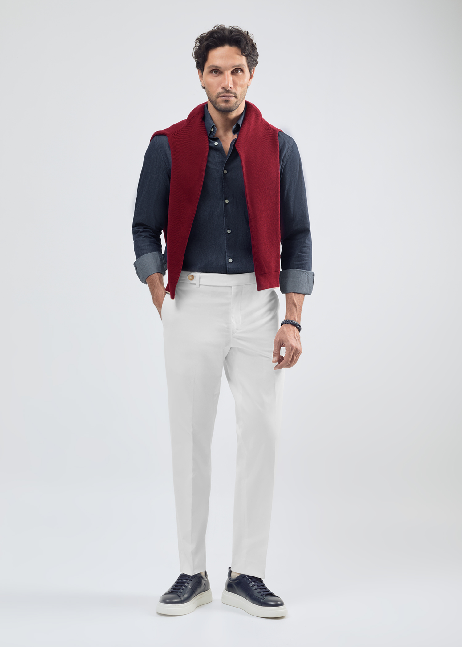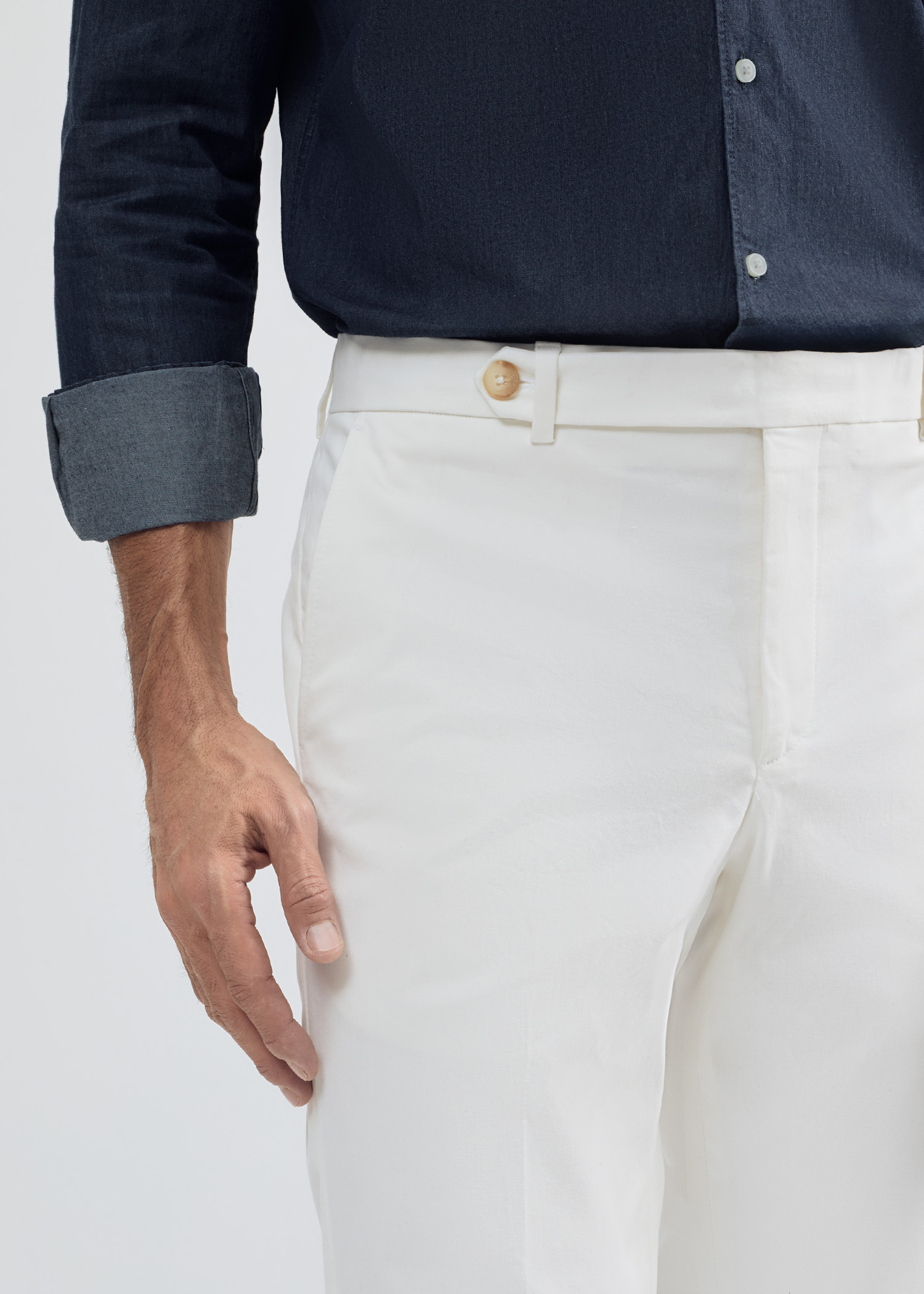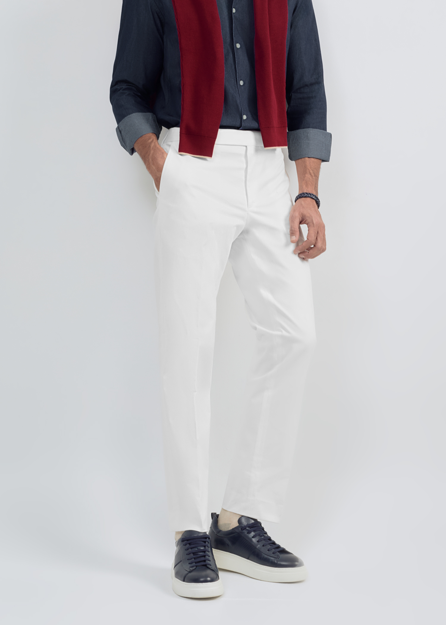 شلوار کتان، پیش کار دو دکمه، دارای 3% الاستین جهت راحتی بیشتر، دارای بند کمر جهت استفاده از کمربند