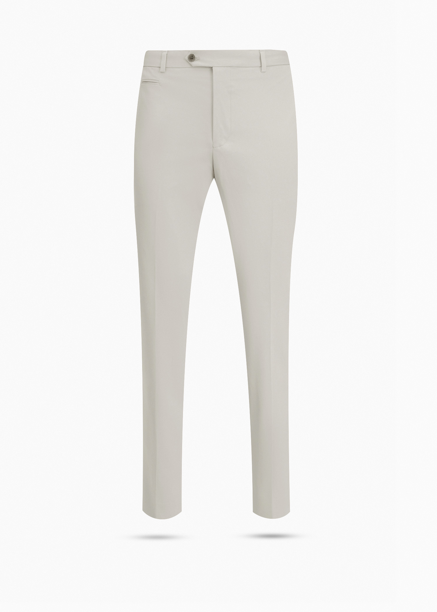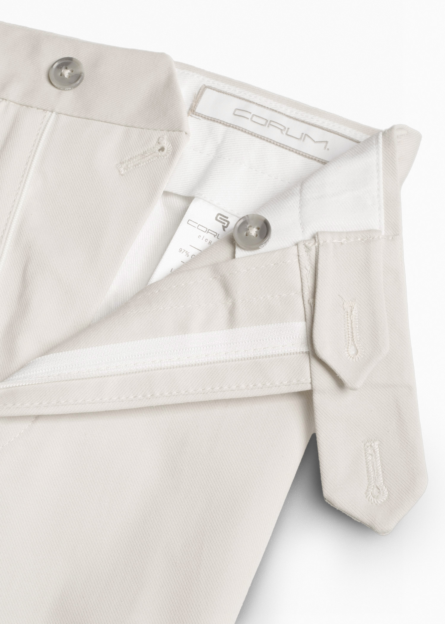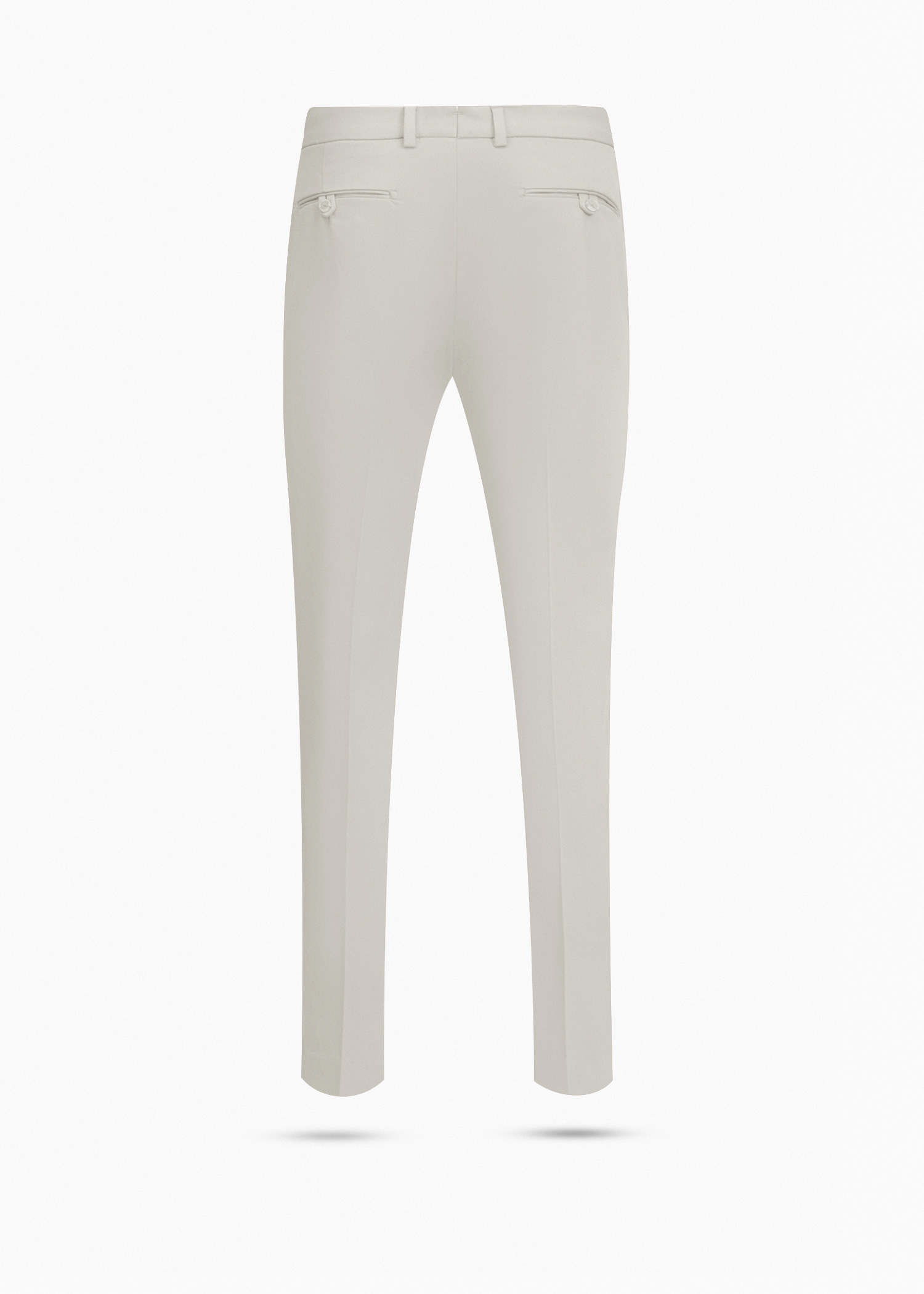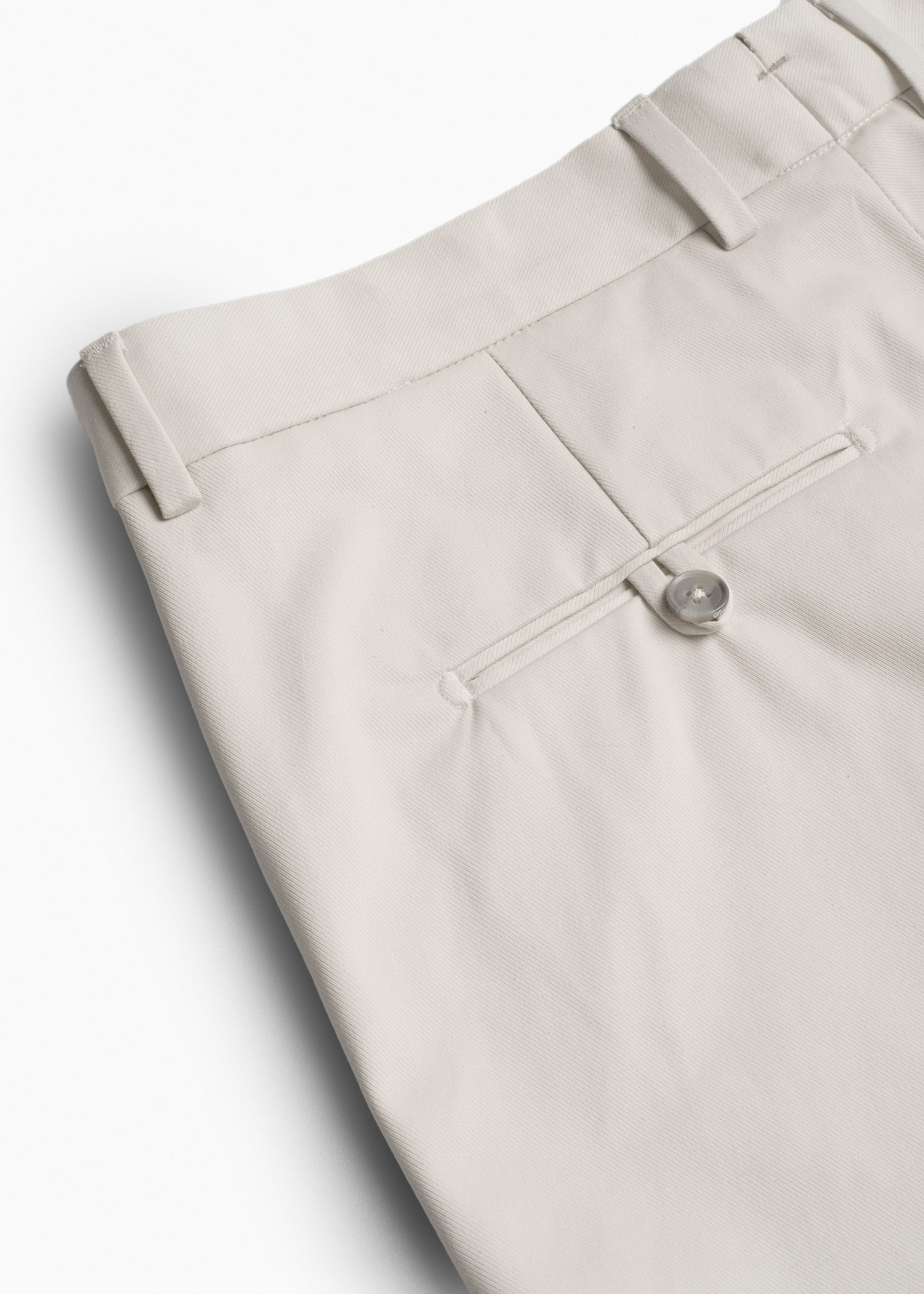 شلوار کتان، پیش کار تک دکمه، دارای جیب پاکتی، دارای بند کمر جهت استفاده از کمربند، دارای 3% الاستین جهت راحتی بیشتر
