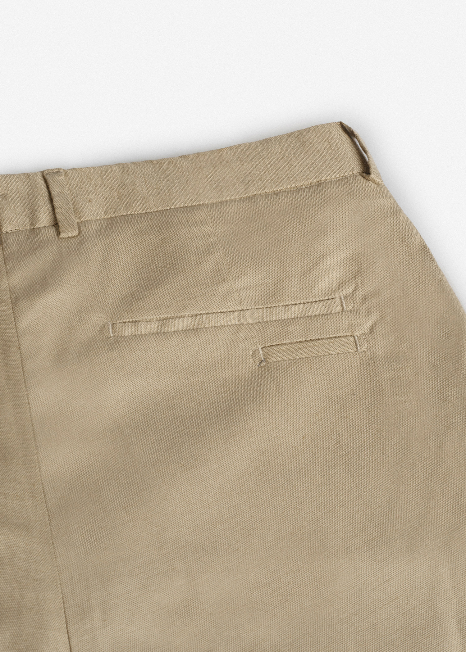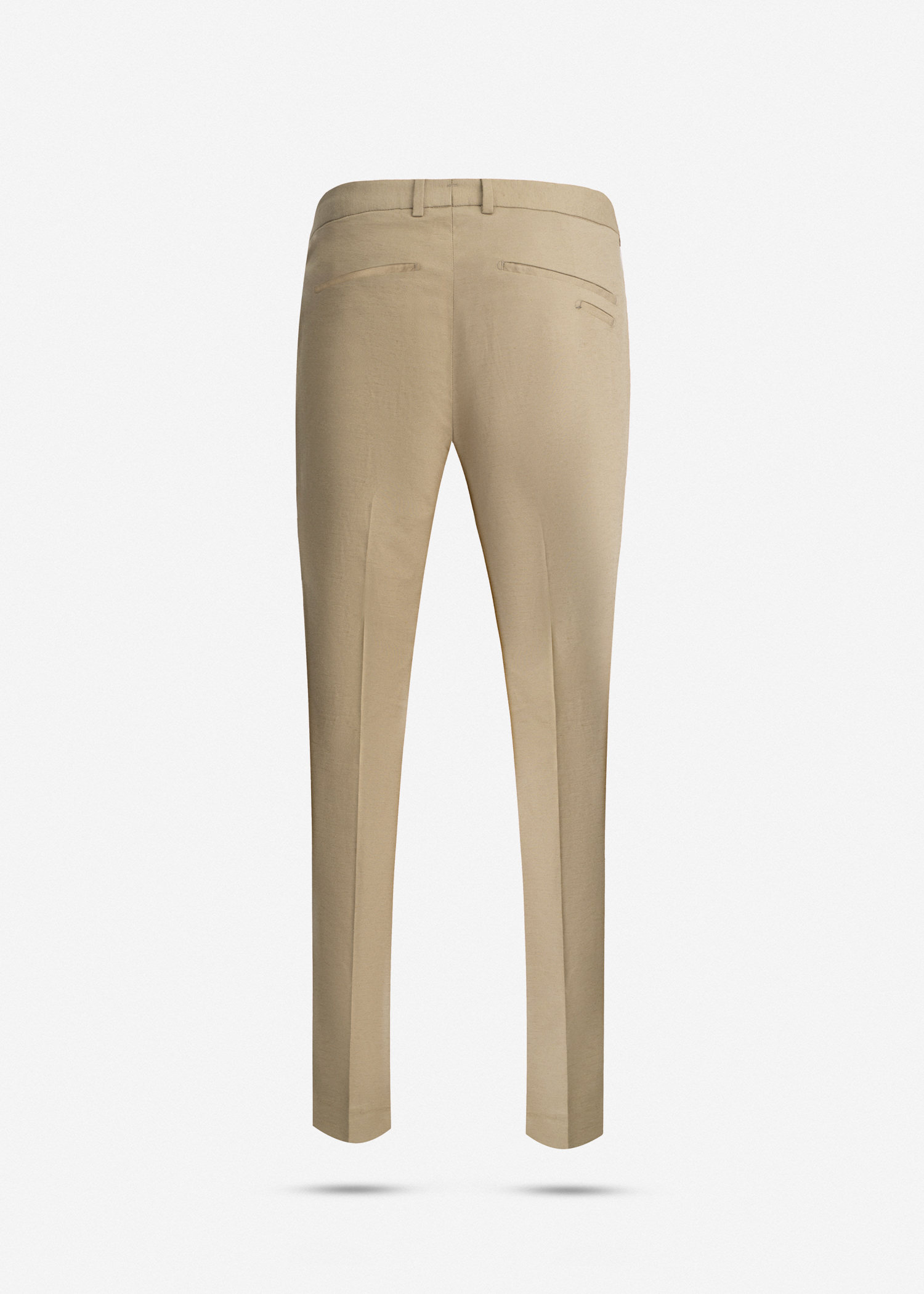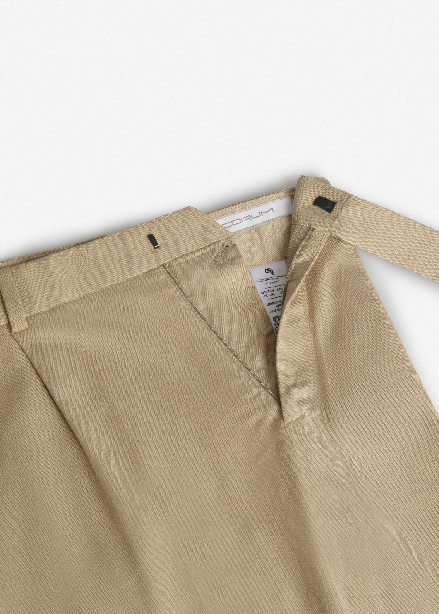 شلوار پارچه ای لینن، پیش کار دارای دکمه و قزن، پیله‌دار، الیاف خنک و سبک، دارای بند کمر جهت استفاده از کمربند
