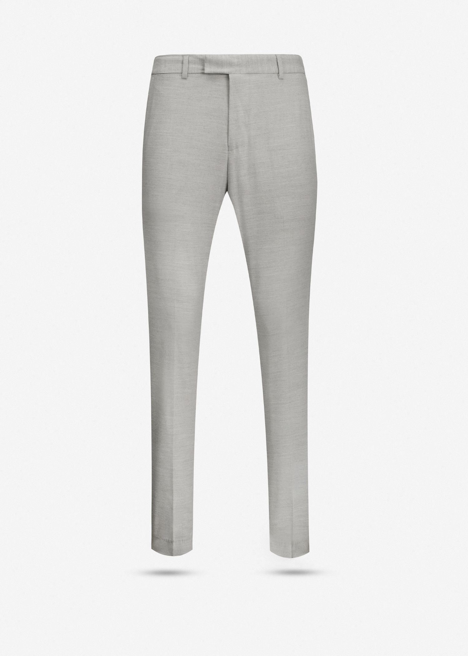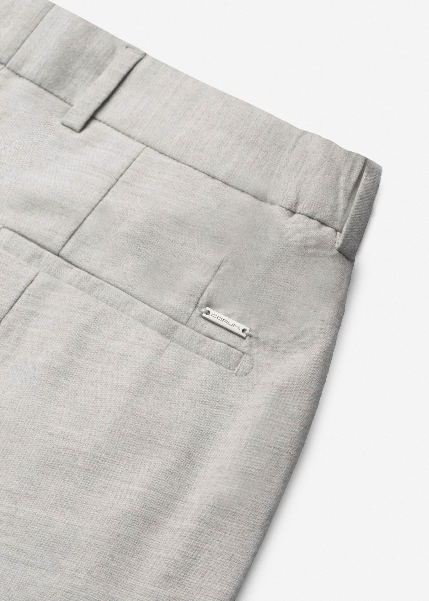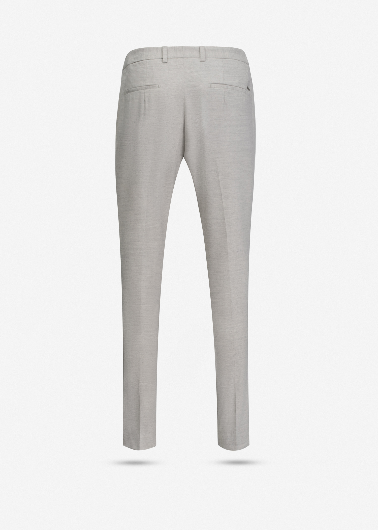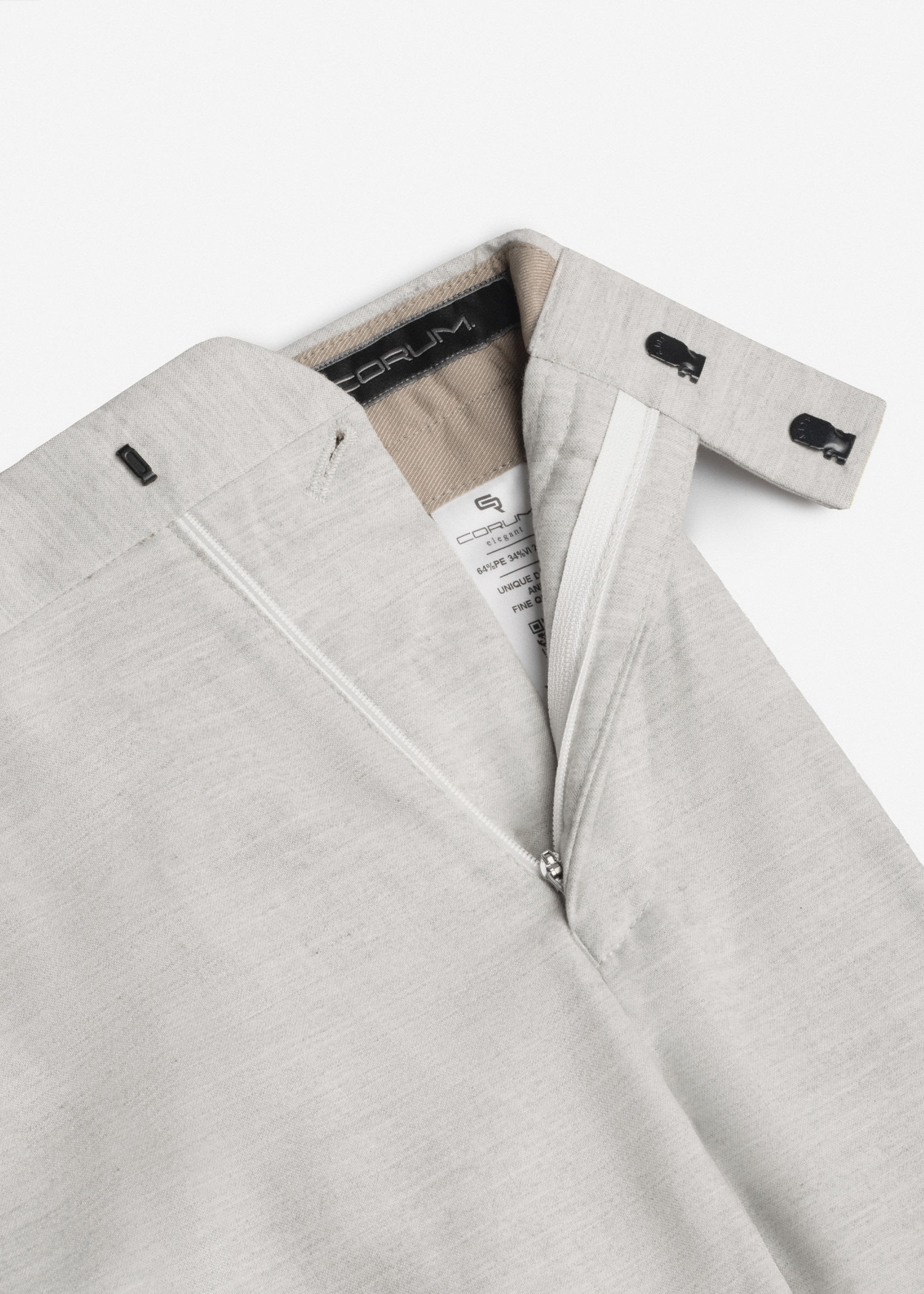 شلوار پارچه ای، پیش کار قزن دار، دارای بند کمر جهت استفاده از کمربند، دارای کش در پهلو جهت راحتی بیشتر