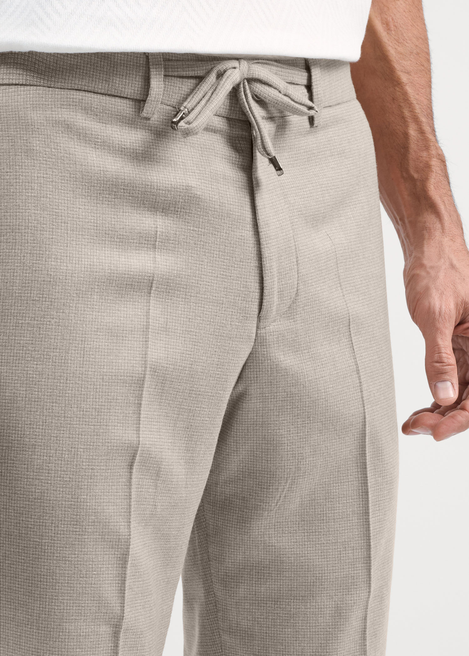 شلوار پارچه ای، پیش کار تک دکمه، دمپا دوبل پاکتی، دارای کمربند جهت فیت کردن دور کمر