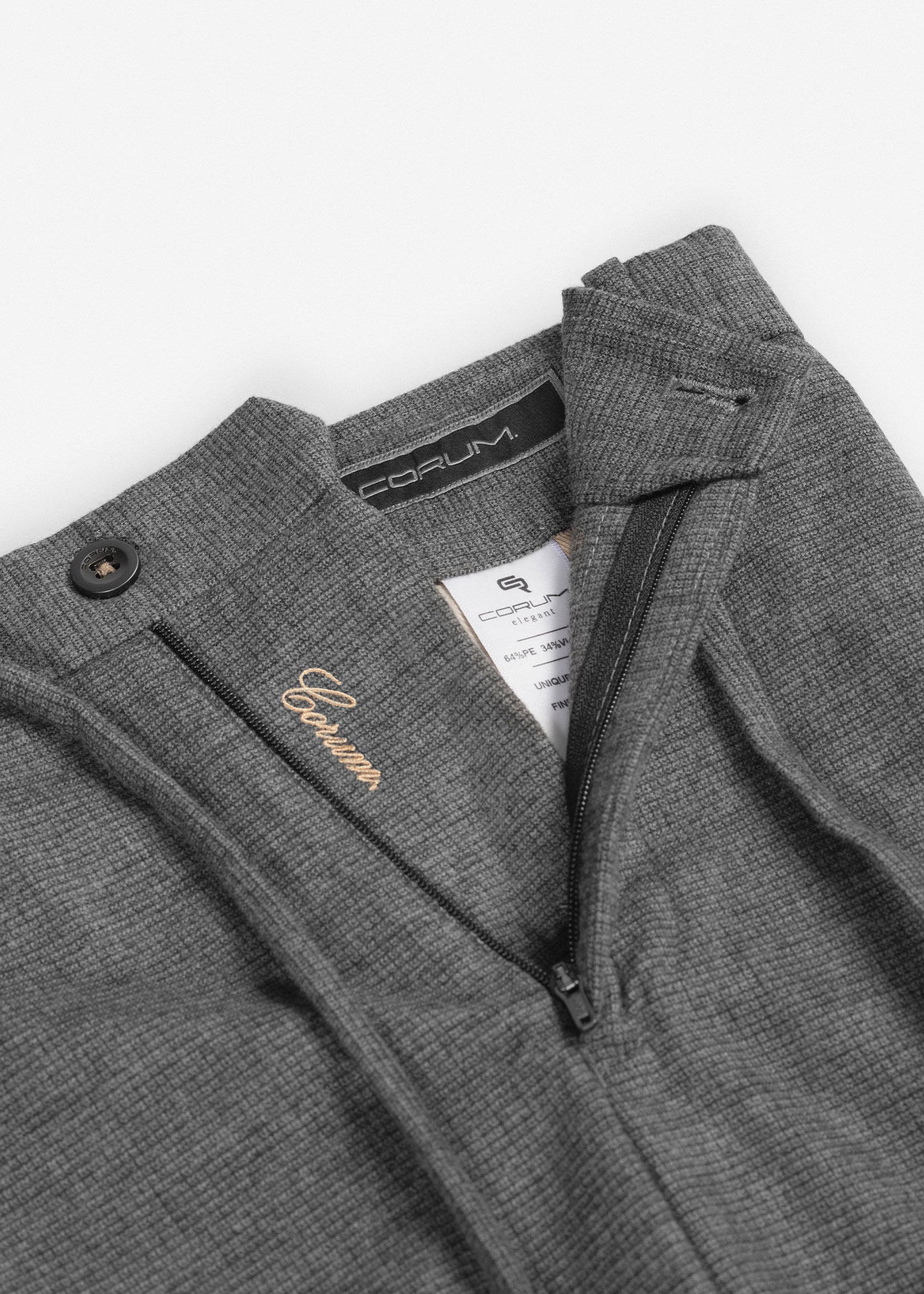 شلوار پارچه ای، پیش کار تک دکمه، دمپا دوبل پاکتی، دارای کمربند جهت فیت کردن دور کمر