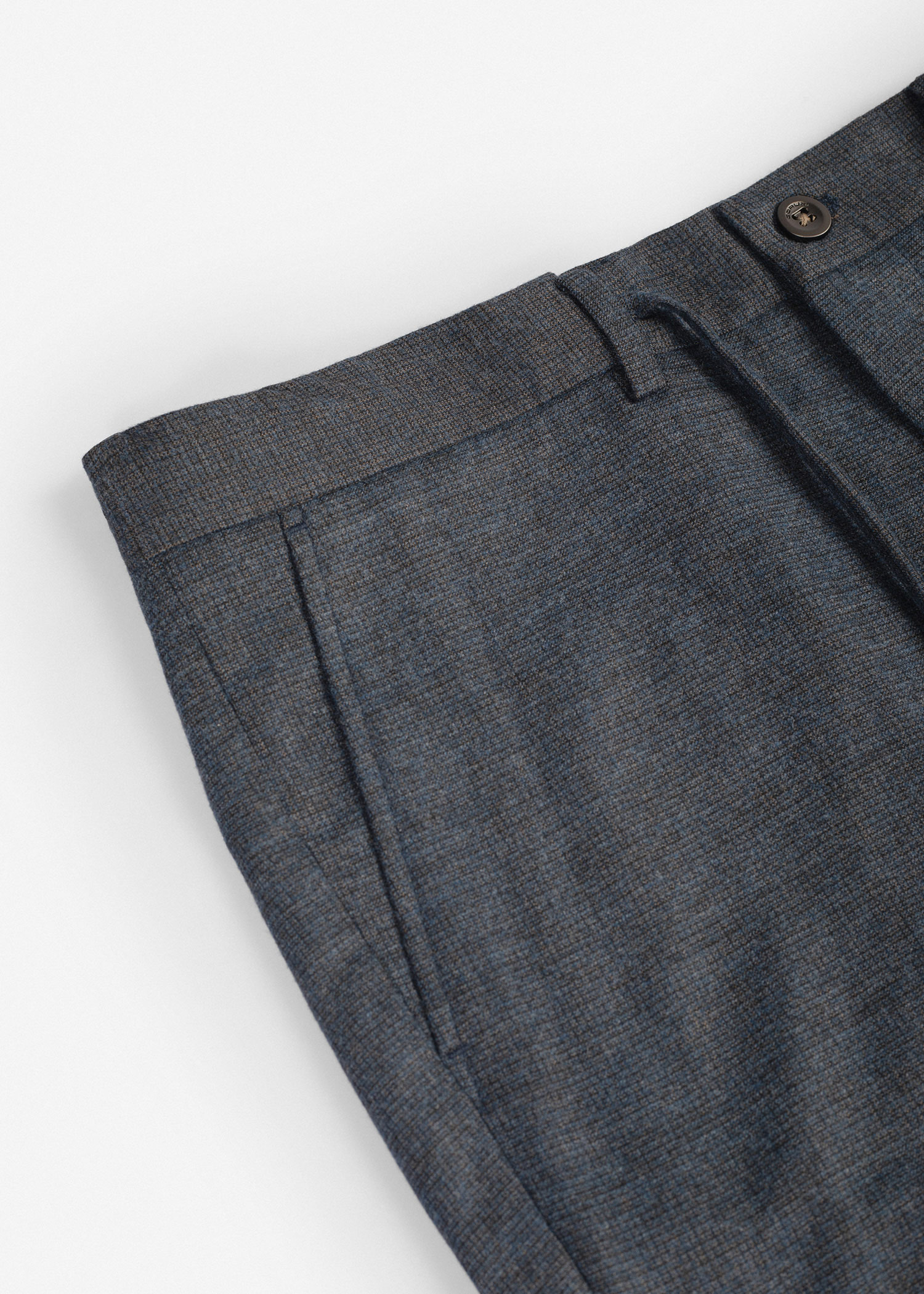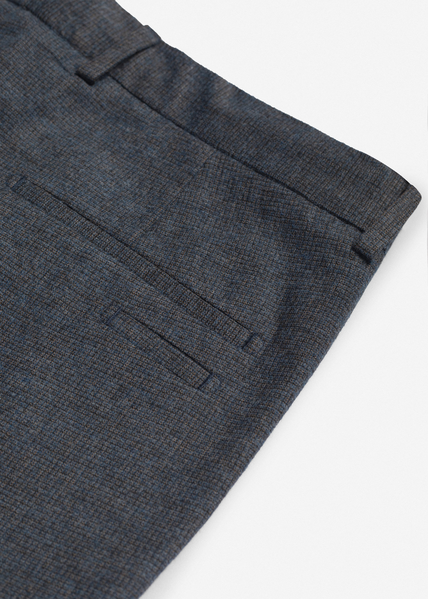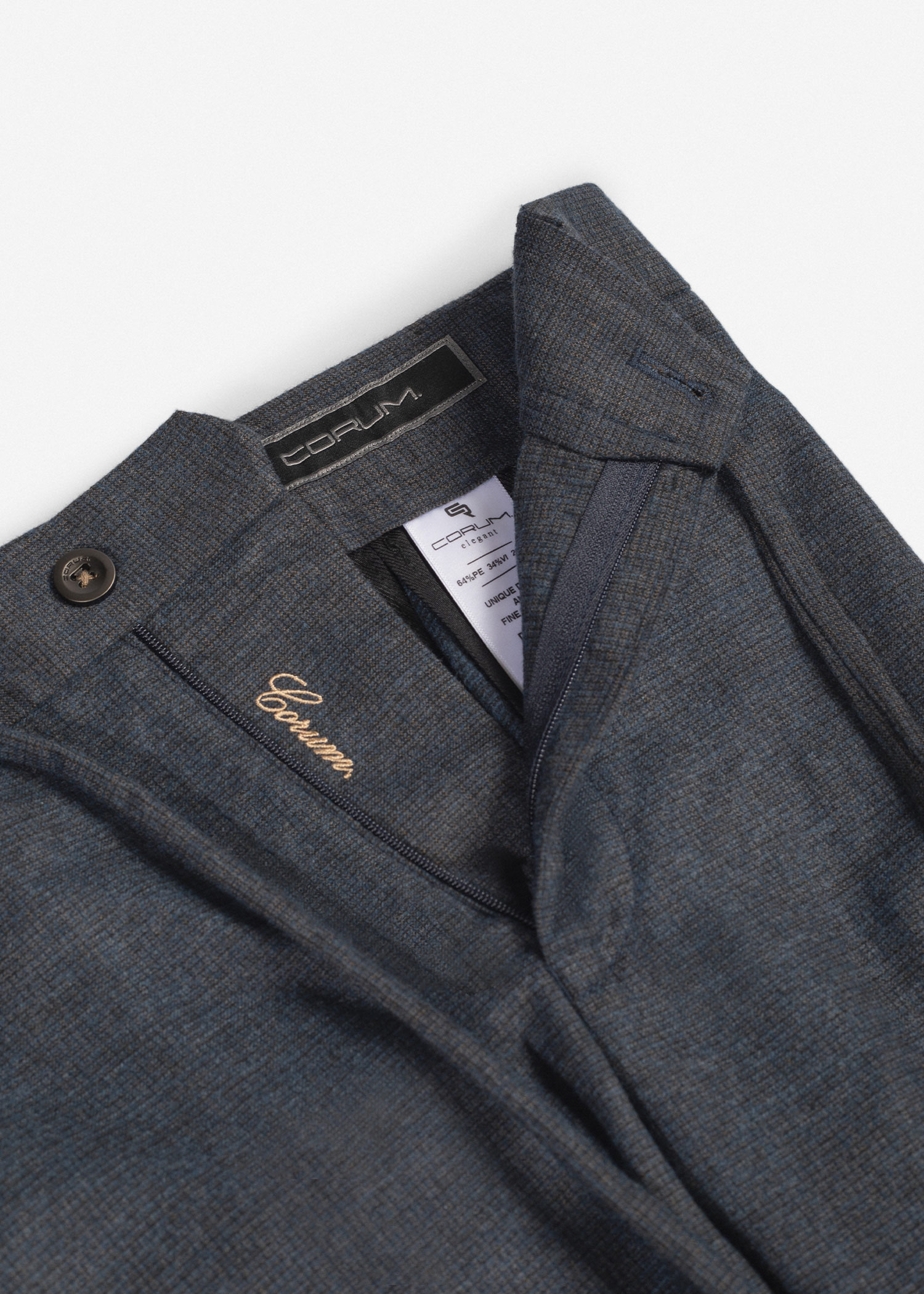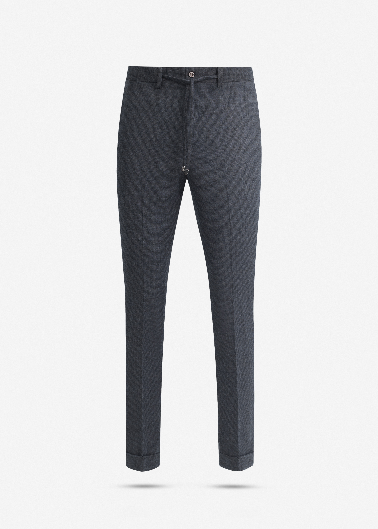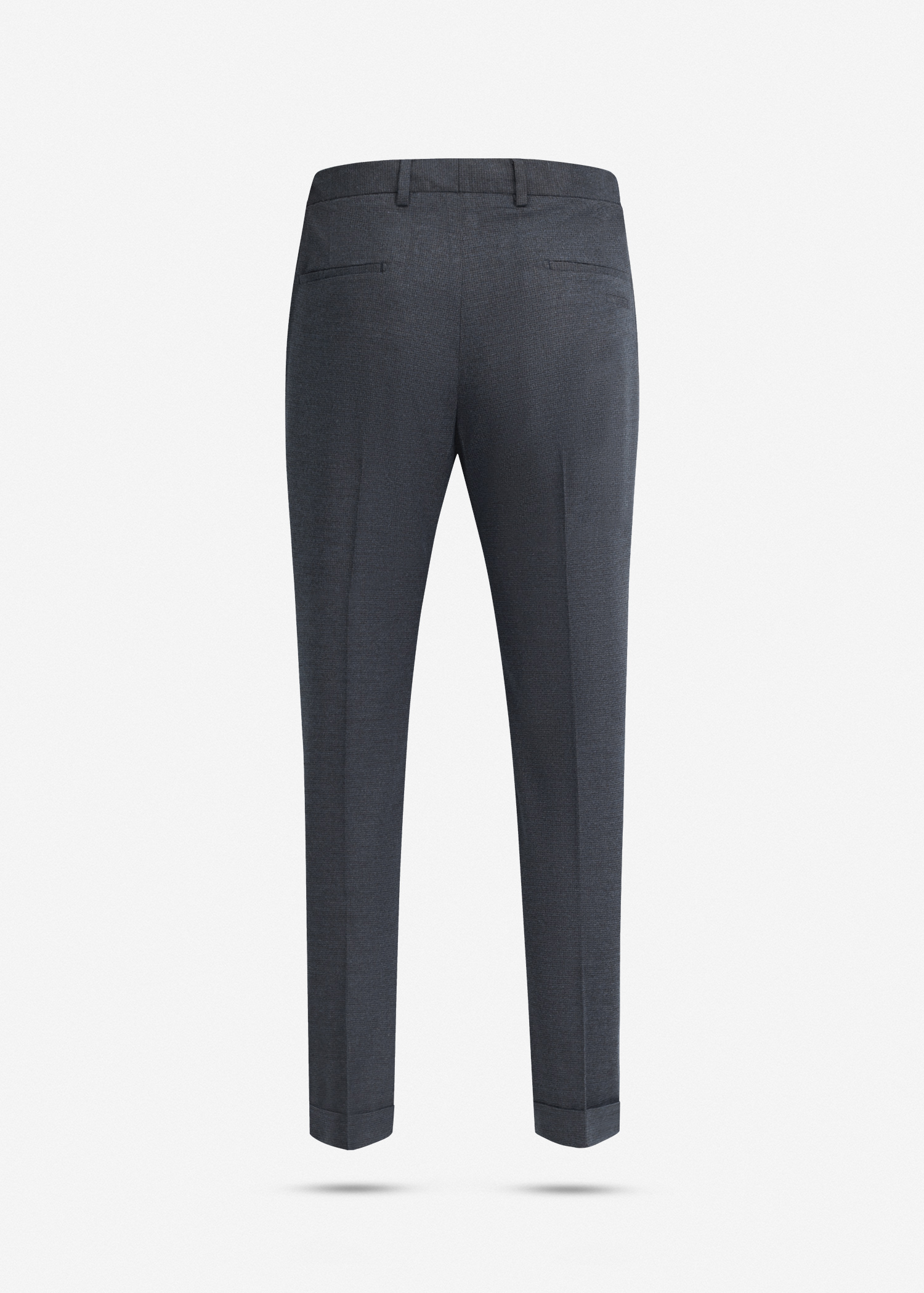 شلوار پارچه ای، پیش کار تک دکمه، دمپا دوبل پاکتی، دارای کمربند جهت فیت کردن دور کمر