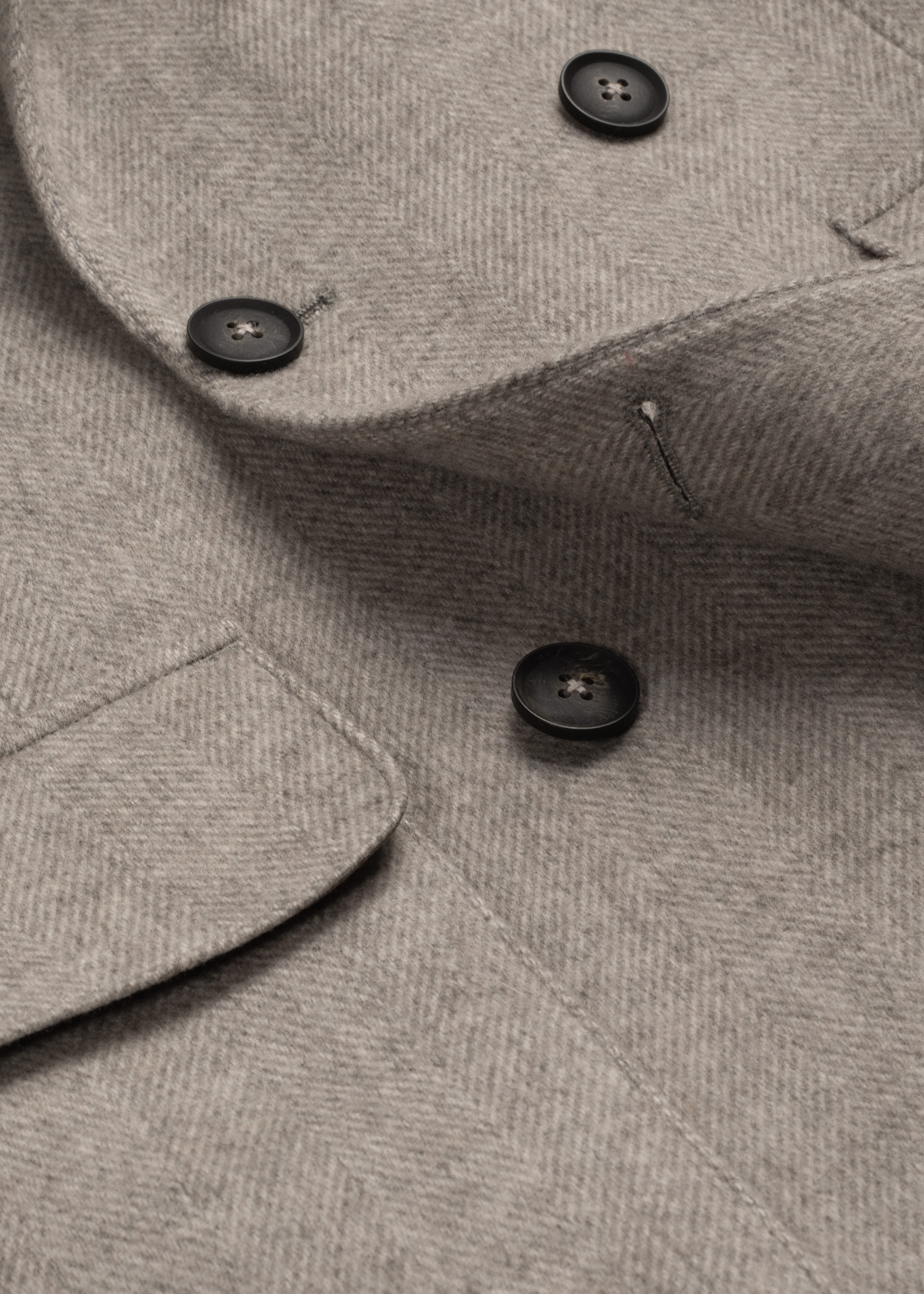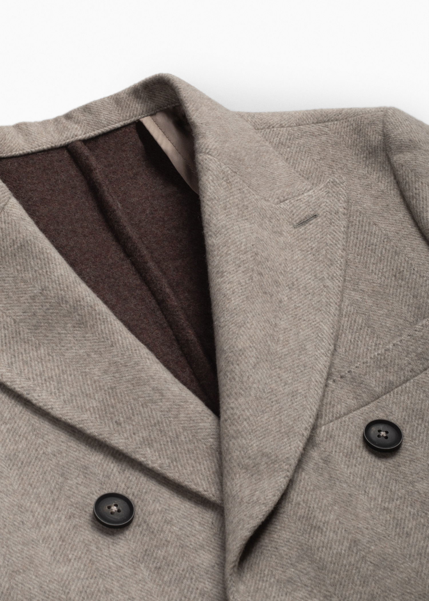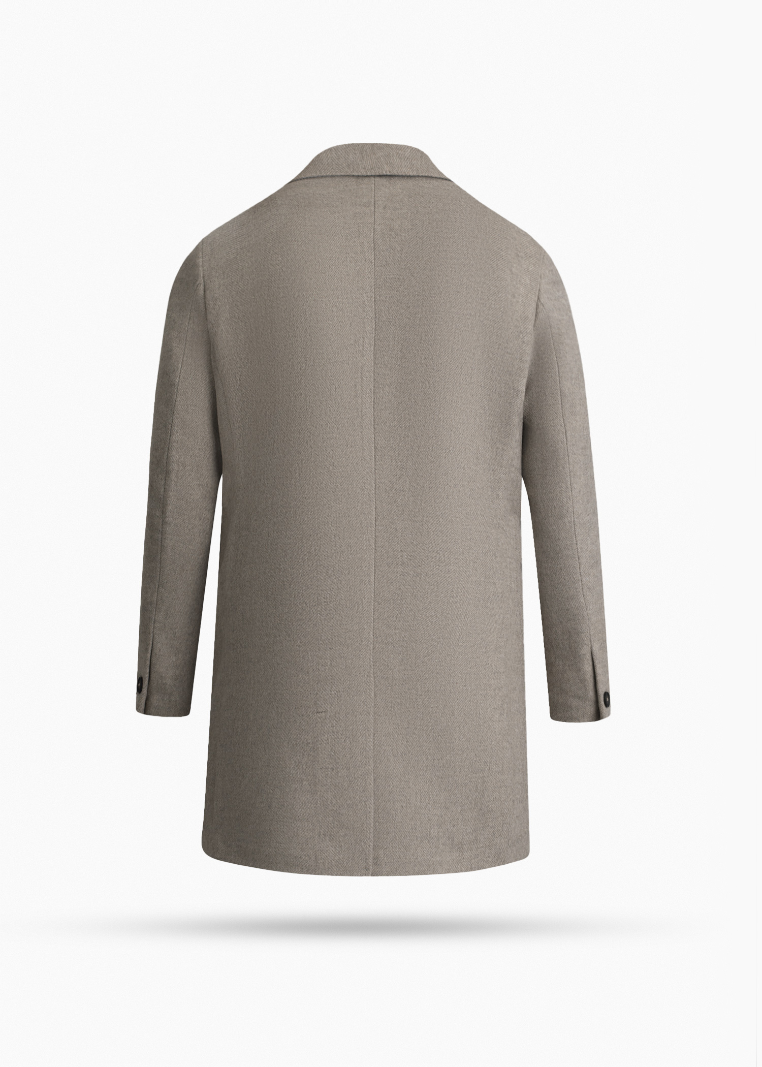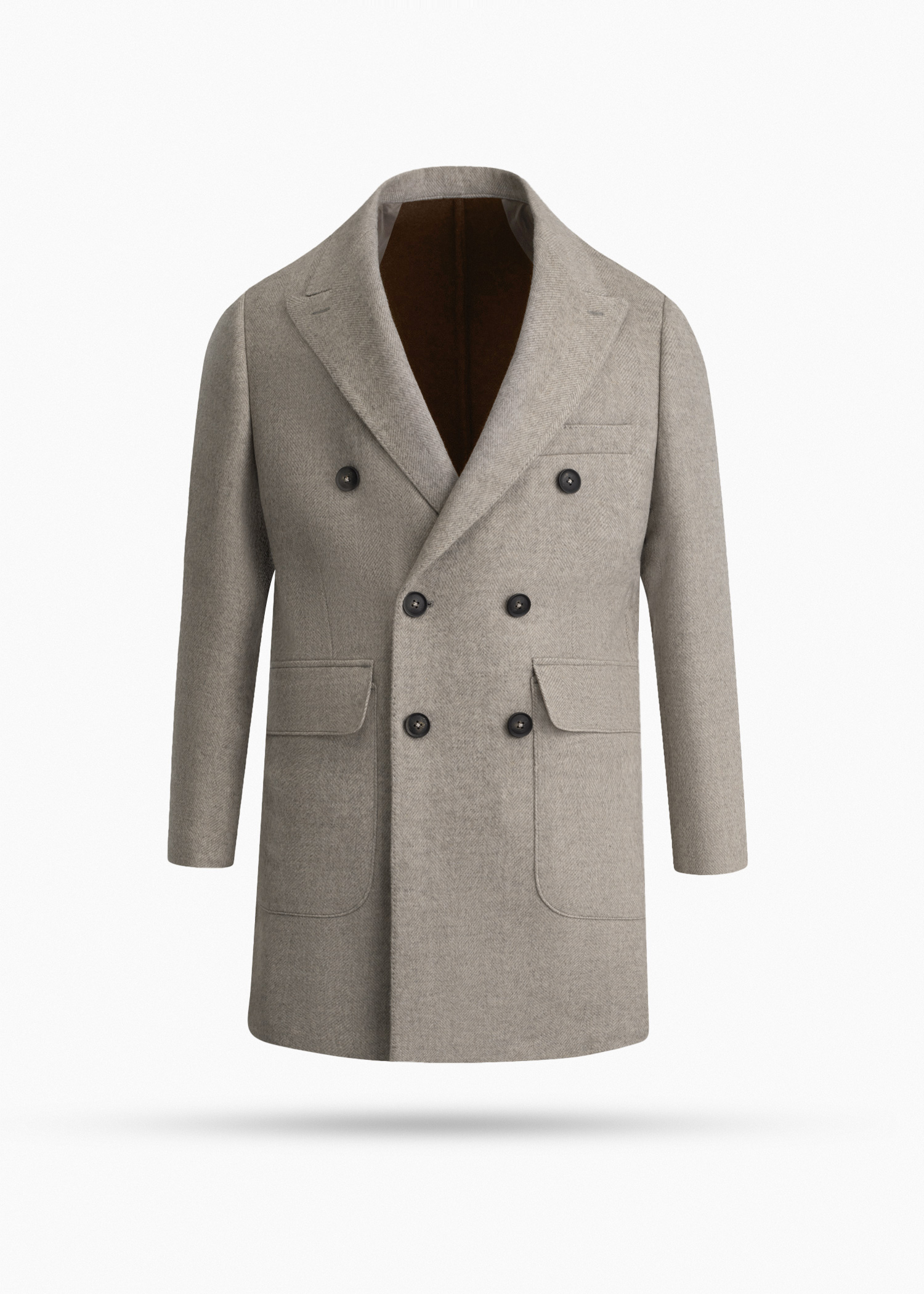 پالتو دبل‌برست، لمس روی پارچه حالت پشمی، استایل Drop-6، یک چاک در پشت، دارای دو جیب پاکتی و دو جیب در بغل و یک جیب روی سینه جهت استفاده از پوشت، داخل نیم آستر