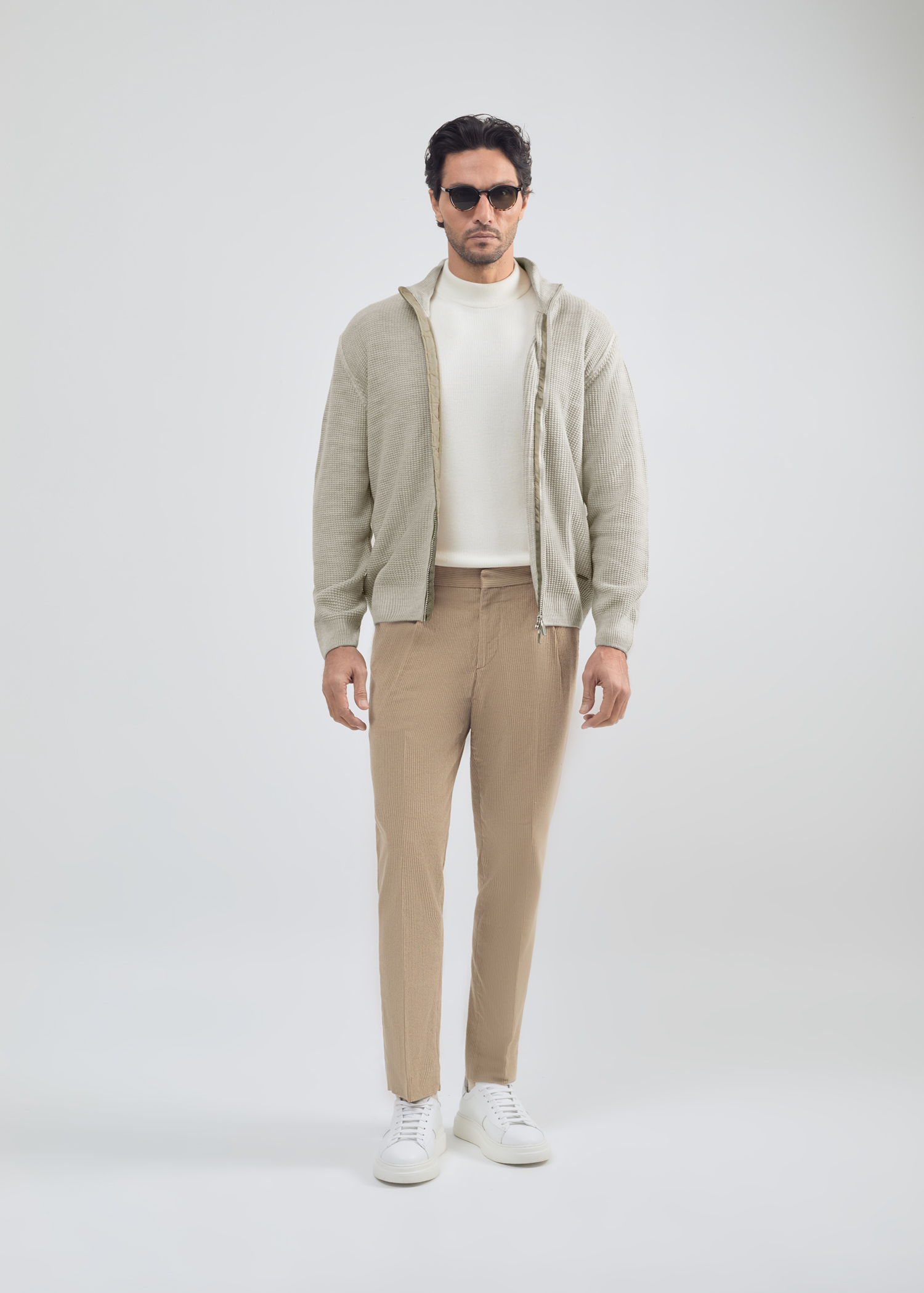 پلیور آستین بلند، دو سر زیپدار، بافته شده از نخ با کیفیت، دارای کشبافت در یقه، سرآستین ها و دور کمر، ثبات رنگ در شستشو