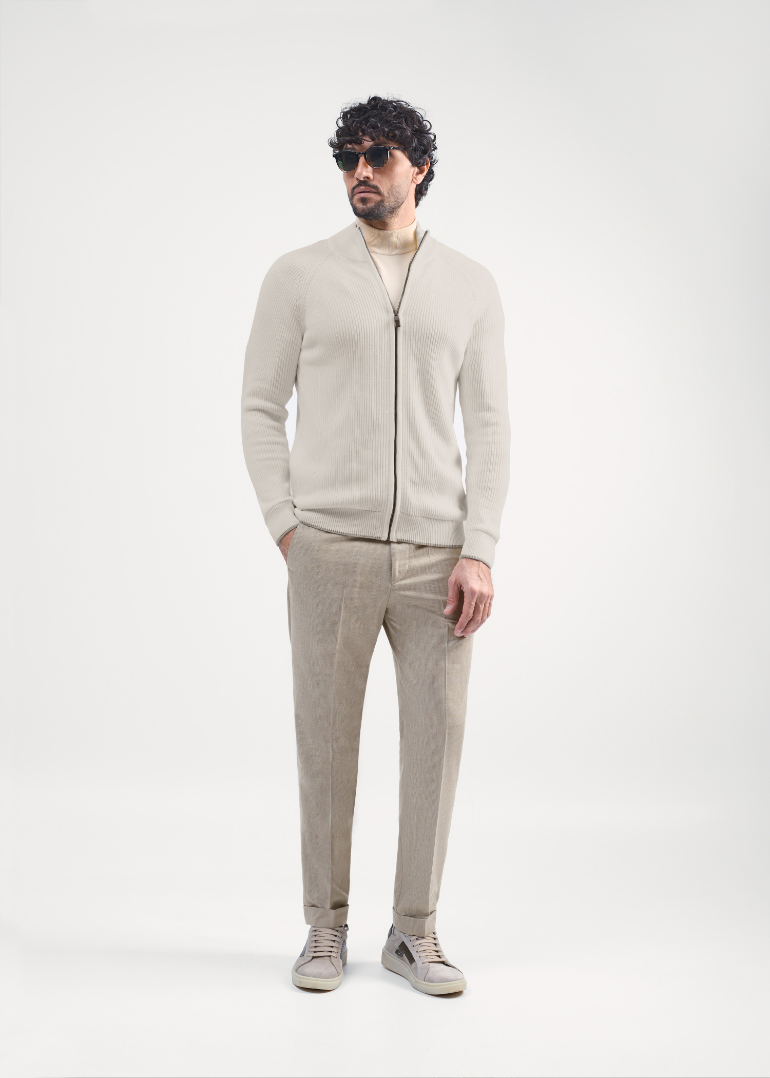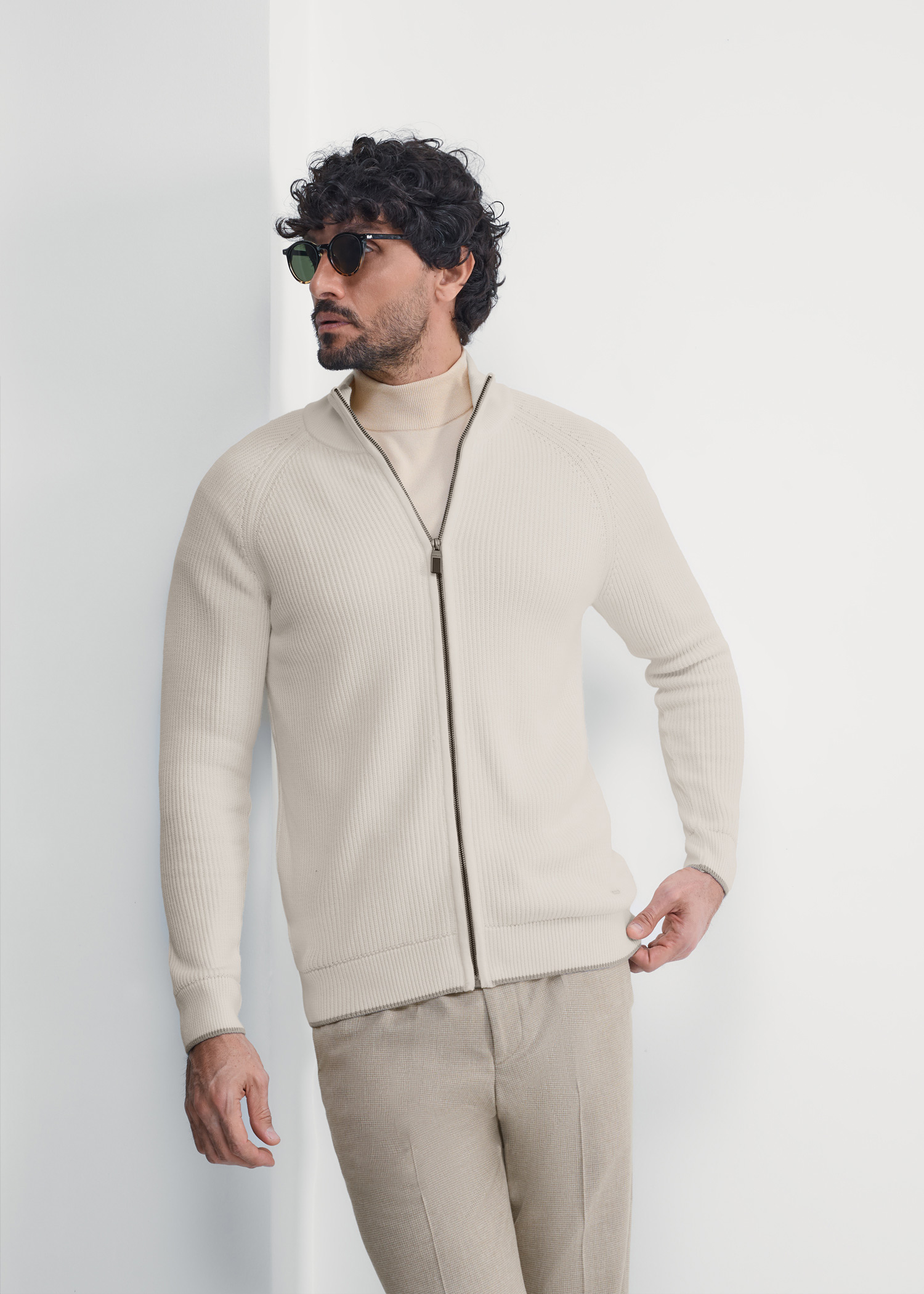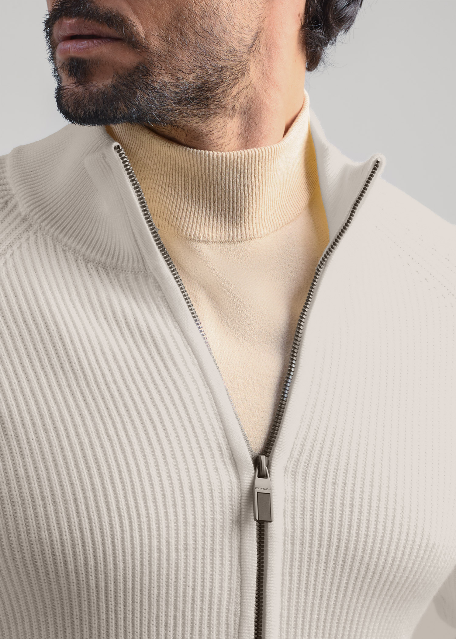 پلیور آستین بلند، دو سر زیپ‌دار، بافته شده از نخ با کیفیت، دارای کشبافت در یقه، سرآستین ها و دور کمر، ثبات رنگ در شستشو