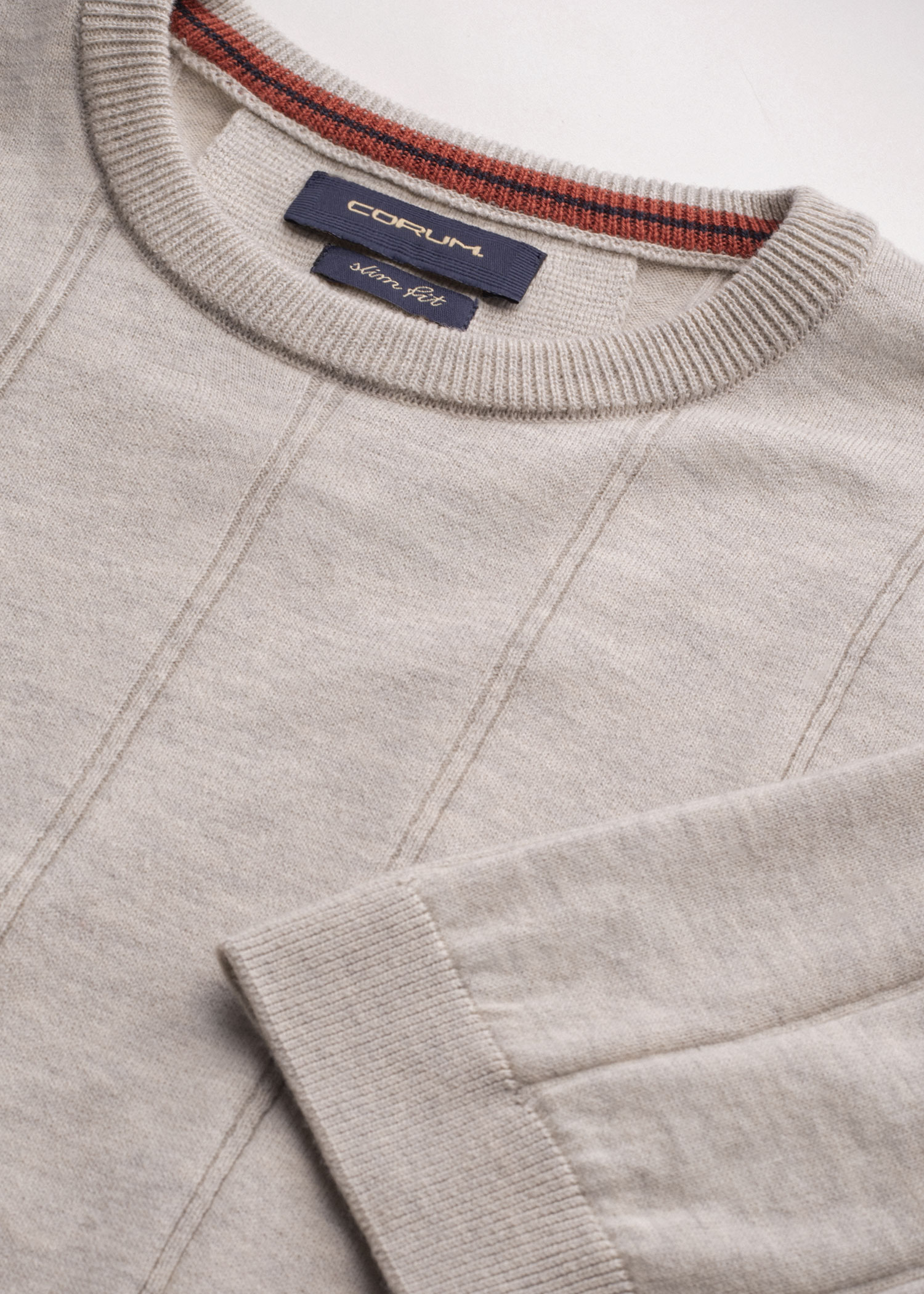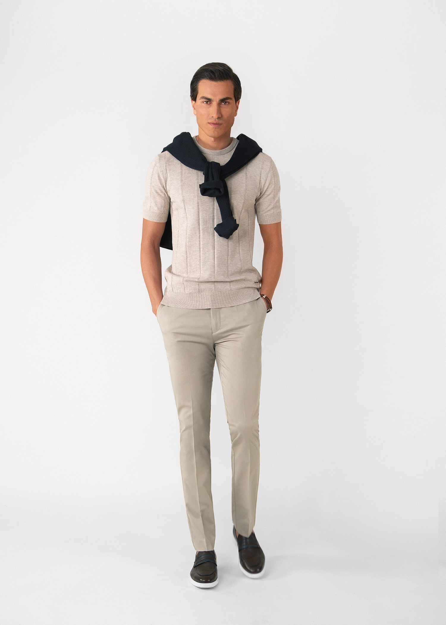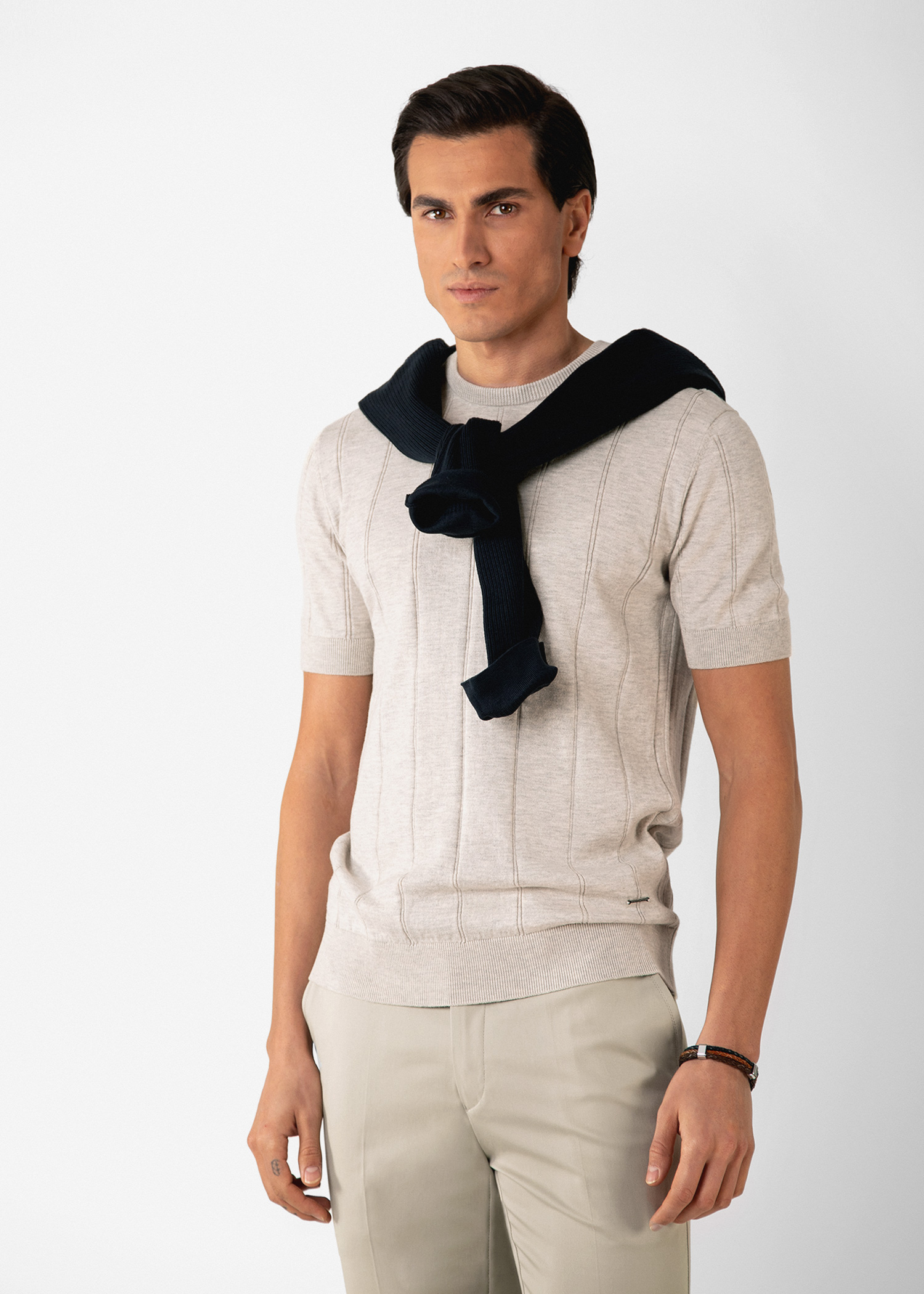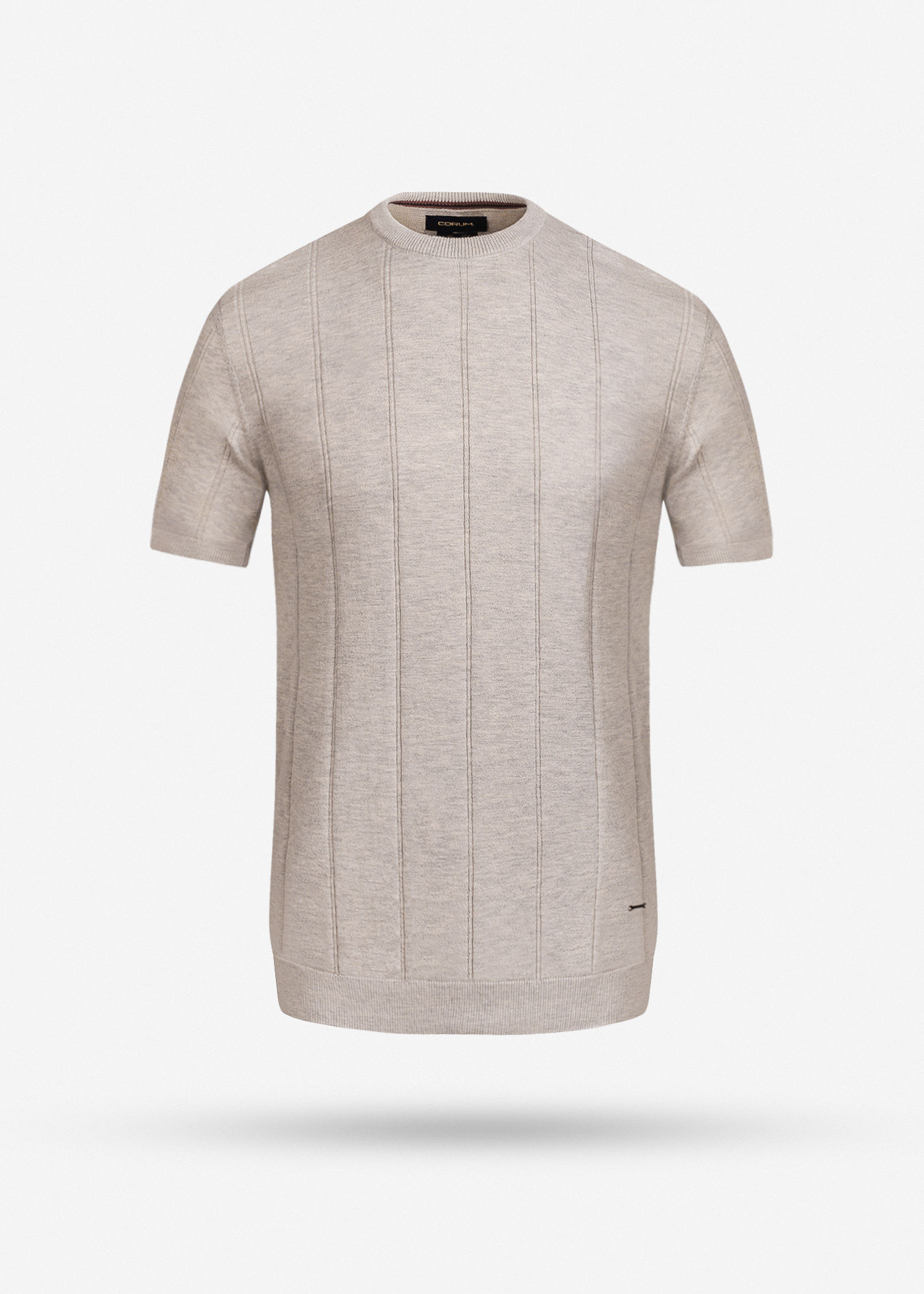 تیشرت یقه گرد بافت مردانه 2310601 - کرم