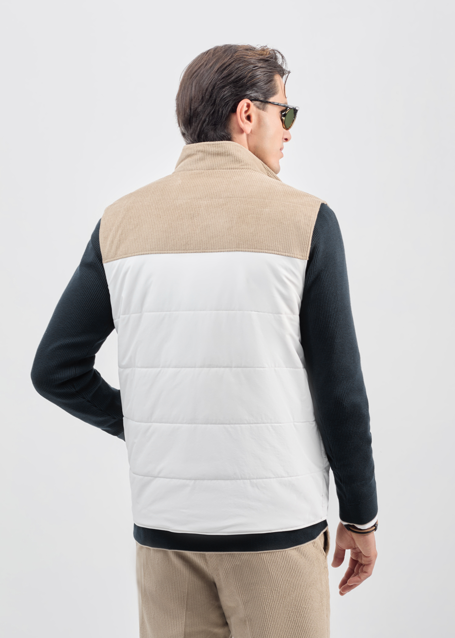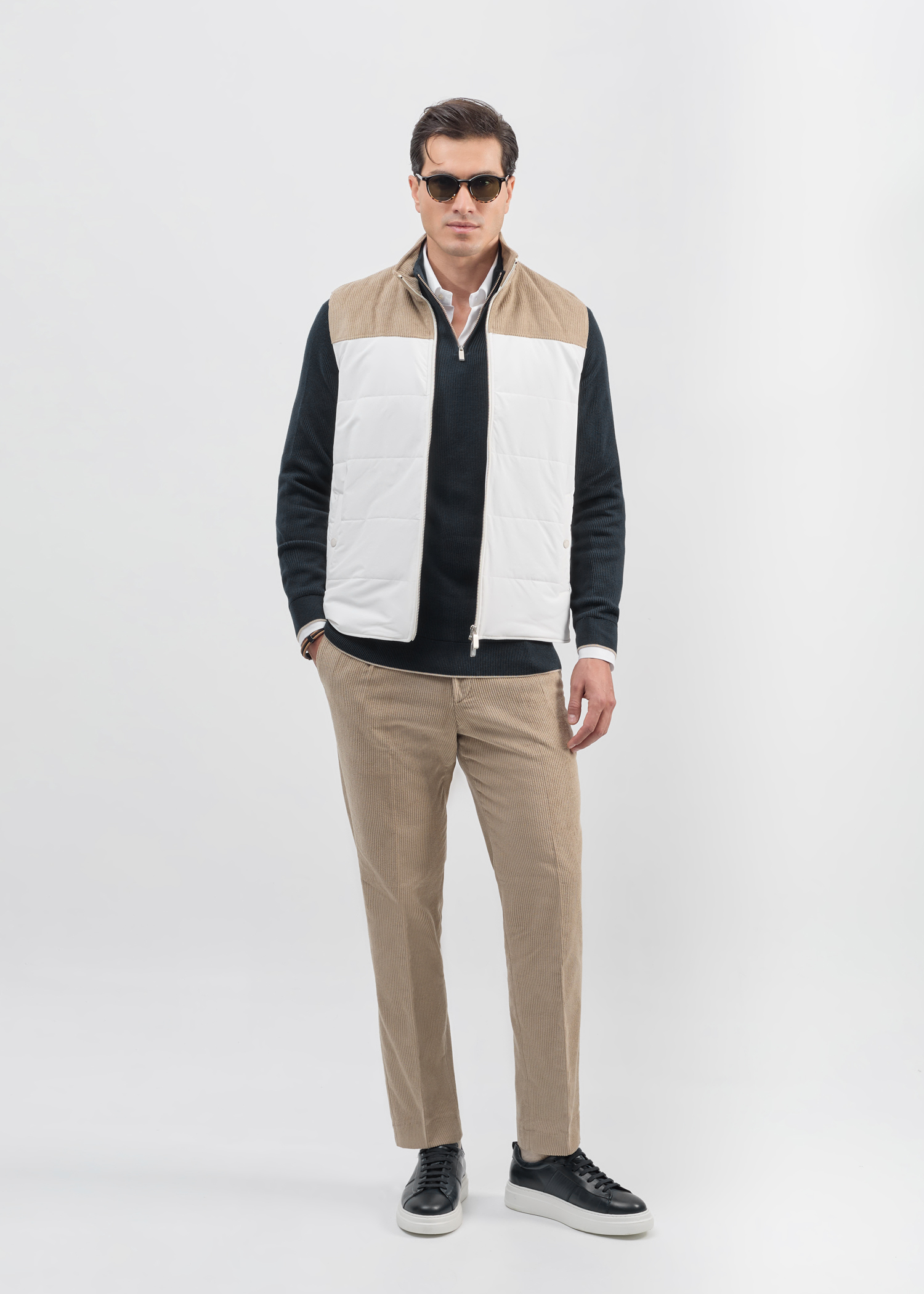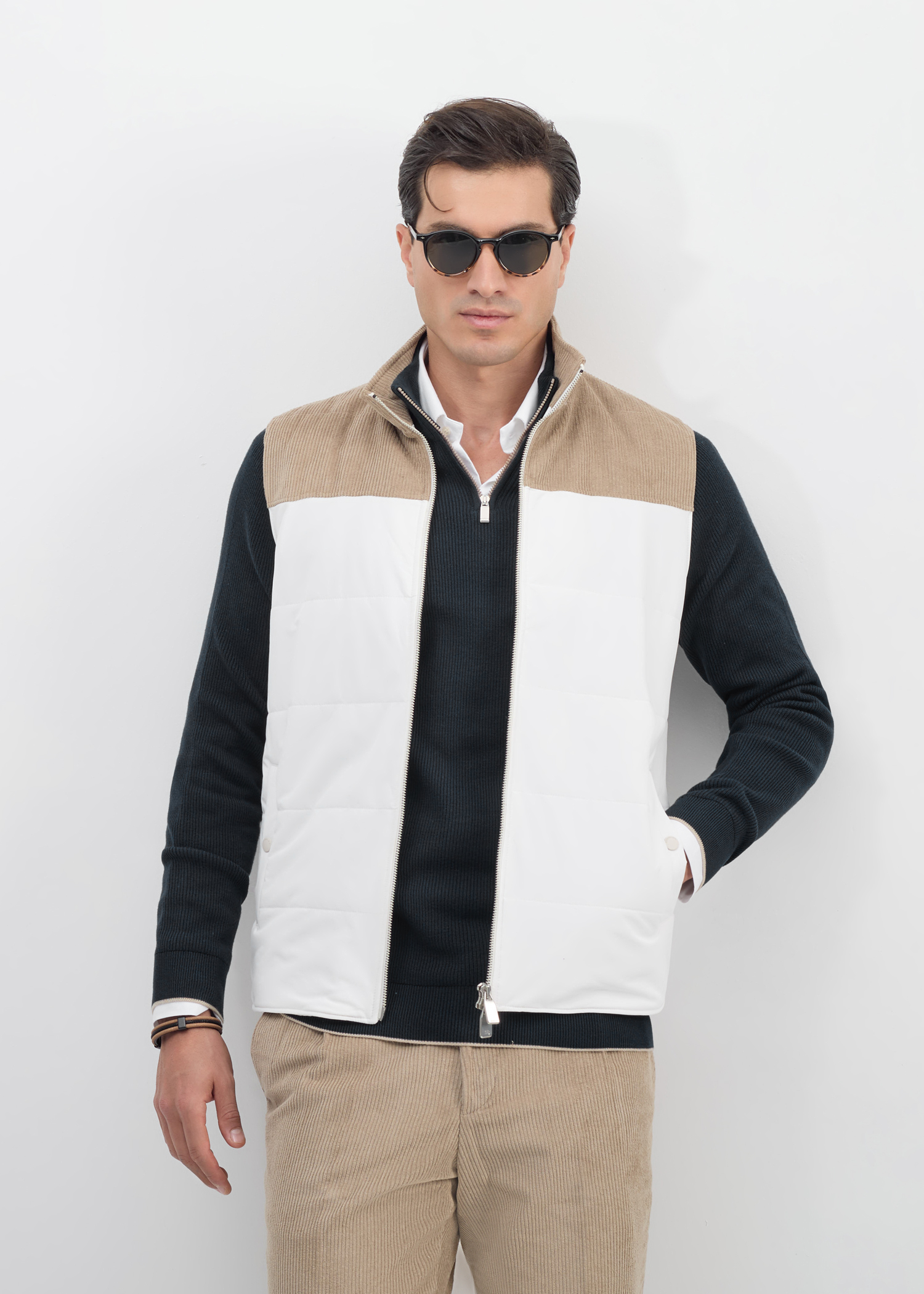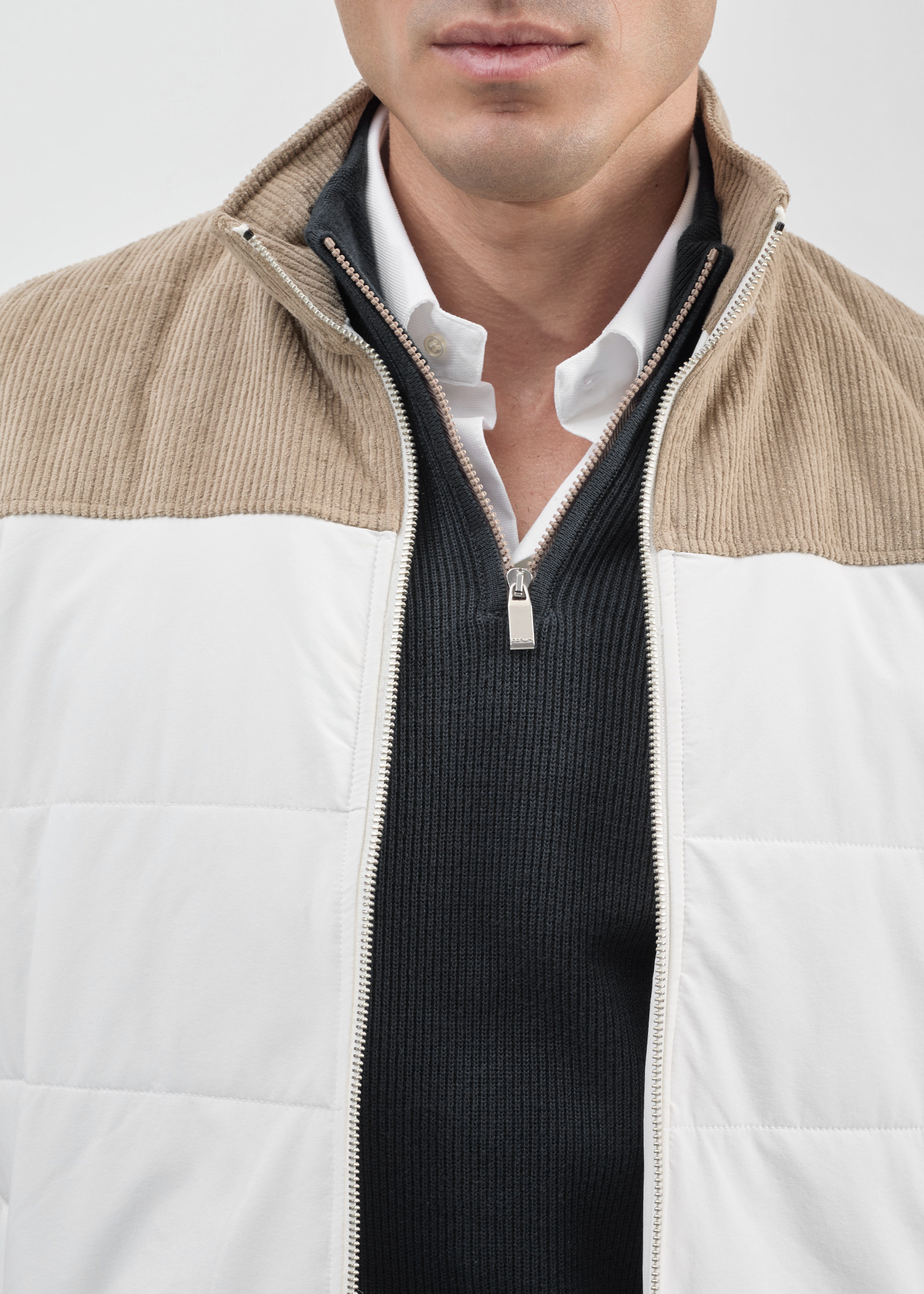 ژیله کاپشنی مردانه، پارچه و آستری داخلی ضد آب، تهیه شده از 100% الیاف پلی استر، دارای یک لایه پشم شیشه داخلی، دارای زیپ فلزی دوطرفه سرزیپ با پرداخت استیل ضد زنگ