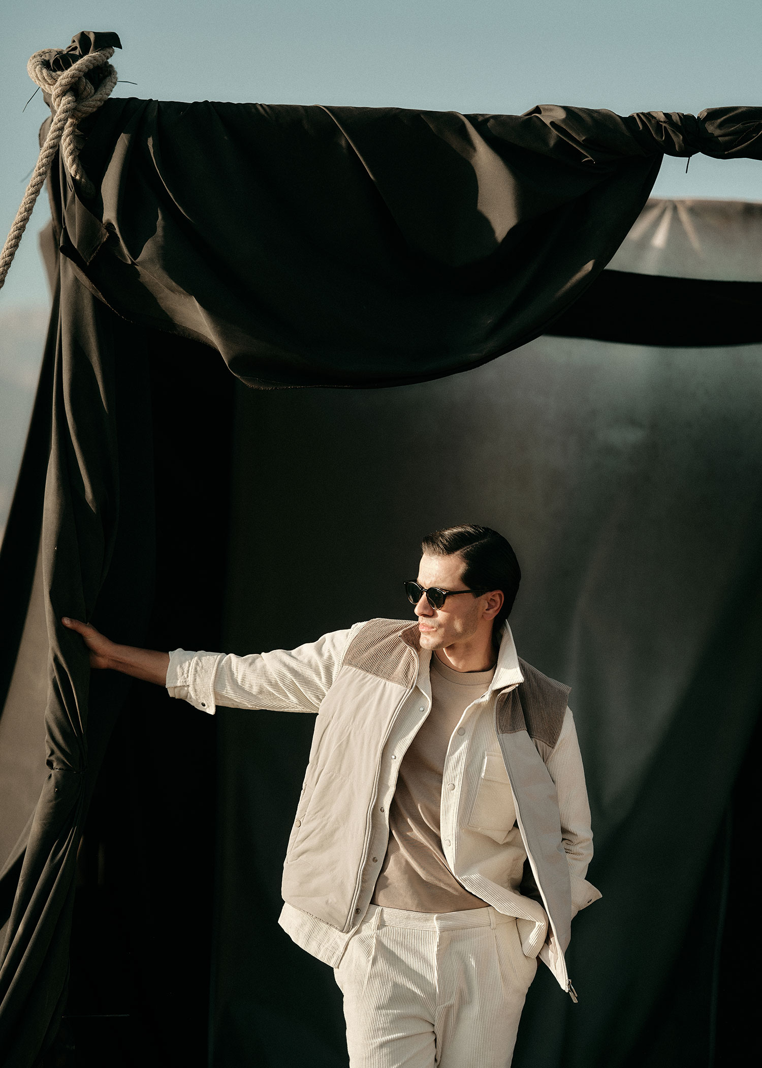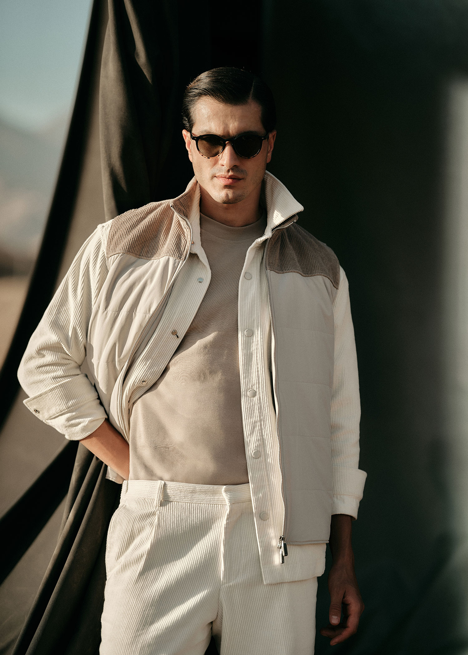 ژیله کاپشنی مردانه، پارچه و آستری داخلی ضد آب، تهیه شده از 100% الیاف پلی استر، دارای یک لایه پشم شیشه داخلی، دارای زیپ فلزی دوطرفه سرزیپ با پرداخت استیل ضد زنگ