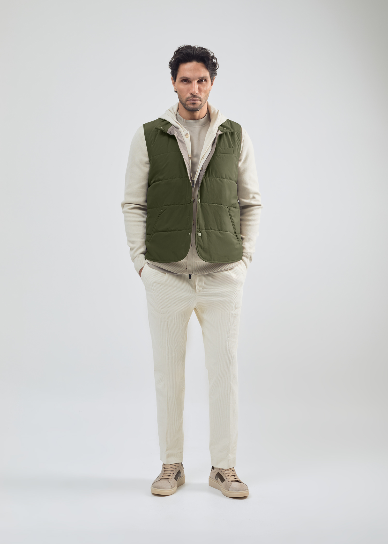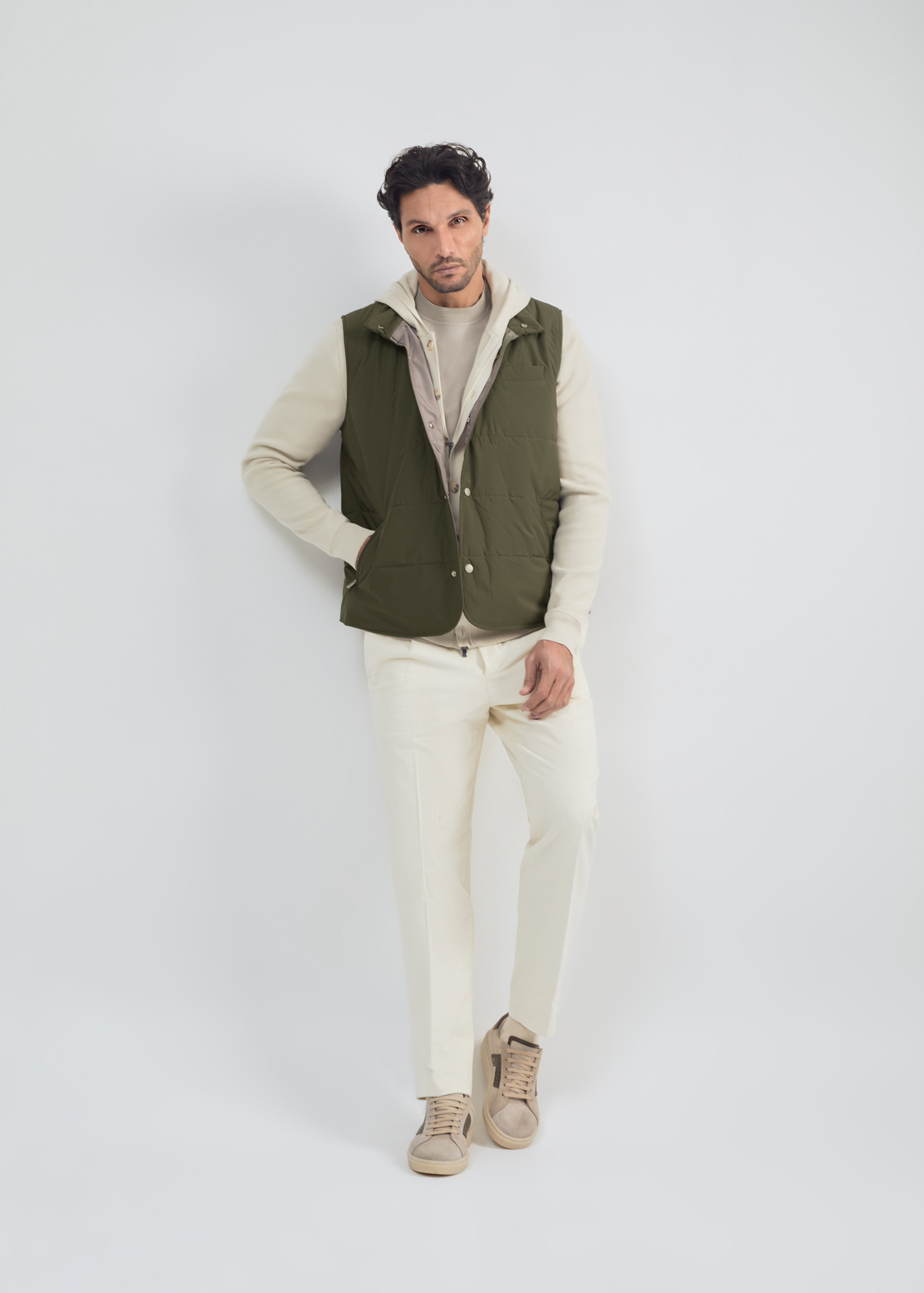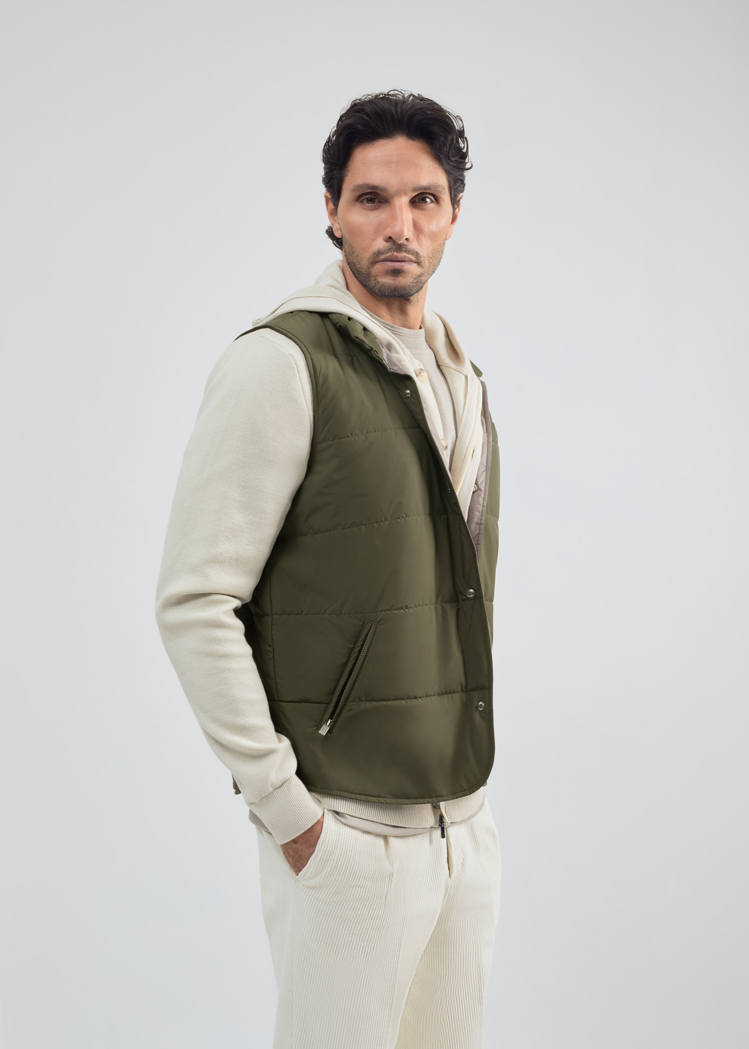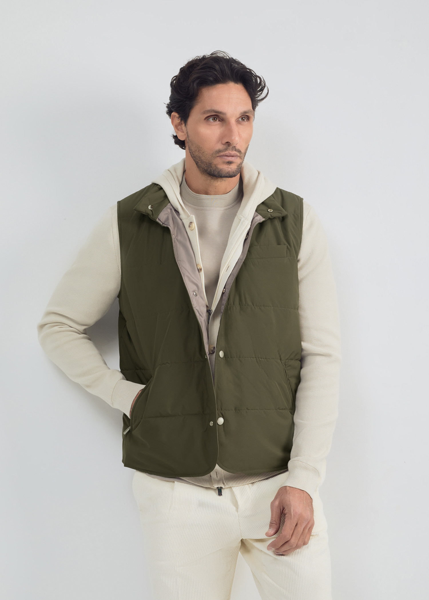 ژیله کاپشنی دکمه پرچی، الیاف بسیار سبک، پارچه ضد نفوذ آب و باد، دارای یک لایه پشم شیشه داخلی، آستر داخلی ضد آب، دارای سه جیب بیرونی و یک جیب داخلی