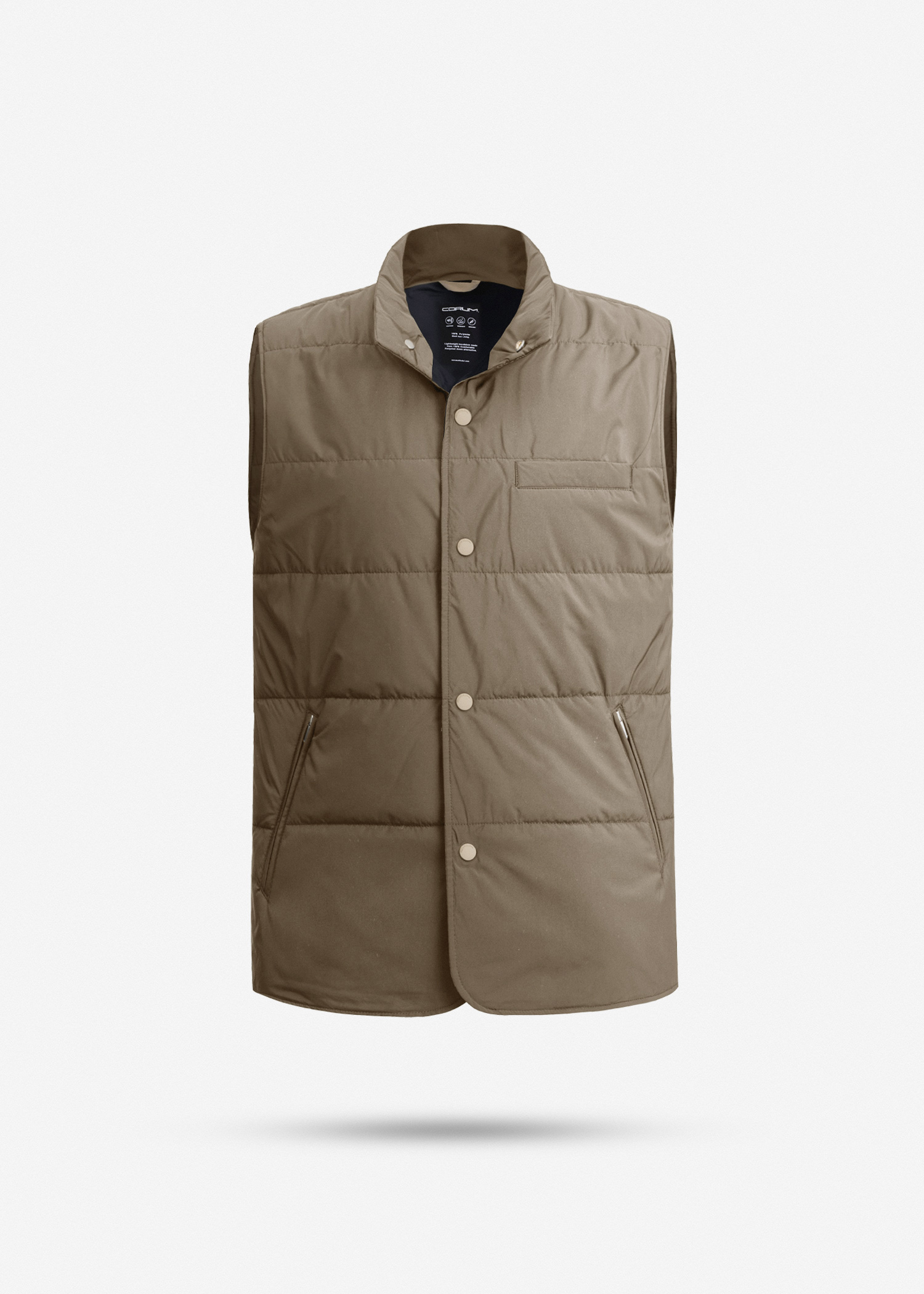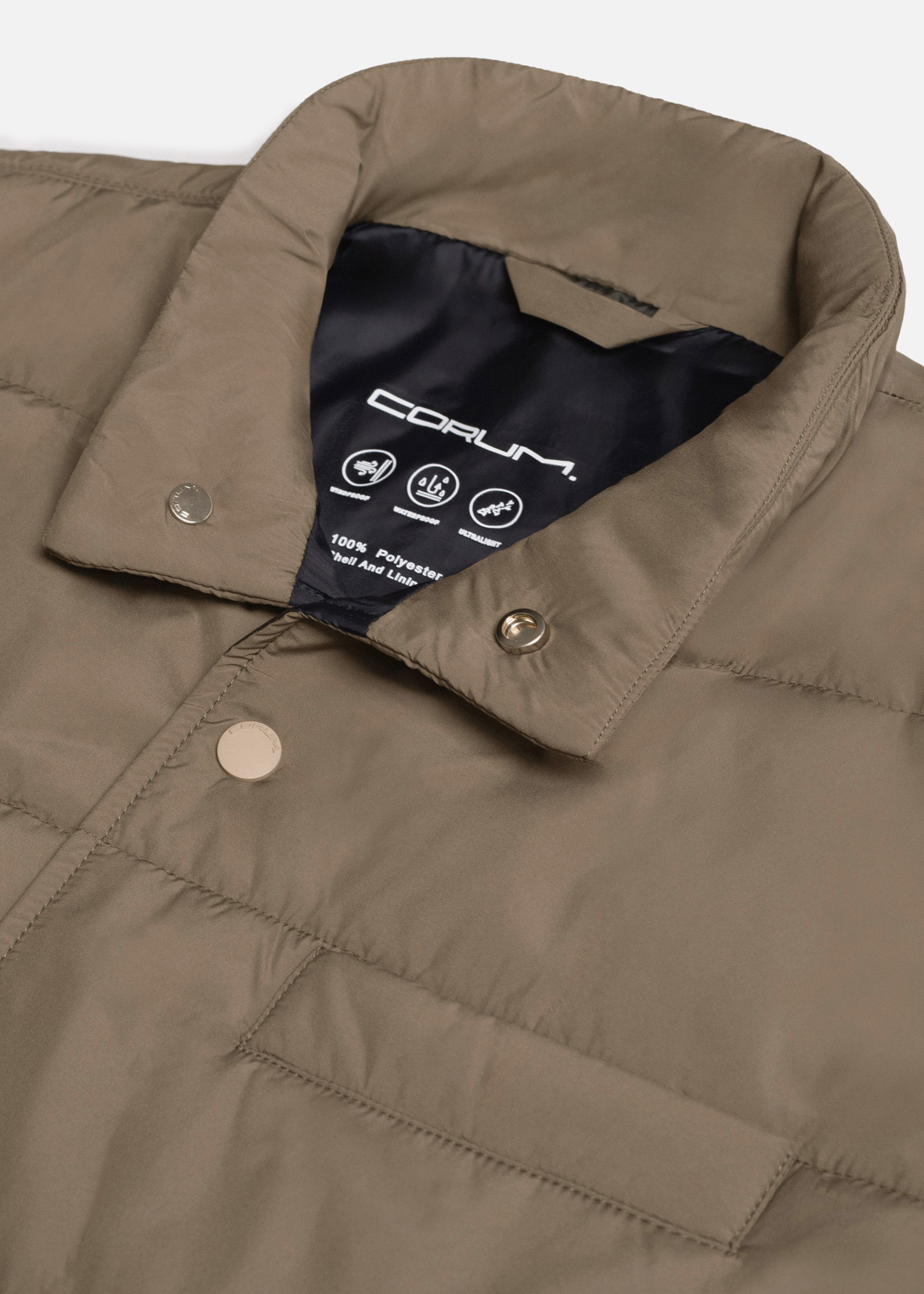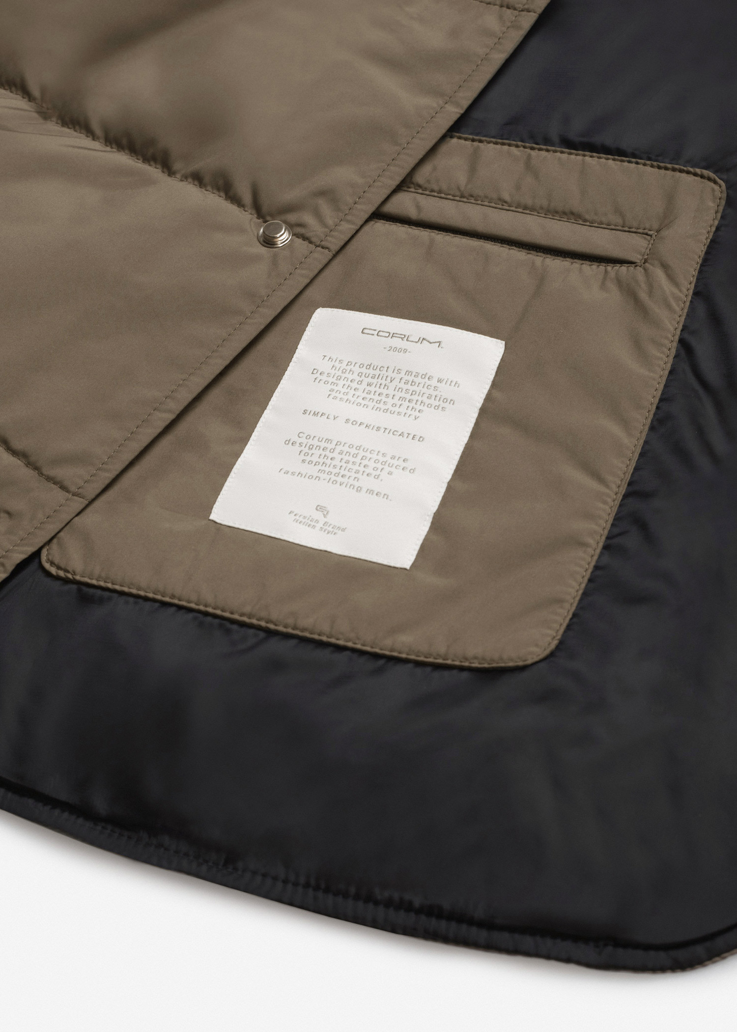 ژیله کاپشنی دکمه پرچی، الیاف بسیار سبک، پارچه ضد نفوذ آب و باد، دارای یک لایه پشم شیشه داخلی، آستر داخلی ضد آب، دارای سه جیب بیرونی و یک جیب داخلی